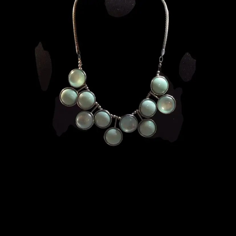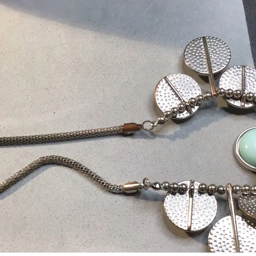 A light blue bib statement, necklace with acrylic or glass cabochons set in a silver tone metal. Adjustable, chain and lobster clasp. Some metal wear on clasp and chain.
