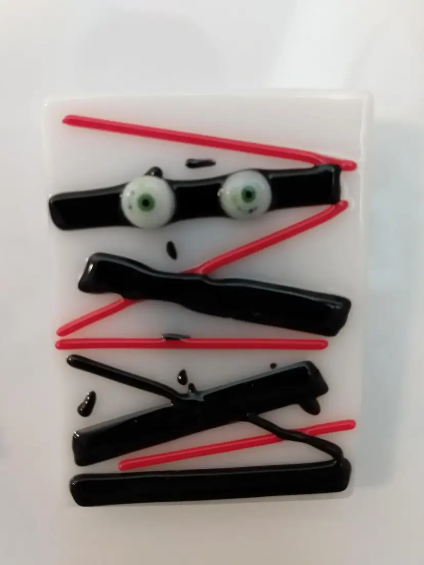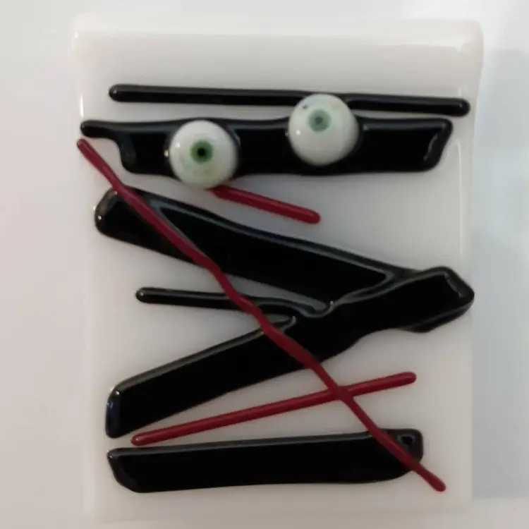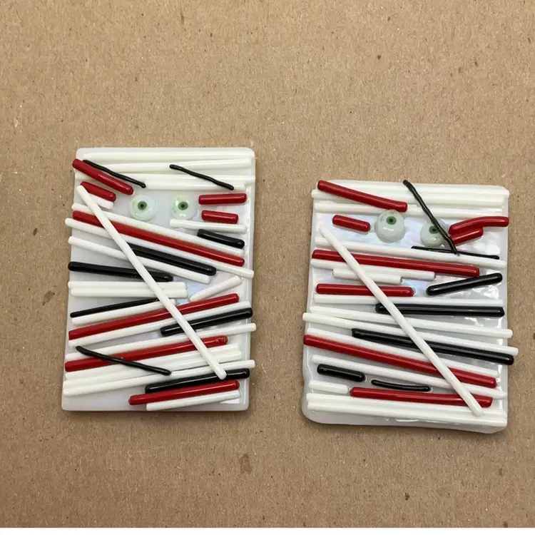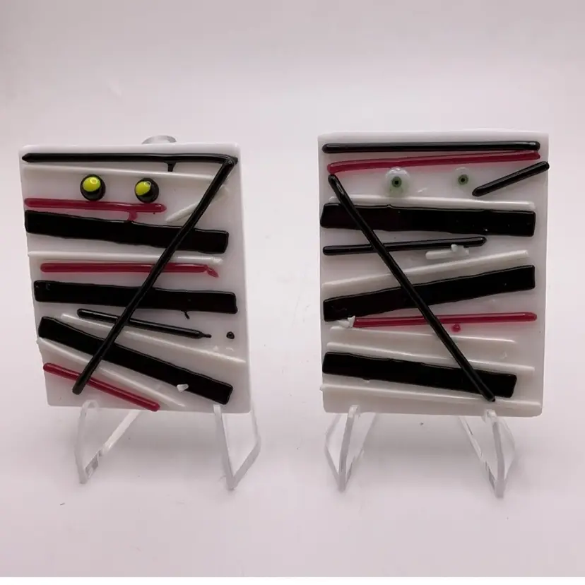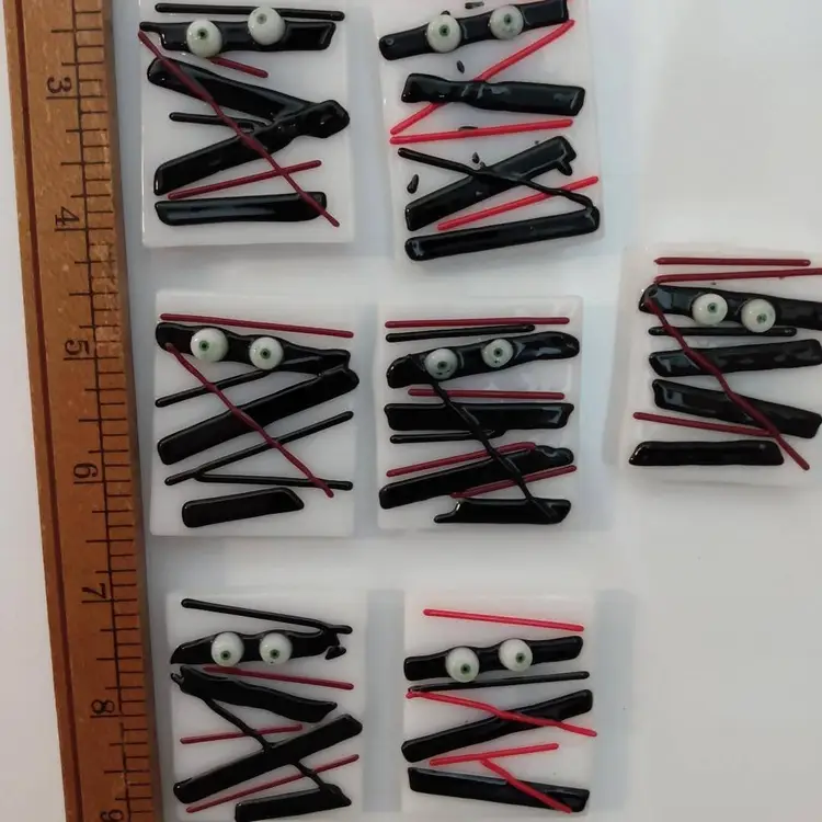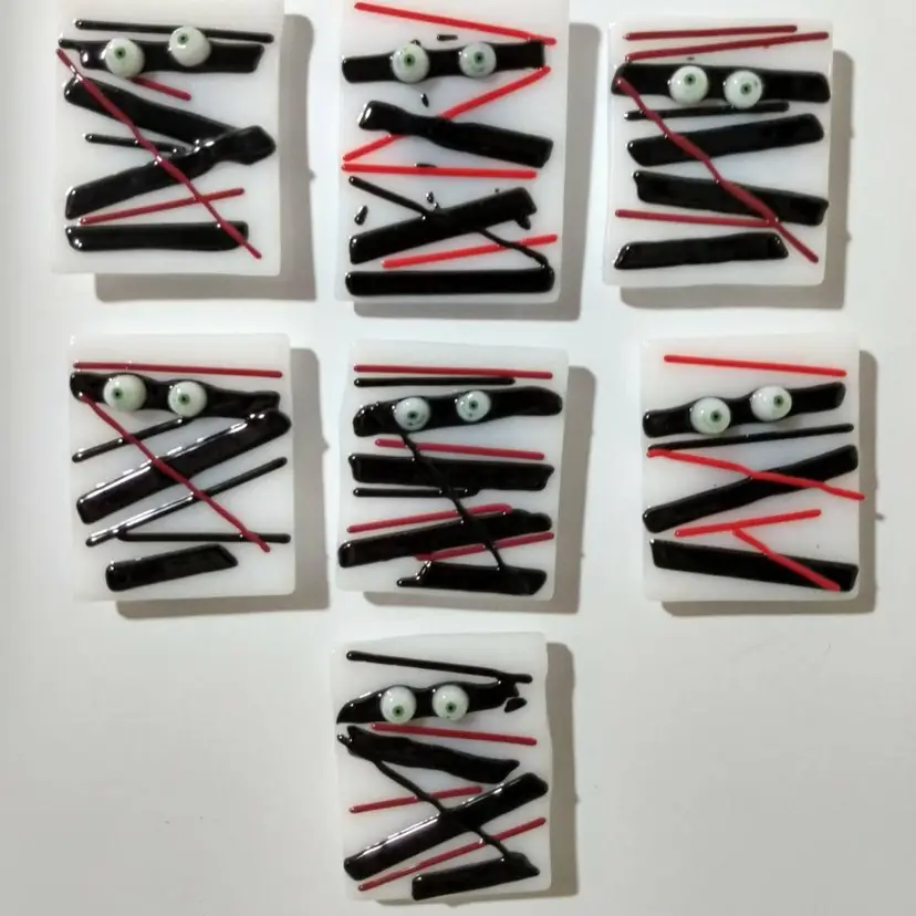 Small, fused glass mummies, kiln made with love by me! Each mummy is unique and varies in color placement, bubbles and depth of field. Sizes vary as shown in last pic with ruler. Made with Bullseye glass and eye elements from seller ArrowrootArtsGlass.
