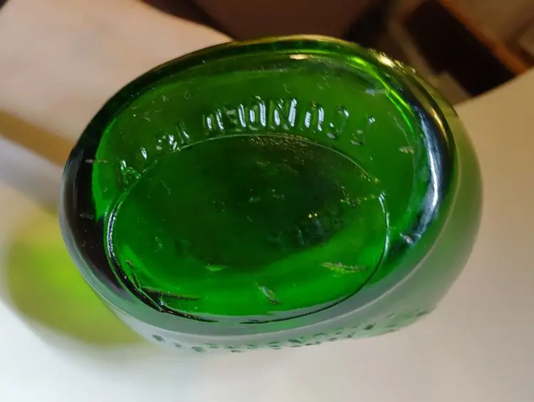 This beautiful green translucent glass bottle was produced by Clarence & Bob Maul Bros Inc in 1972, in Millville NJ. The bottle is a unique addition to any collection, with its striking green color and intricate design. Made in the United States, it showcases the craftsmanship of American glassmakers. This collectible bottle is a perfect addition to your collection of modern bottles and insulators. Its vibrant green color will catch your eye, making it a statement piece in any room. The detailed design adds a touch of elegance to the bottle, making it a must-have for any collector. Don't miss out on the opportunity to add this piece of American history to your collection.