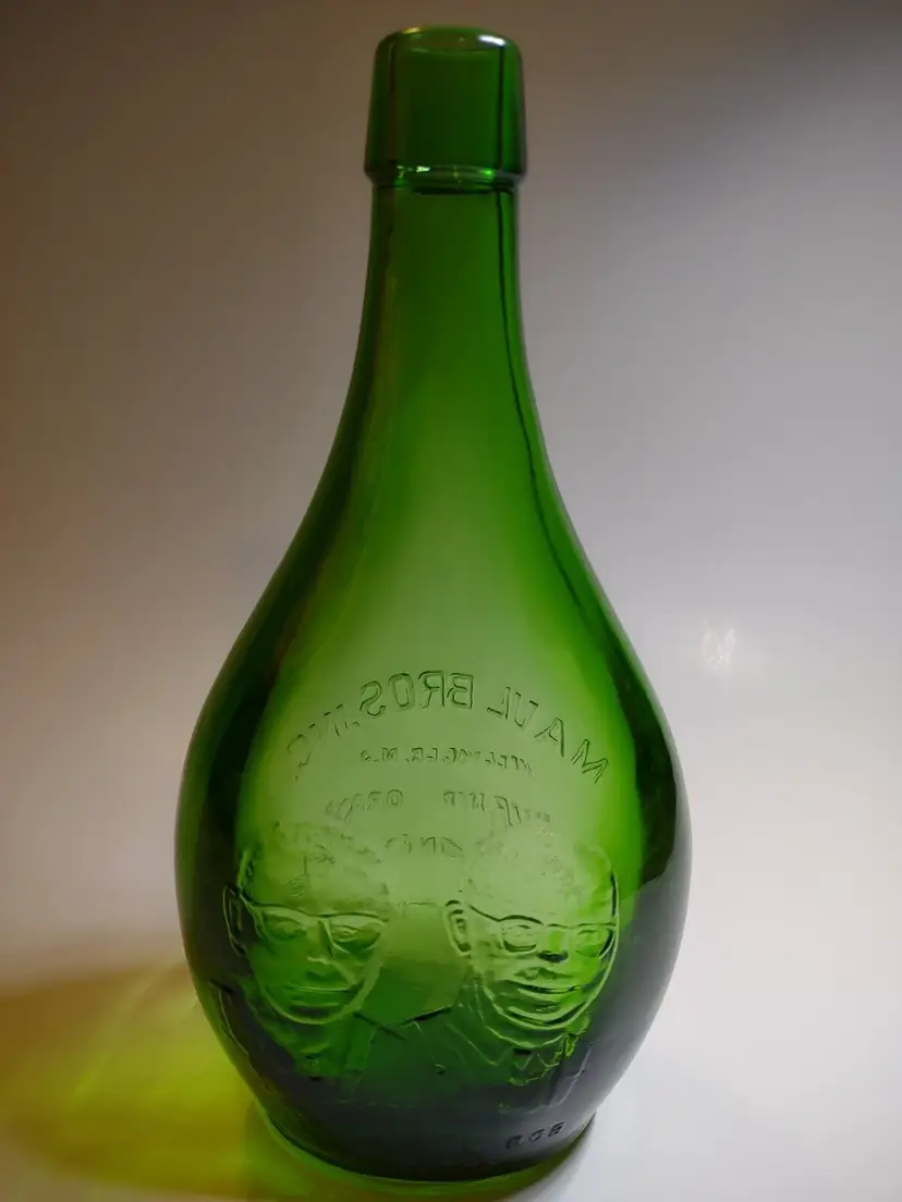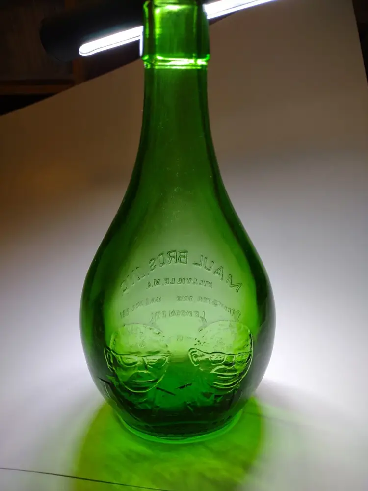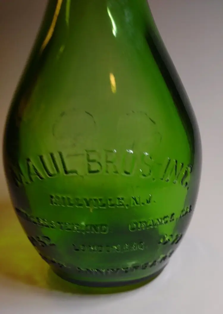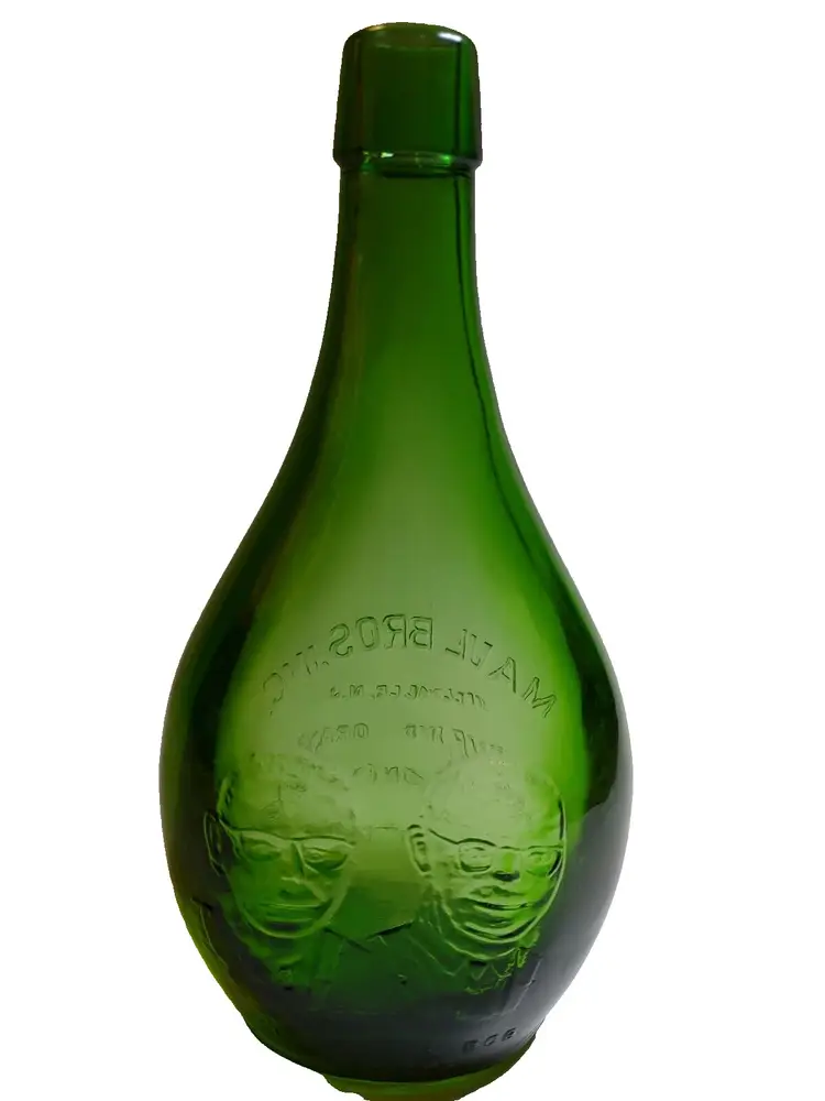 Vintage green translucent glass bottle. Made by Maul Bros in Millville New Jersey. Special 20th anniversary bottle made in 1972. Excellent clean condition. Size is 9" tall and 4.5" wide.