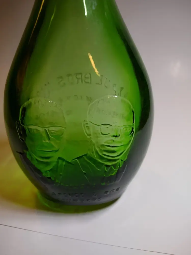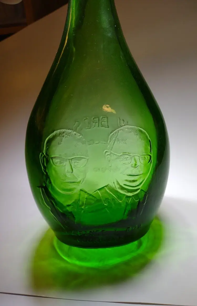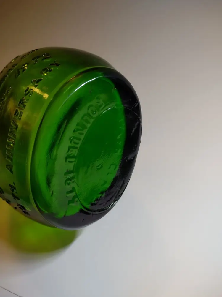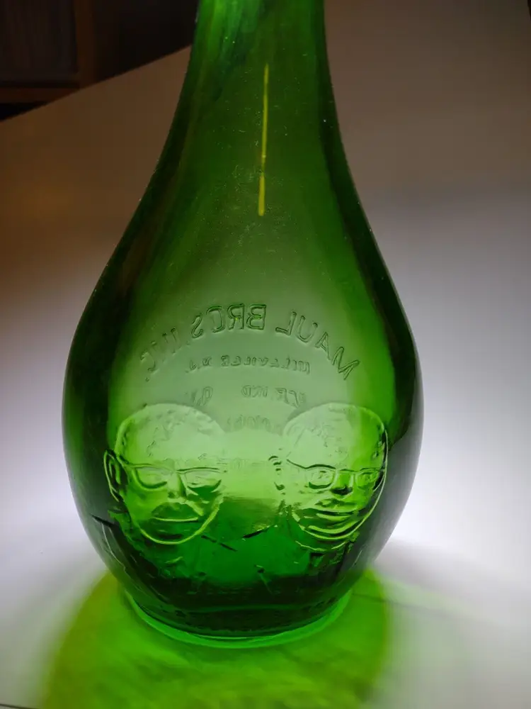 Vintage green translucent glass bottle. Made by Maul Bros in Millville New Jersey. Special 20th anniversary bottle made in 1972. Excellent clean condition. Size is 9" tall and 4.5" wide.