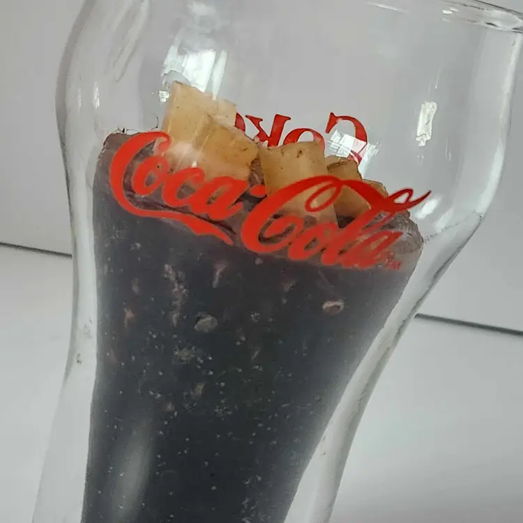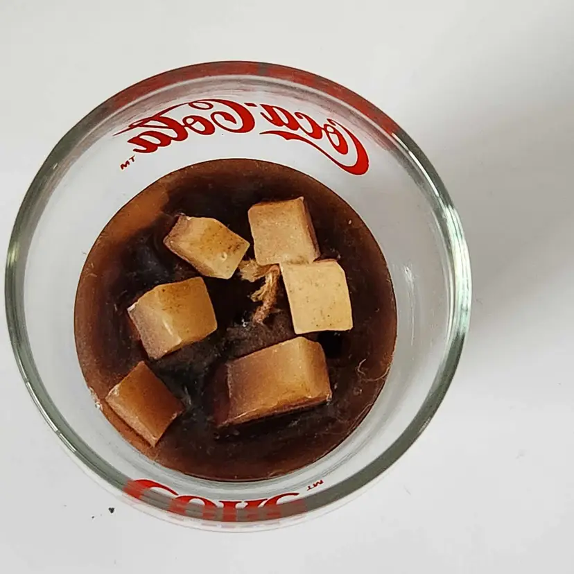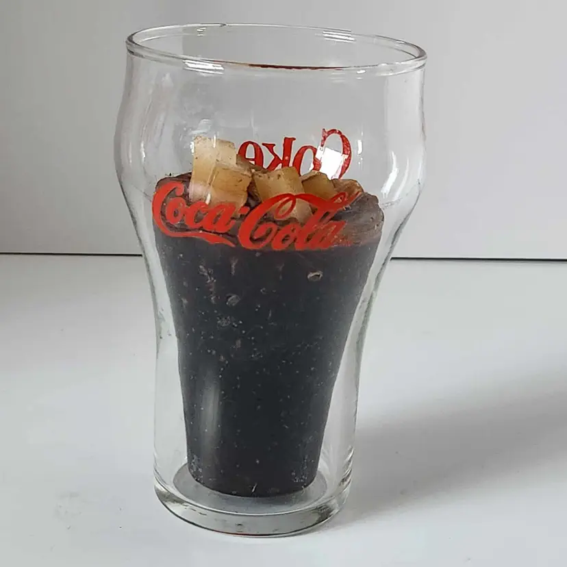 Coca-Cola soda glass with soda-look alike unburned candle w/ ice. Candle pops out easily if you just like the glass. Base is 2" in diameter, top is 3" in diameter, and height is approximately 7".