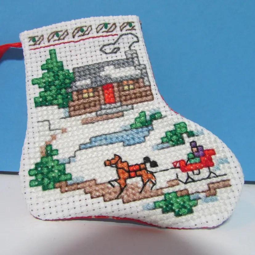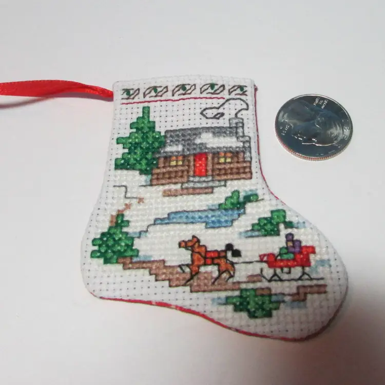 #01 completed handmade cross stitch small Christmas stocking ornament winter scene