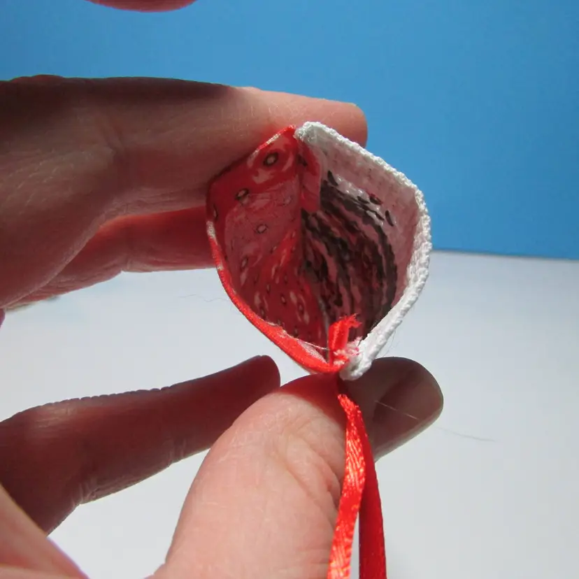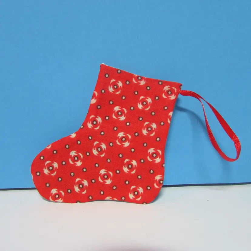 This adorable ornament was stitched by mom, she added some vintage fabric to the back. This little stocking does open so you can add a small gift. It is about 3" x 3". This is shipped from a smoke free home. Thanks for looking!