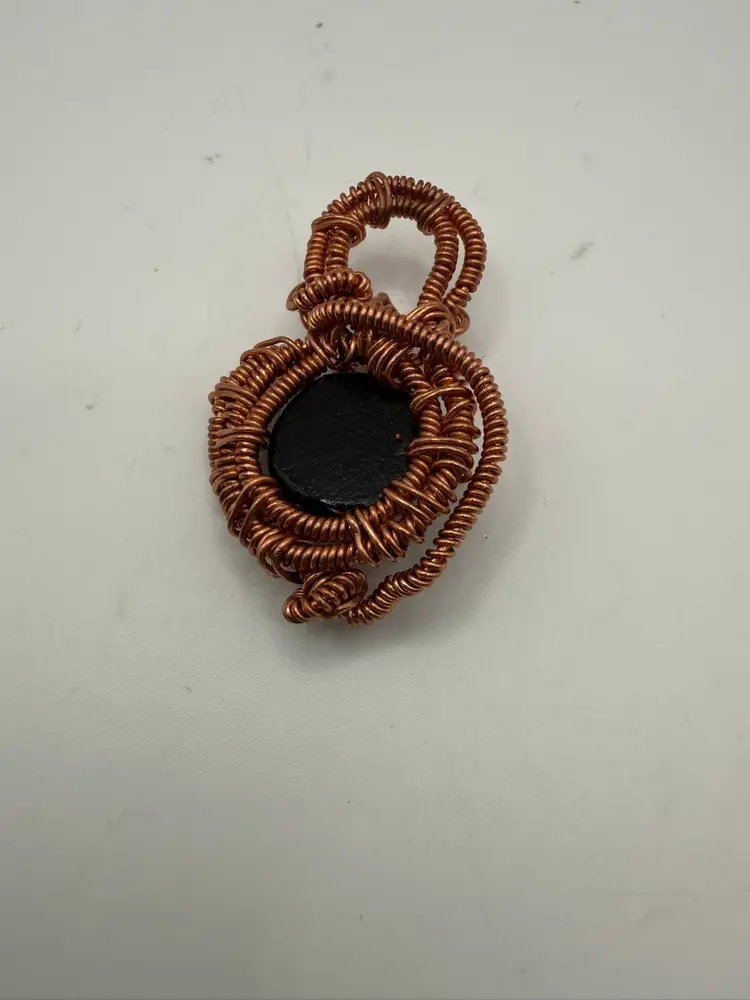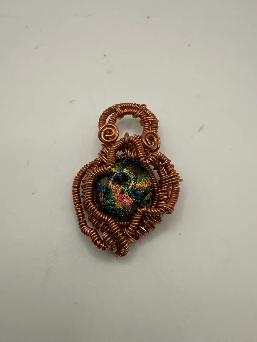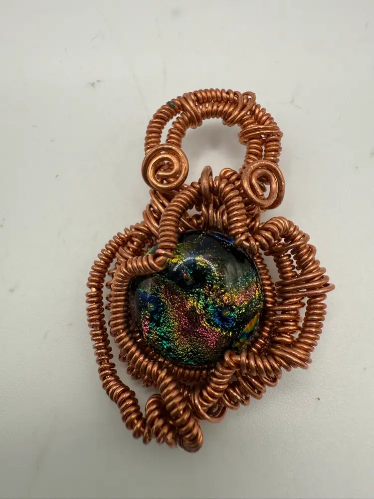 Purchased from SilverShoals, this dichroic glass is fun and funky. Wire wrapped in copper and added patina with museum wax to protect it. This piece measures 3”