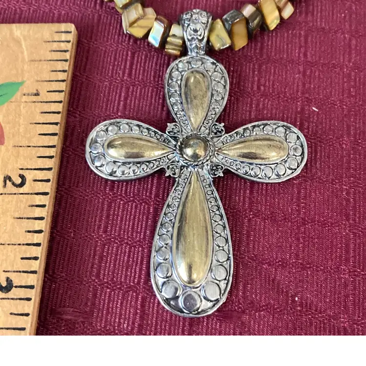 Vintage cross necklace, silver, and gold tone pendant measures a little over 3 inches. Necklace is 16 inches with 3 inch extension and lobster claw class beautiful preowned condition.