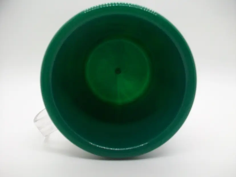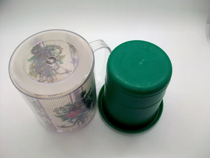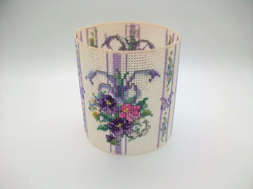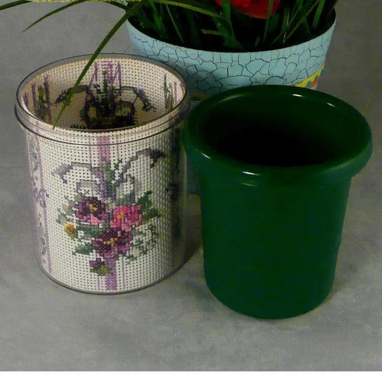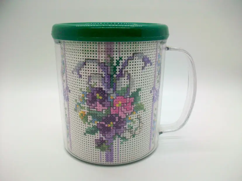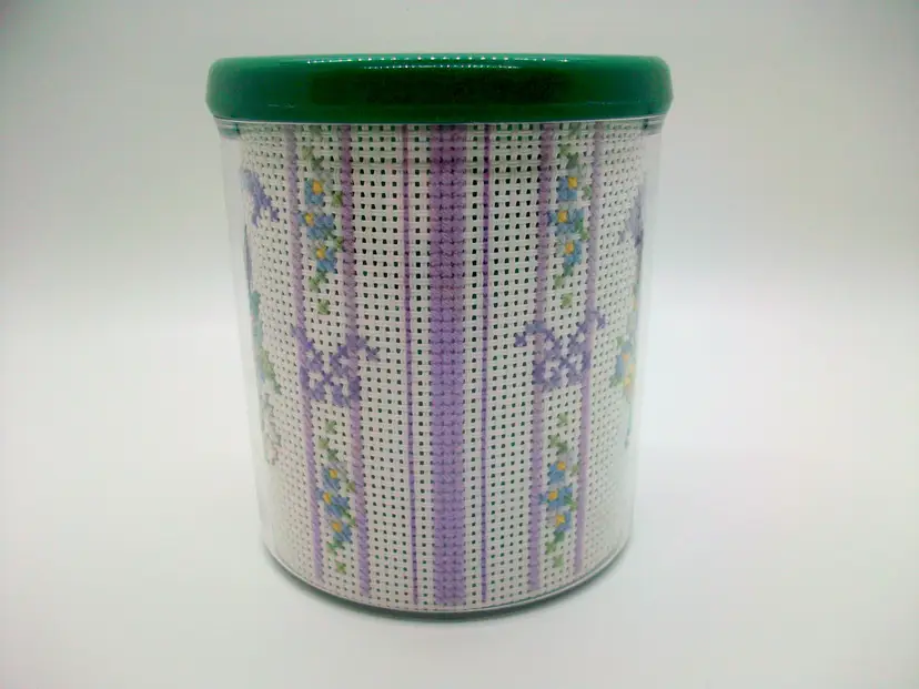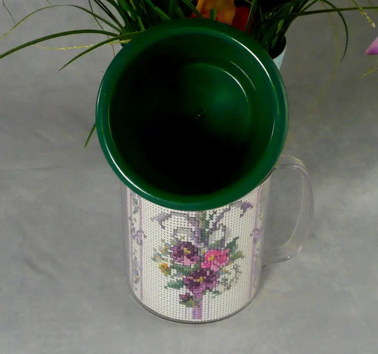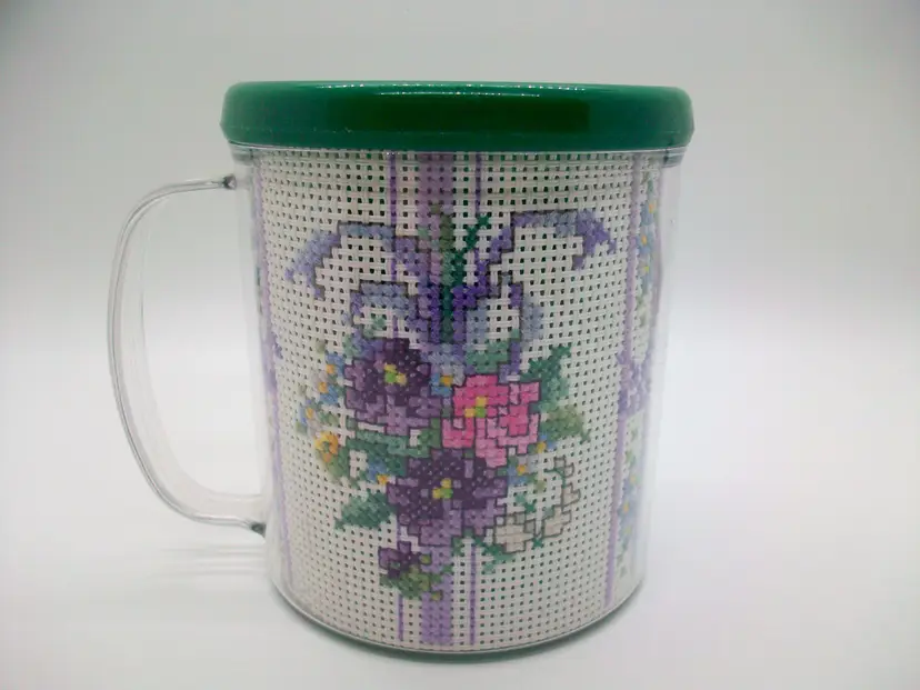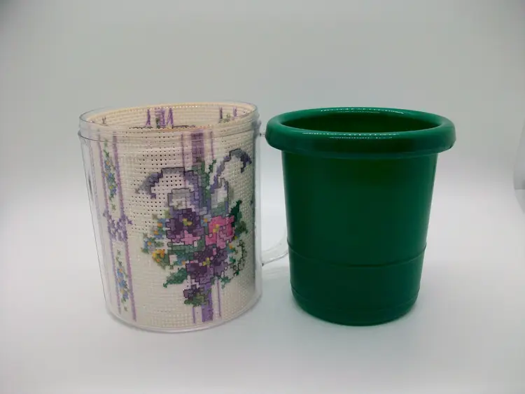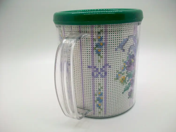 Clear plastic outer cup with green plastic insert Stitched on vinyl aida cloth cup easily snaps apart for easy cleaning measures 4" tall x 3 1/2" wide.