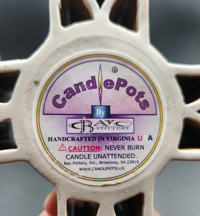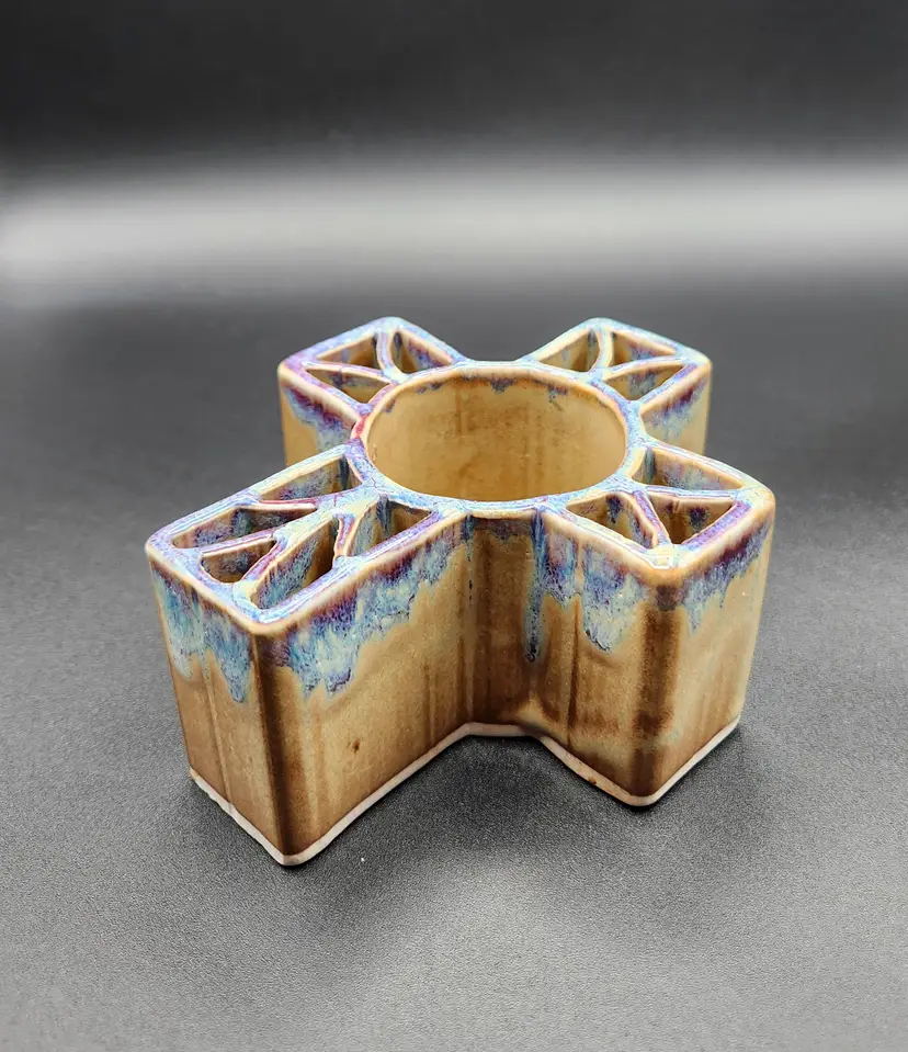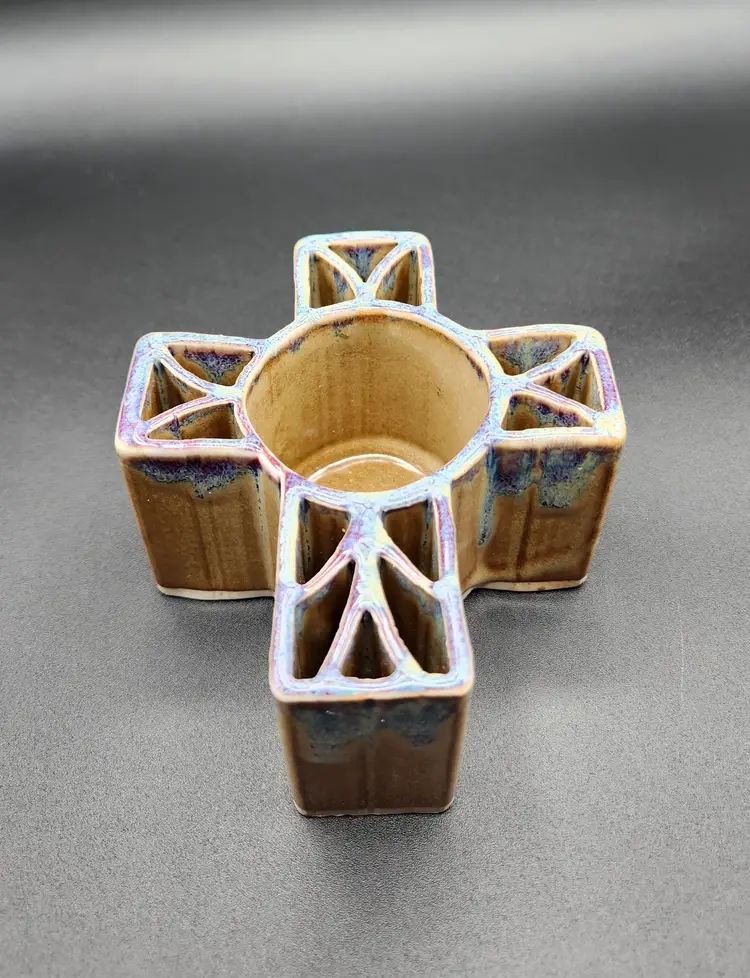Candle Pot, Bay Pottery ceramic cross Votive Candle Holder handcrafted in Virginia with blue drip glaze. Measures approx. 4.5 H x 4 W x 2.25