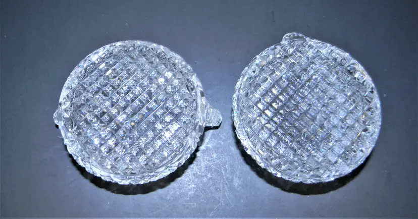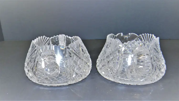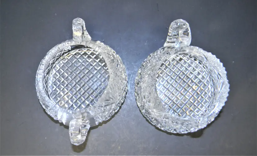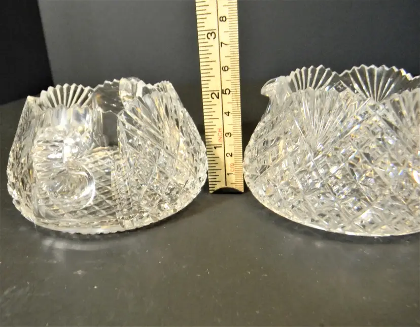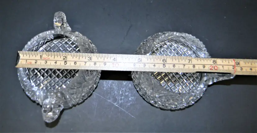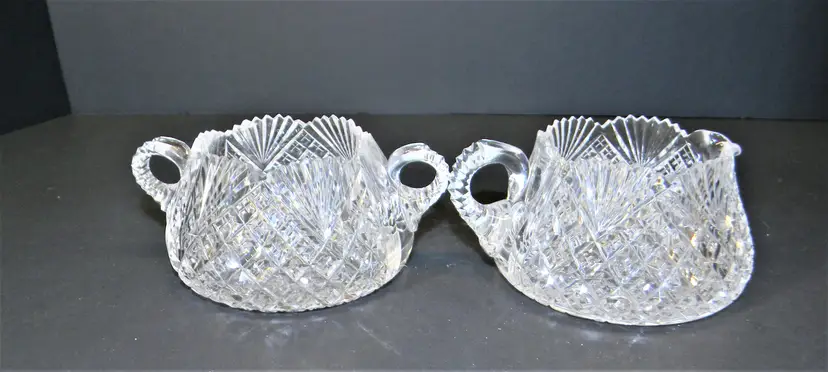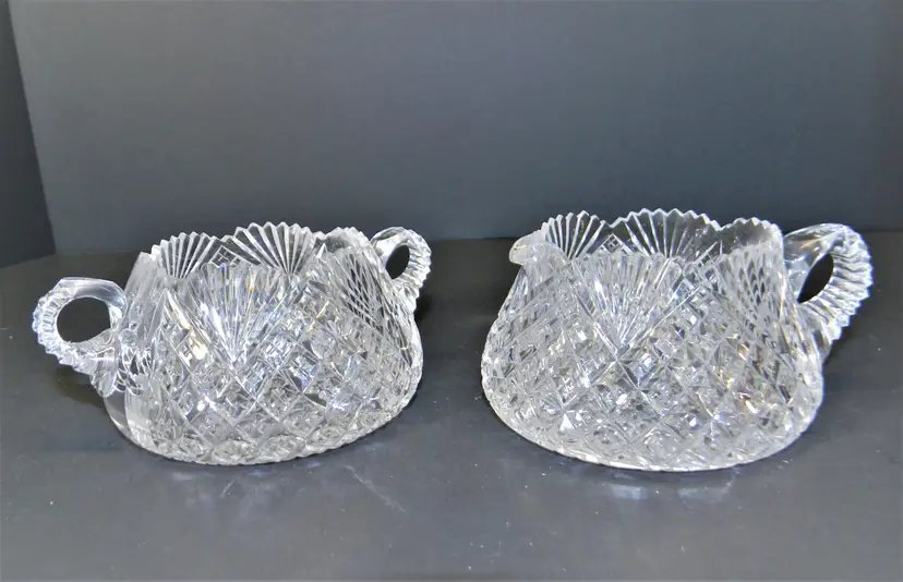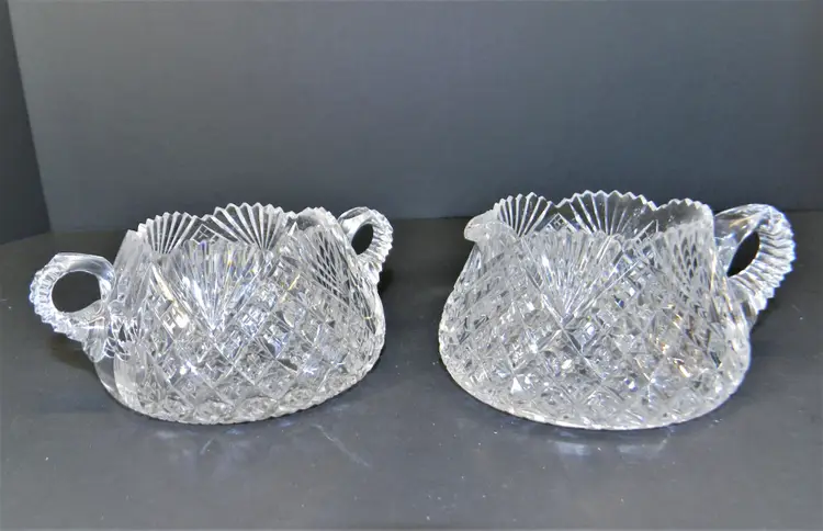 American Brilliant Cut Glass Sugar and Cream Dating back to the late 19th to early 20th century. Hand Blown & Hand Cut designs and high-quality crystal, complex geometric patterns, variety of cuts. researching this I found that there are many patterns like hobstars, pinwheels, and fan patterns. No chips or cracks, Heavy These are so beautiful in person. Would make a wonderful collection. Measurement 2 1/4 inches tall approx. Used Condition