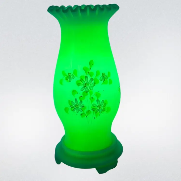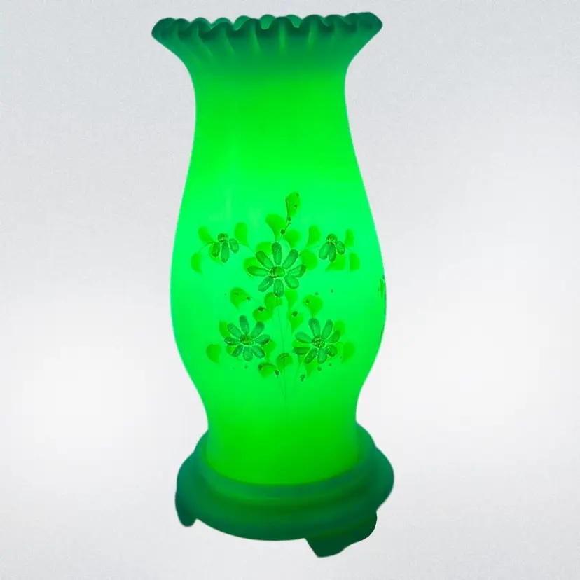 Featuring a footed base and a pie crust rim. Glows with a black light and is stunning. This lamp is discontinued and was produced from 1975-1981. Hand painted by Sue Foster. Very nice condition!