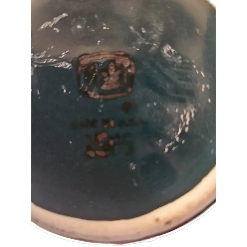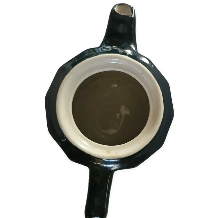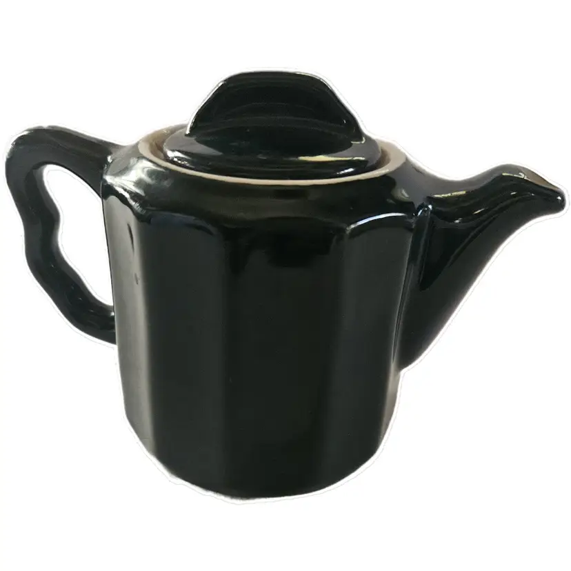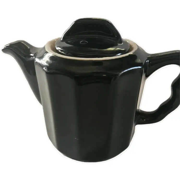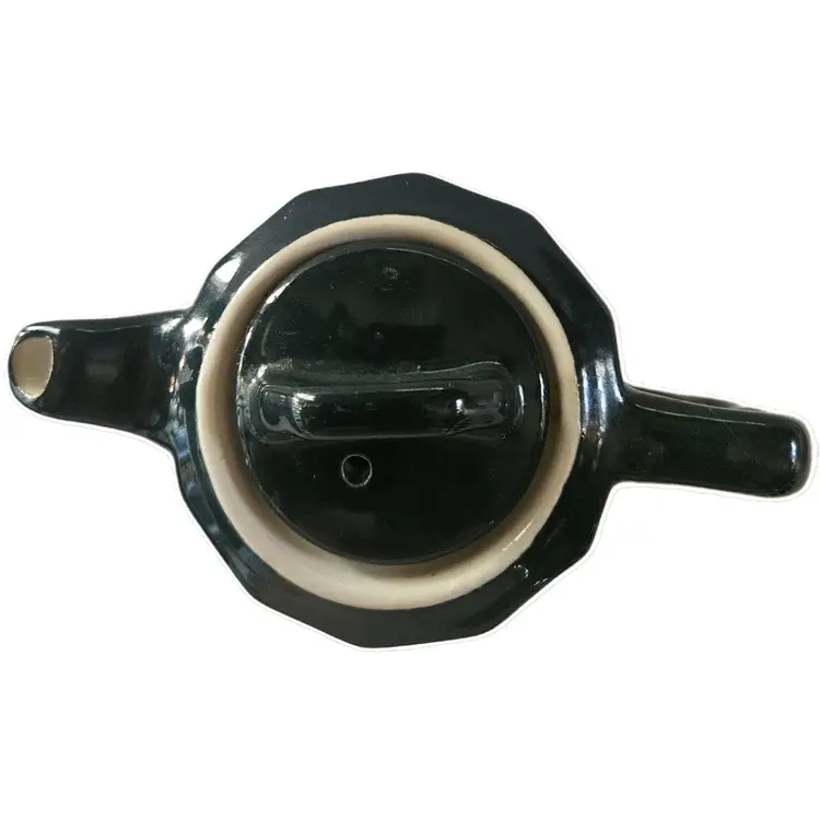 Emerald green porcelain teapot, looks darker in photos. Hard to read the stamp on the bottom, other than Made in the USA. Very good condition, no chips or cracks.