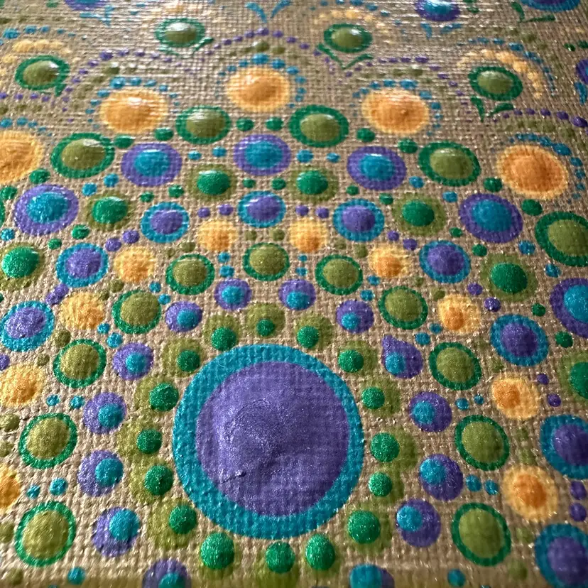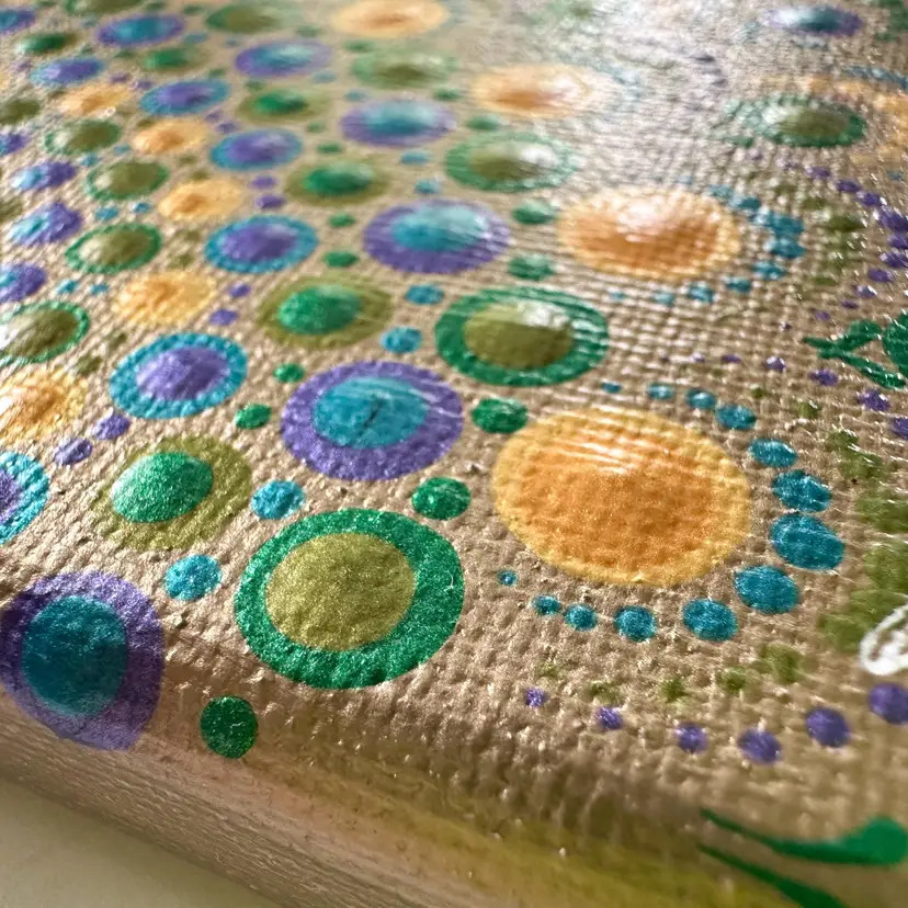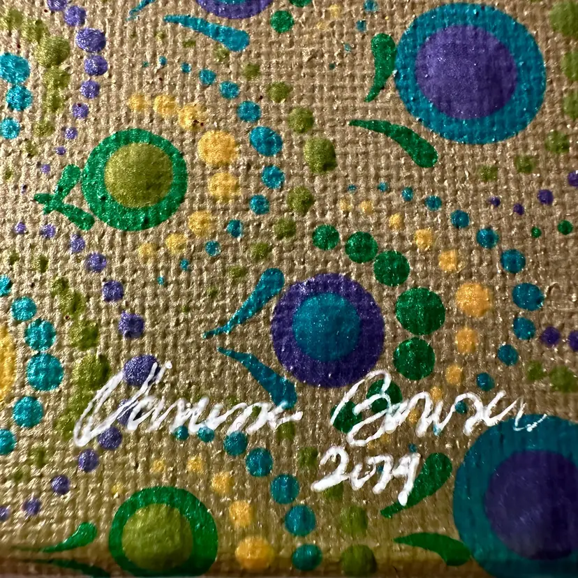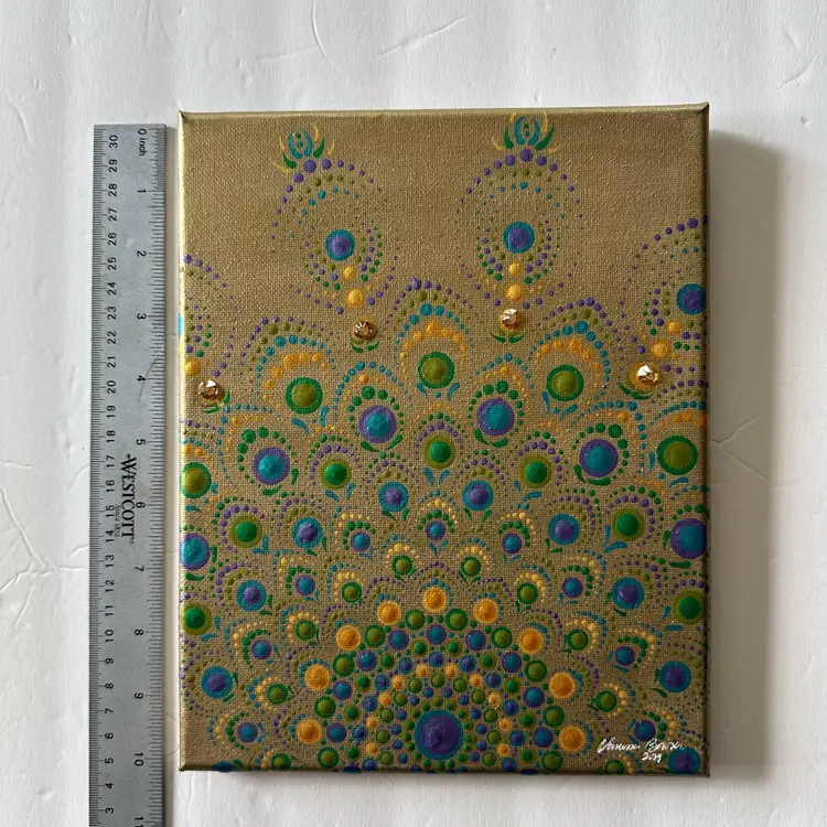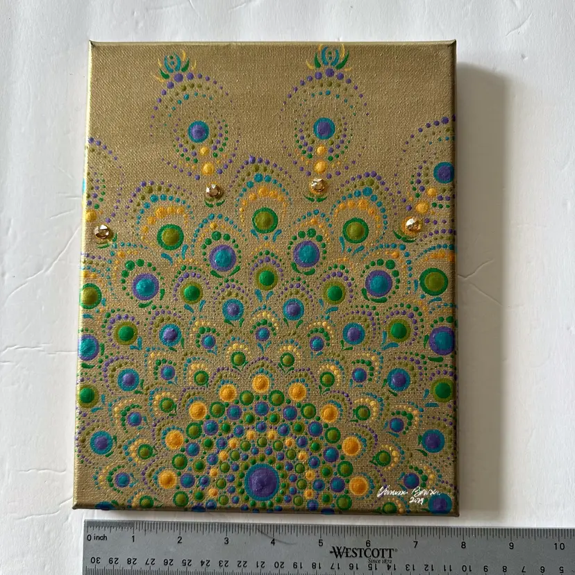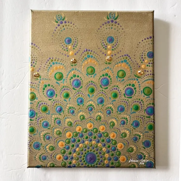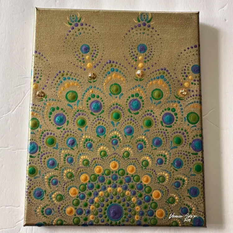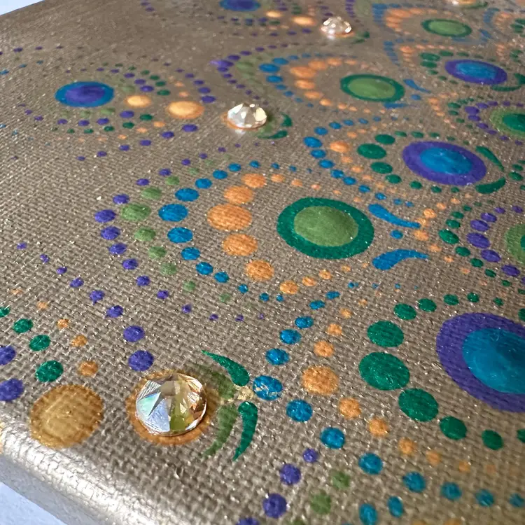 Gold background with green and blue Swarovski crystal accents Acrylic on canvas 8" x 10" Sawtooth hanger