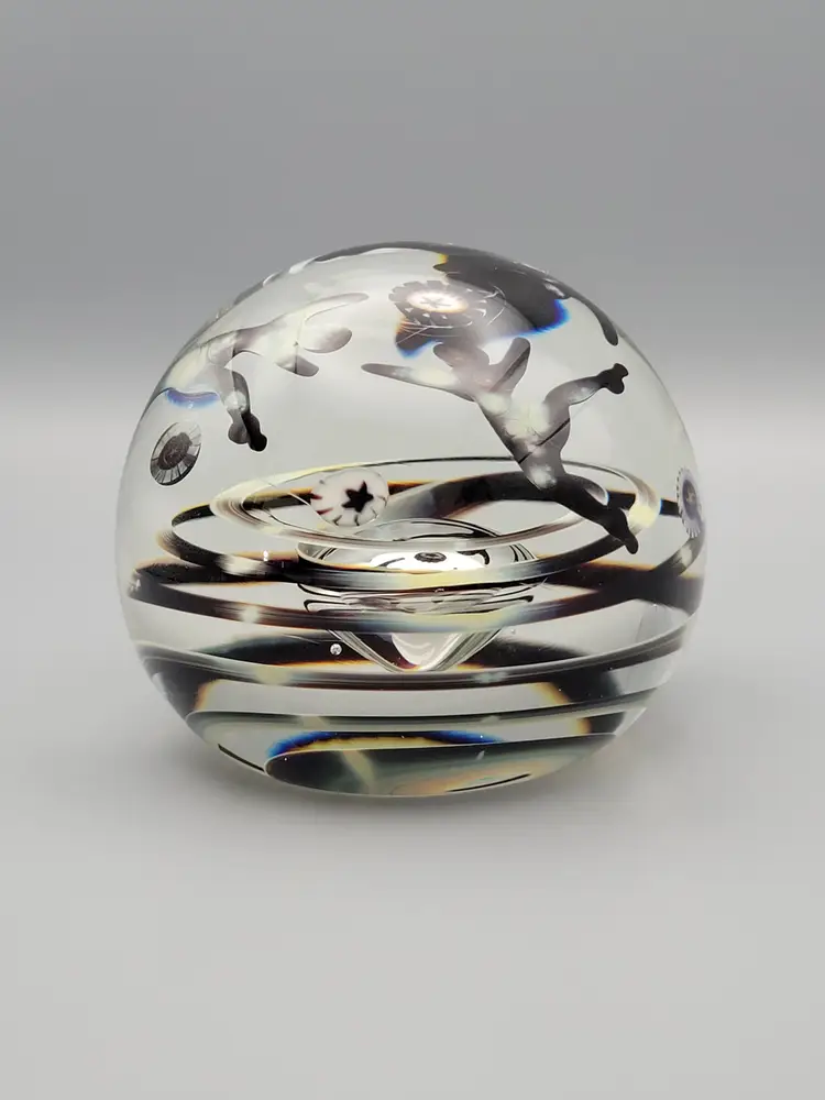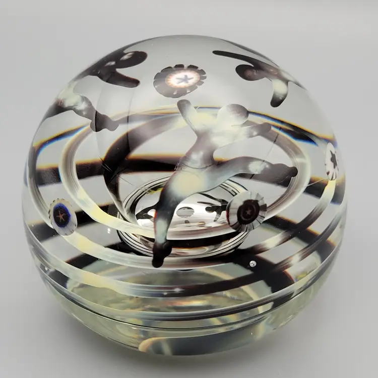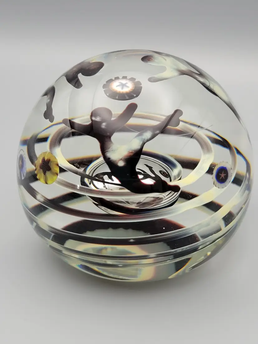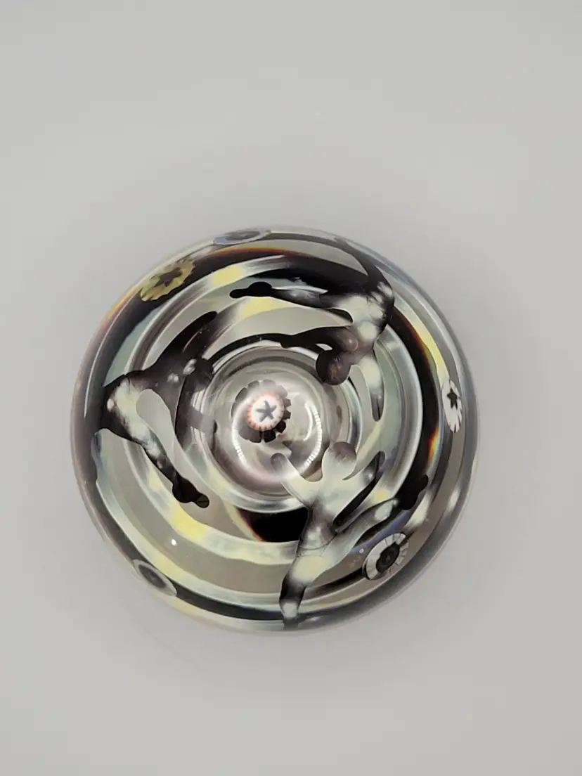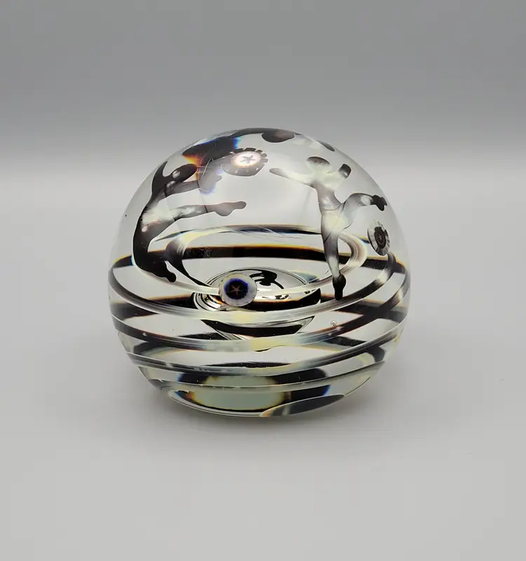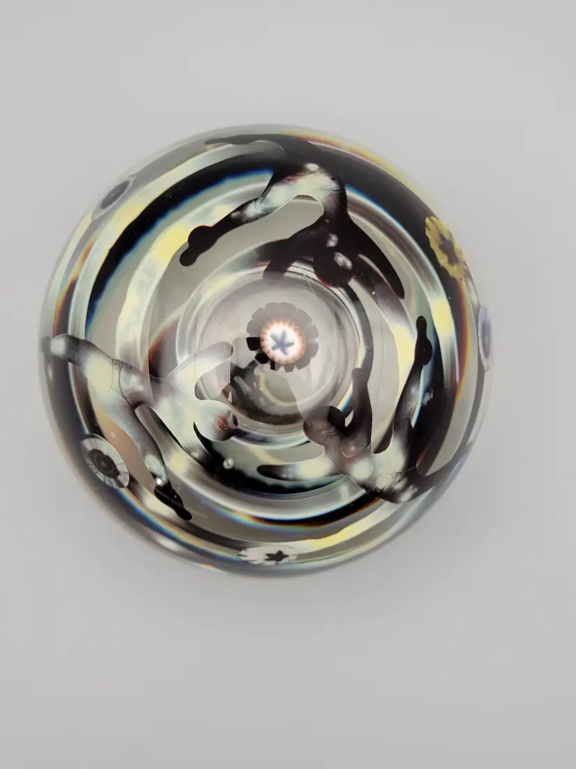 Elodie Holmes is the owner and head artist at Liquid Light Glass. Her signature series inspired by the movements of Taiko drummers. This paper weight has flame-worked dancers with colorful disks of glass cane and a cone shaped air bubble in the center of a beautiful swirl of ivory and black. It is in pristine condition. It is 3 inches wide and 2.5 inches tall. Shipping has been included in price. Thank you for looking and have a great day!