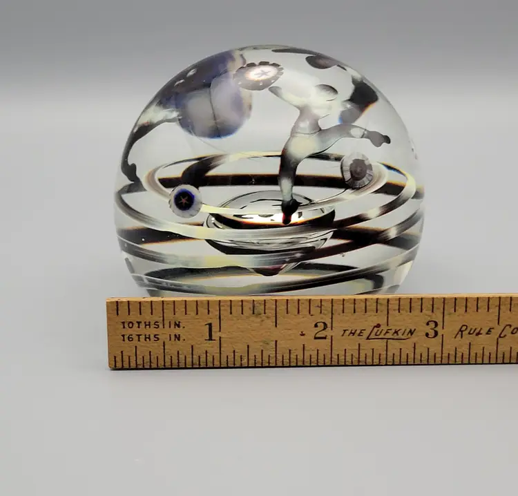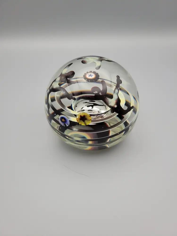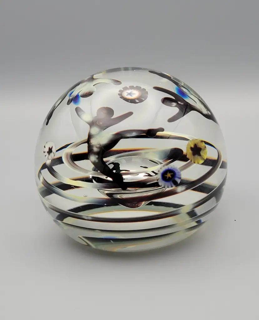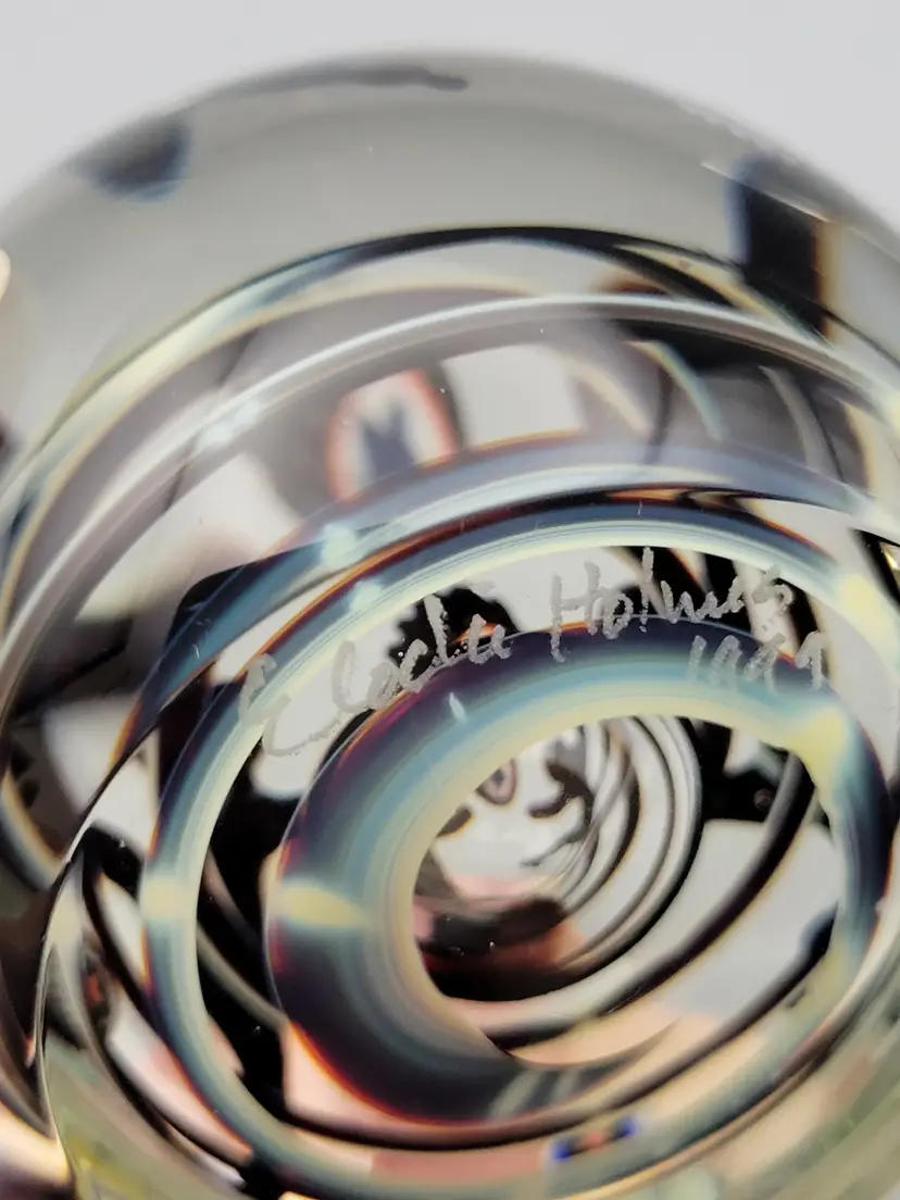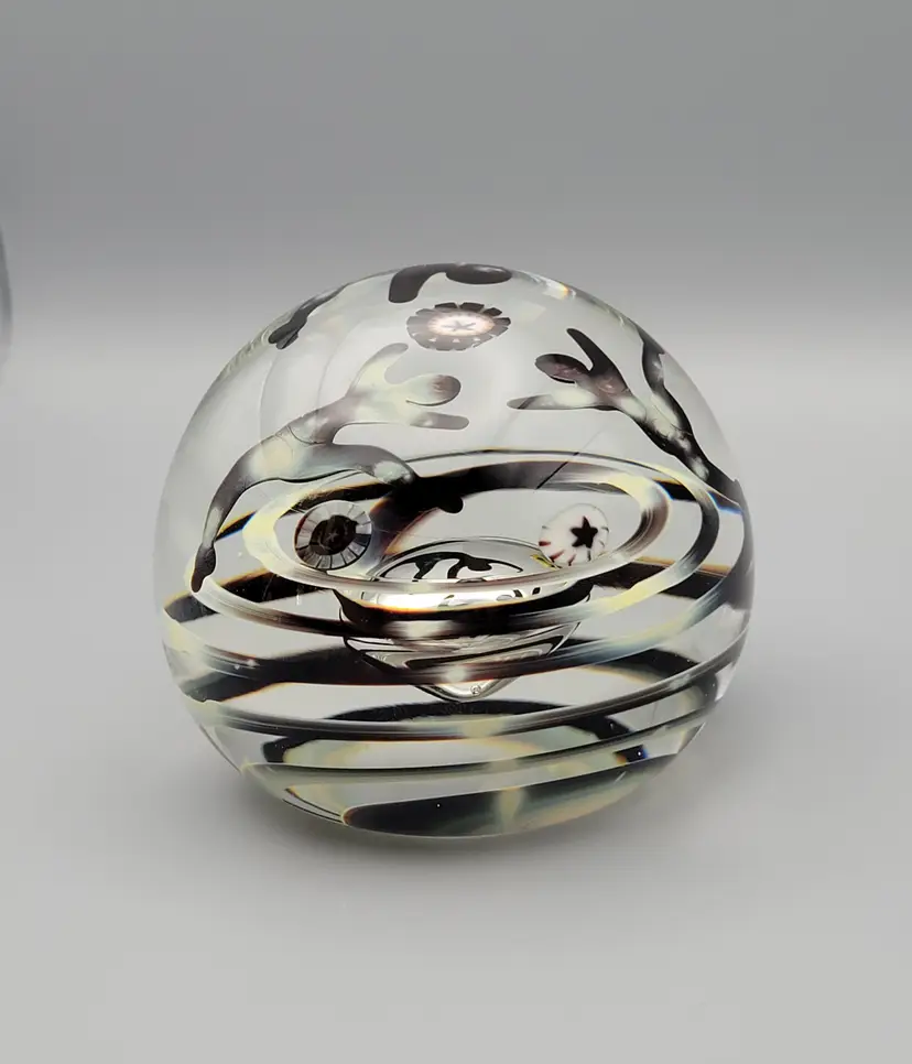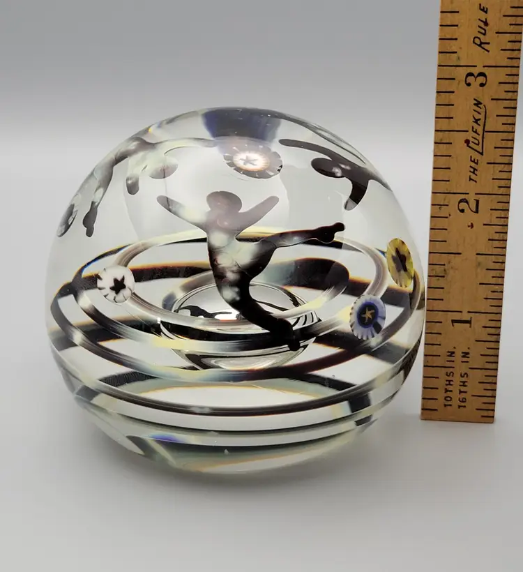 Elodie Holmes is the owner and head artist at Liquid Light Glass. Her signature series inspired by the movements of Taiko drummers. This paper weight has flame-worked dancers with colorful disks of glass cane and a cone shaped air bubble in the center of a beautiful swirl of ivory and black. It is in pristine condition. It is 3 inches wide and 2.5 inches tall. Shipping has been included in price. Thank you for looking and have a great day!