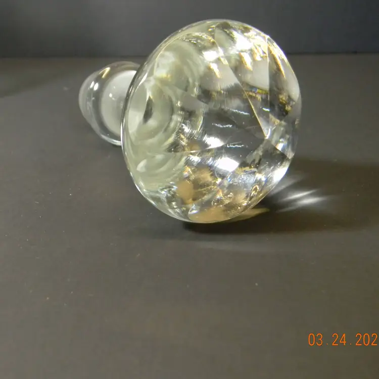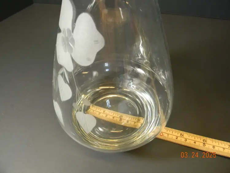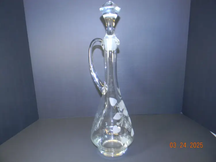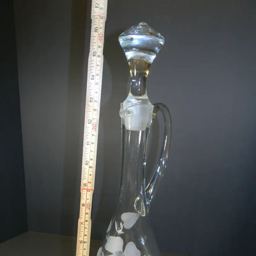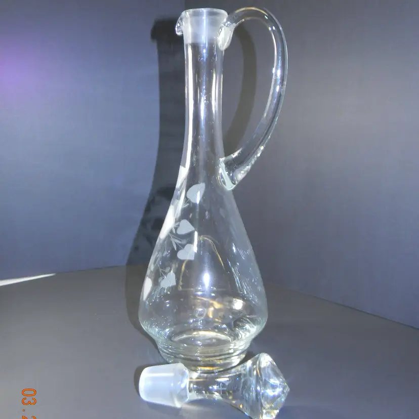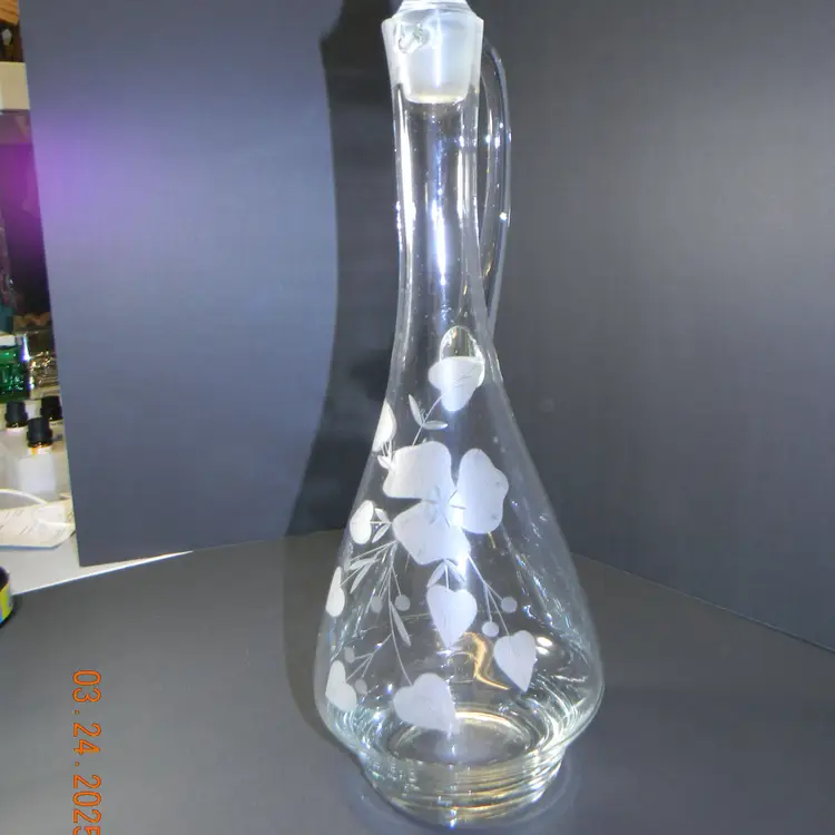 Etched Glass Decanter with Stopper and Handle No chips or cracks Little rubbing around the top of decanter from the stopper Used Condition see photos The difference in computer monitors actual colors may vary slightly from those shown