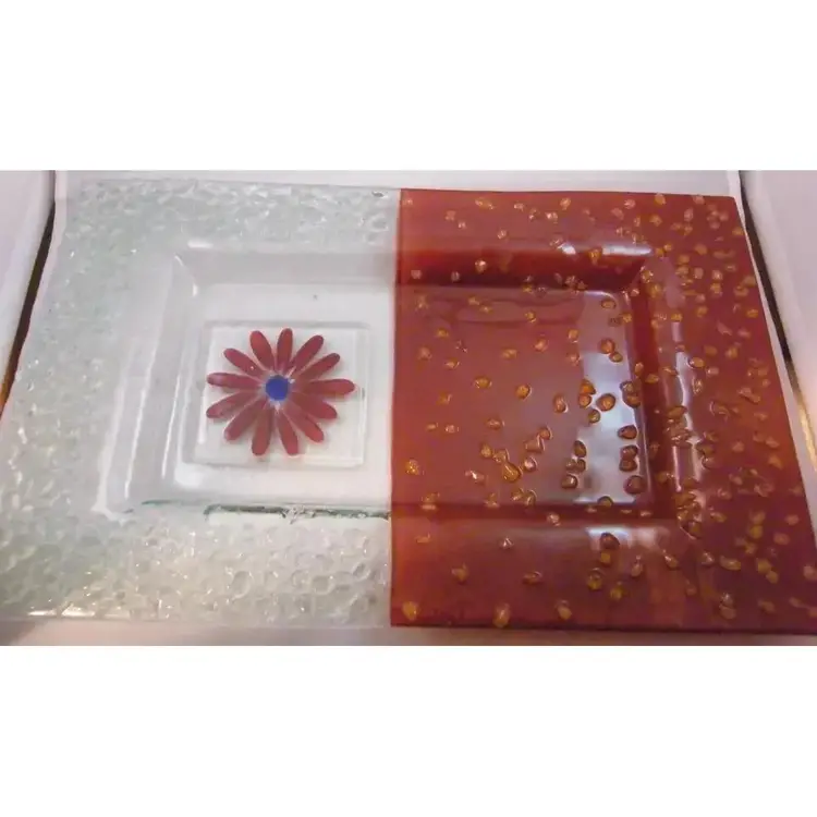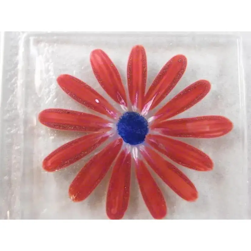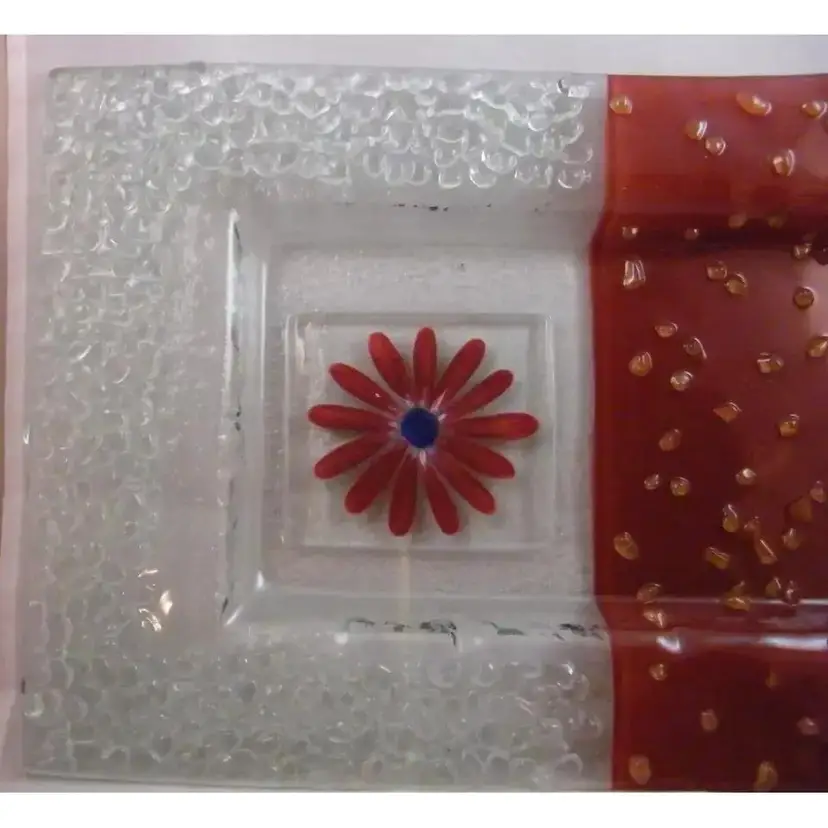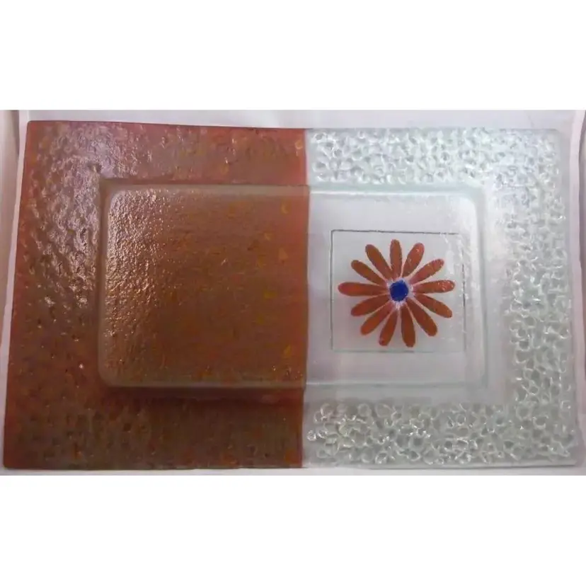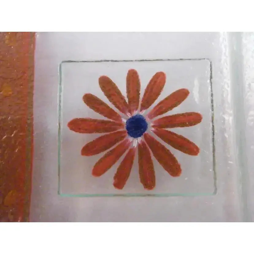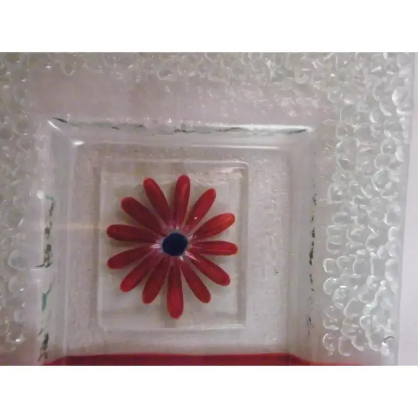“No defects in glass. Tiny pin head sized Manufacturer flaw in paint on Daisy.” Brand:Eterno Handmade Glass Type:Tray Color:Maroon and Clear Material:Glass Production Style: Fused Art Glass Time Period Manufactured:Mid Century Modern Production Technique:Fused Glass Product Line: Pebble This is a very unusual piece of Eterno Handmade Glass in the form of a shallow dished tray. The tray measures 14.5" x 9" and then slenders in the middle of the center length to 8.5". It is 1.5" tall from tabletop to top of the texture. It is a pebble pattern in a deep, rusty maroon color on one side, clear pebble glass on the other side, and a beautiful handpainted Daisy in Maroon with a blue center and touches of white. There is a very tiny paint flaw in the daisy, otherwise I see no chips, cracks, defects, or repairs in the glass. I have only seen the square curved version of this design in the searches I count this piece as something really special. It would make a lovely Sushi Tray, or a charcuterie tray for your special occasion or a beautiful display piece
