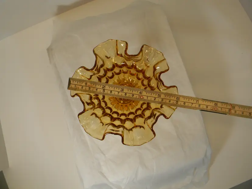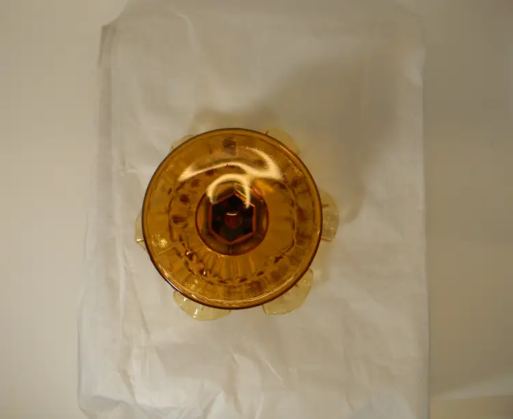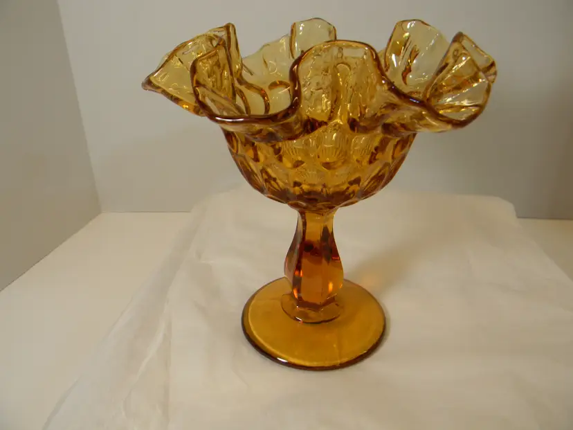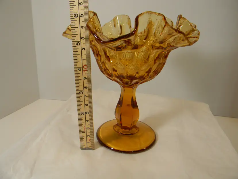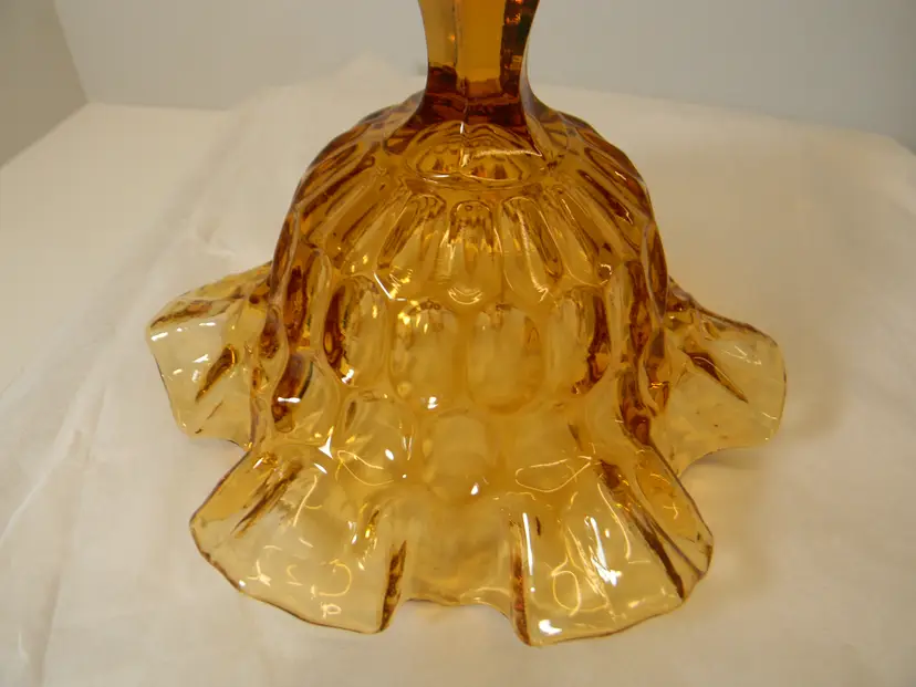 Amber Glass Thumbprint Pedestal, Ruffled top edge. some Color issues No chips or cracks used condition see photos The difference in computer monitors actual colors may vary slightly from those shown
