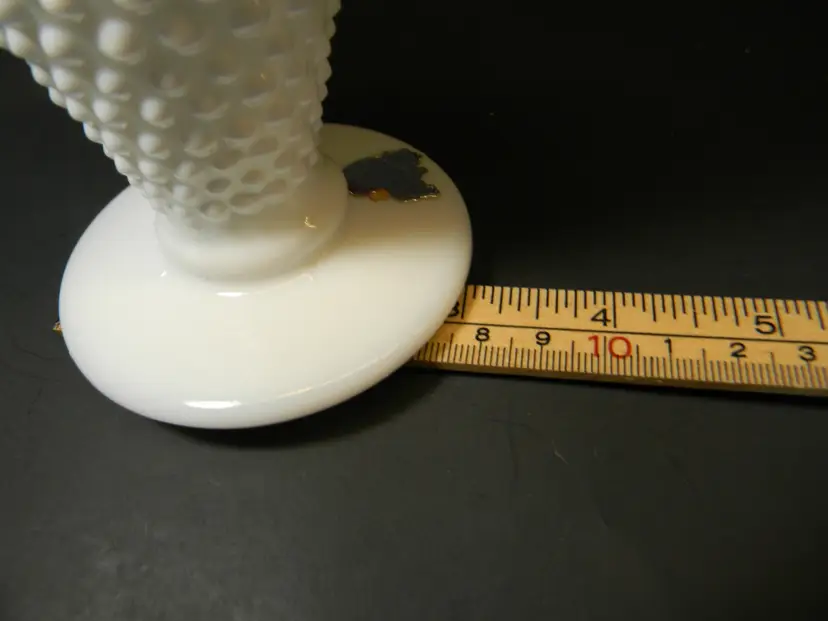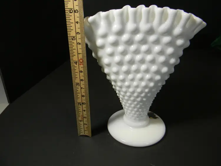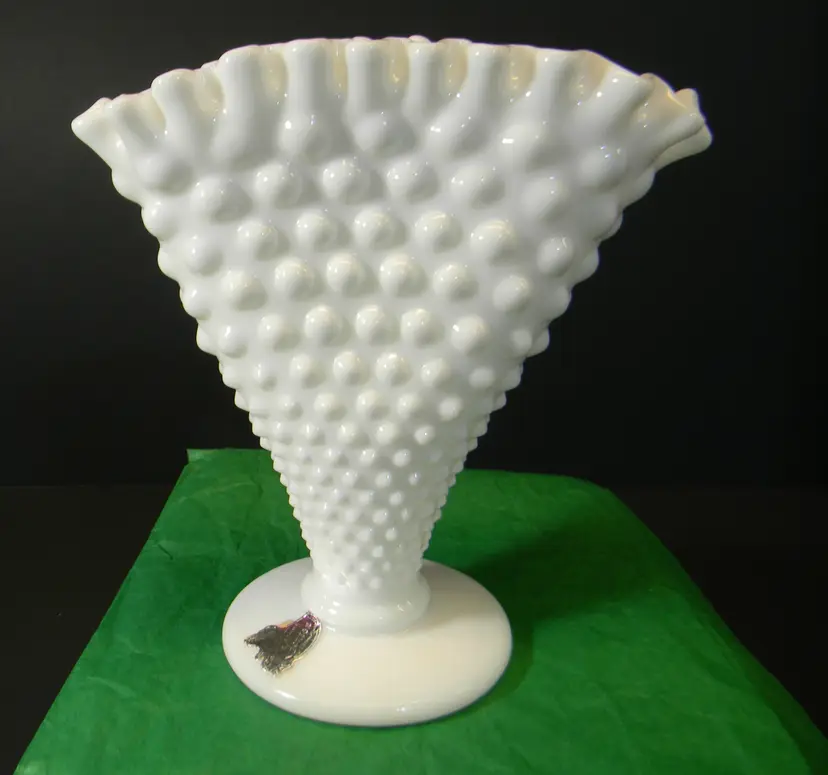 #01 Fenton Fan Hobnail Milk Glass Vase Has original sticker ( 6 1/4 " H x 5 1/2" L )