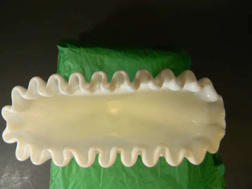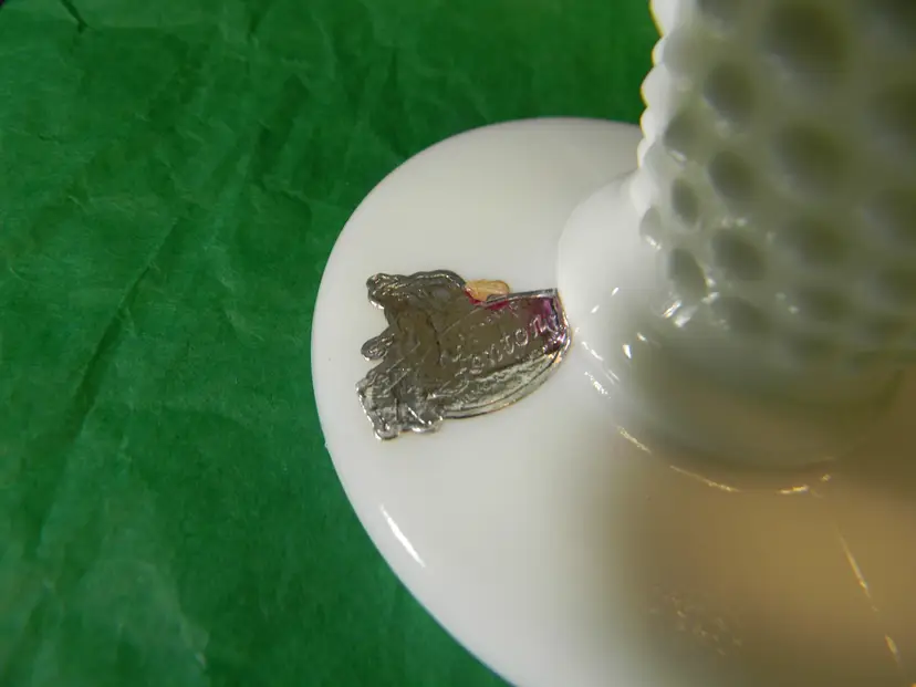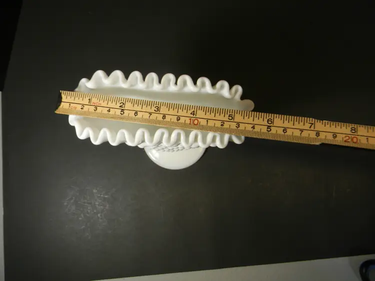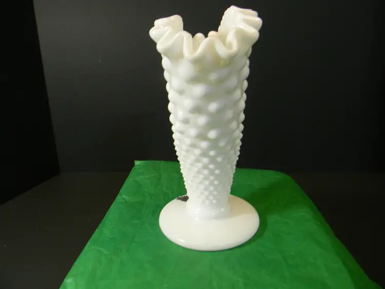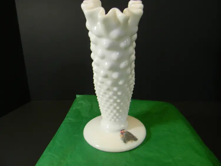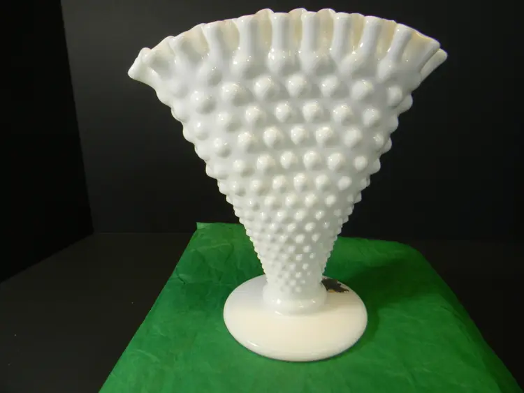 Fenton Hobnail Milk Glass Crimped Fan Flared Flower Vase has Original Sticker No chips or cracks used condition ( 6 1/4 " H x 5 1/2" L ) see photos The difference in computer monitors actual colors may vary slightly from those shown