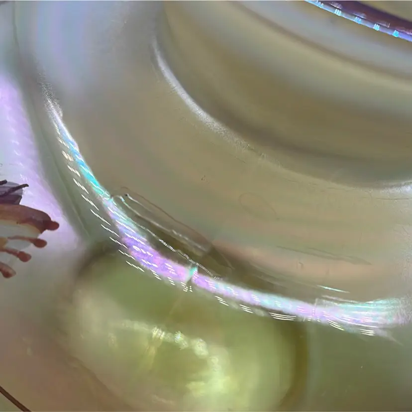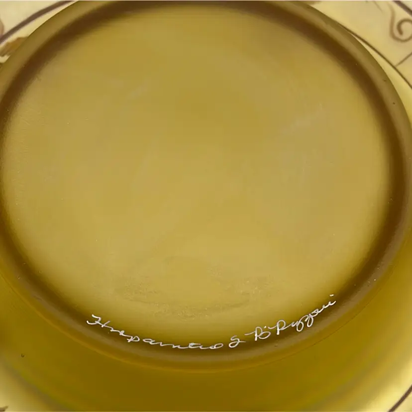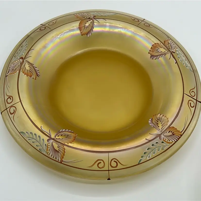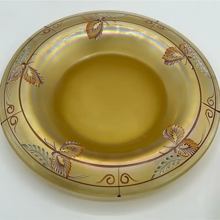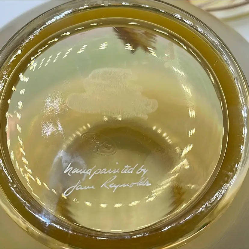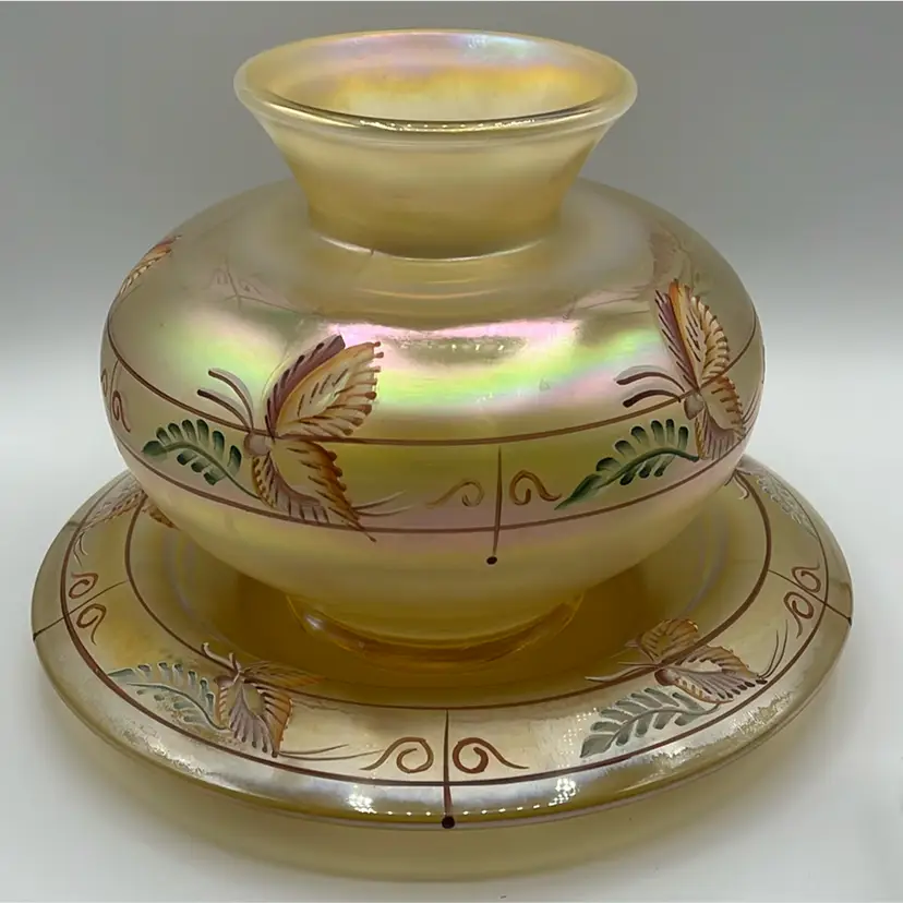 Bowl is 7” x 8” plate is 10 1/2” across. Stamped, signed and stickered. Marked with an "F" as a 2nd. Mark on bowl, etching scrape on bottom. Plate has brush marks on underside. The beauty far outweighs the issues.