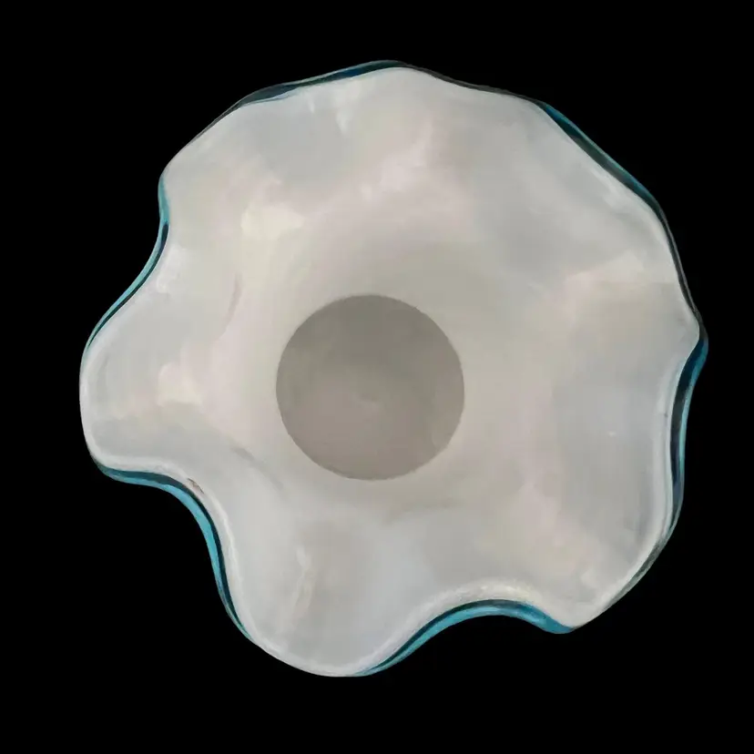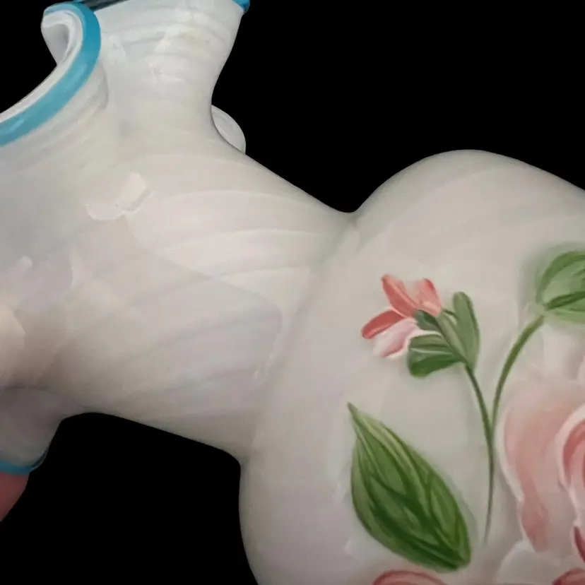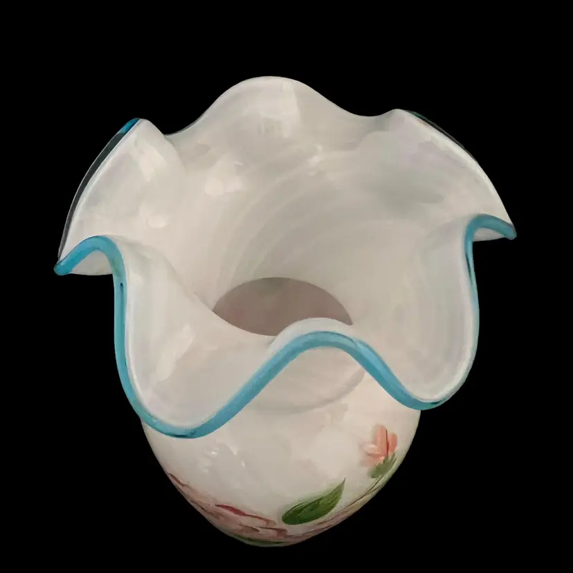 Here we have an Optic Swirl vase made by Fenton for Teleflora. The glass is white with hand painted pink and red roses and a blue, ruffled rim.