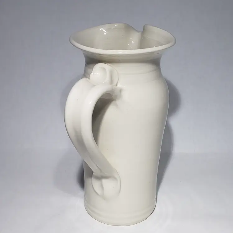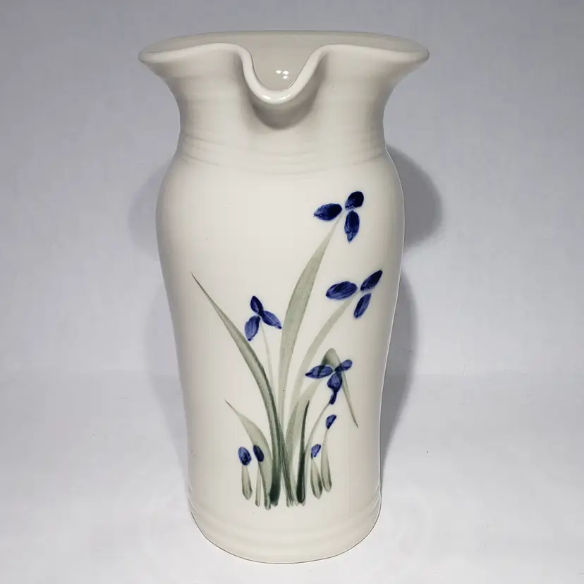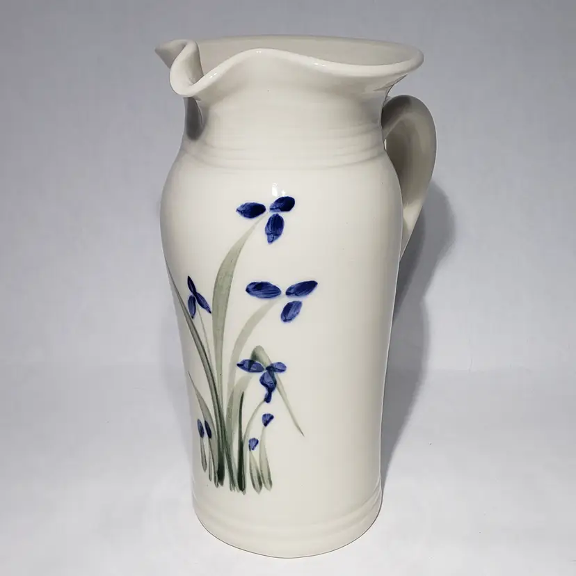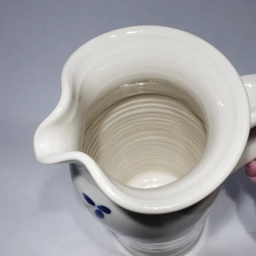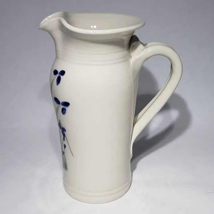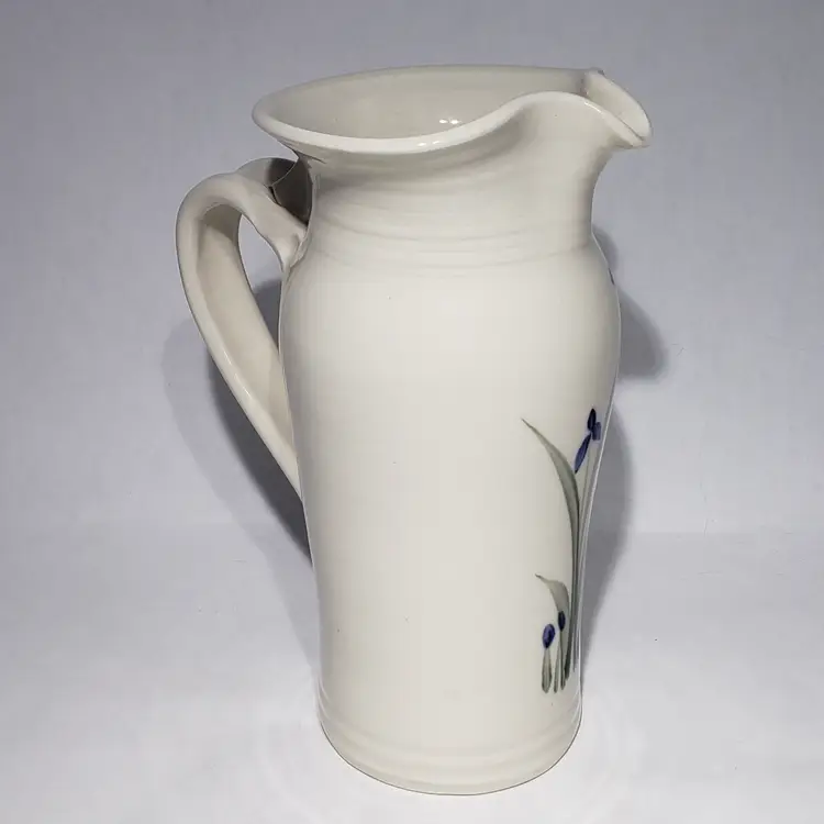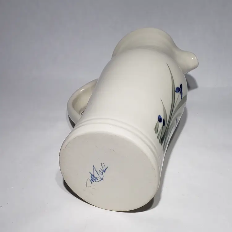 Art Pottery White Blue Flowers Stoneware Pitcher Artist Signed Applied Handle Measures: 6" x 4.5" x 8.5" Pre-owned. No cracks or chips. See Photos.