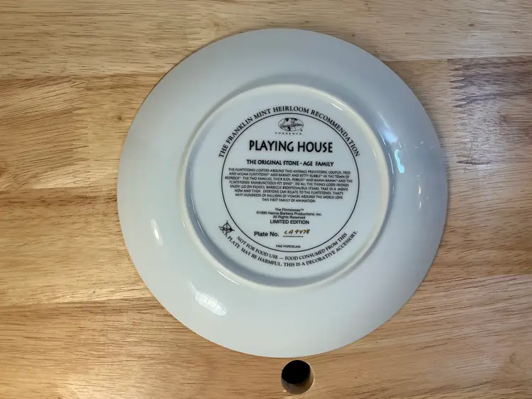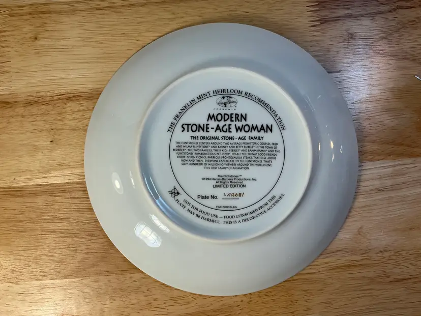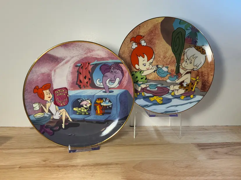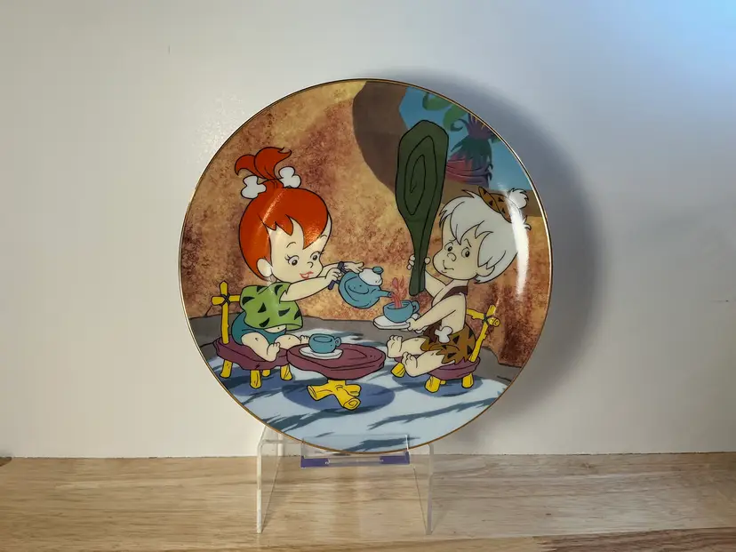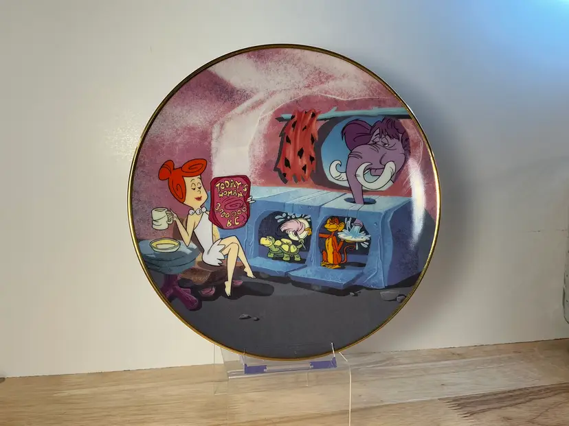 Gorgeous vibrant paint.Numbered. Approx 8” d. Shipped in original packaging.Wilma is cute in a She-shed. Love Pebbles and Bambam in a child’s room. Hang on a wall or use a plate stand on a shelf. No chips or cracks Vibrant paint