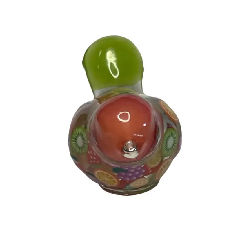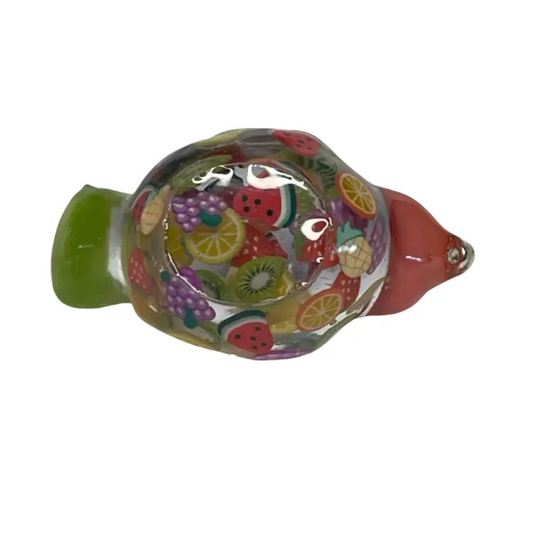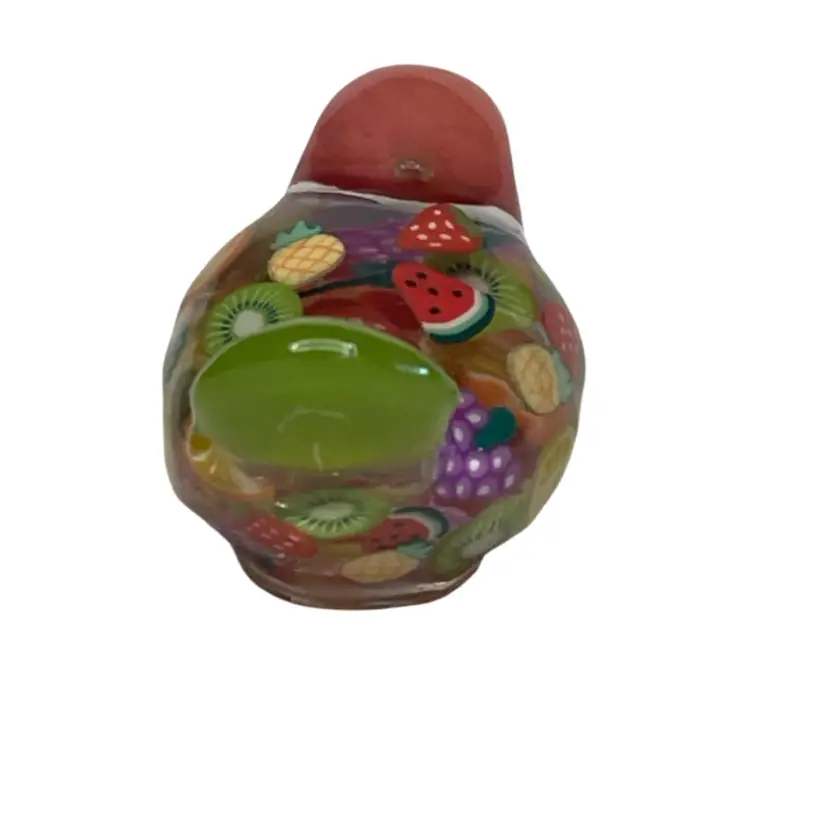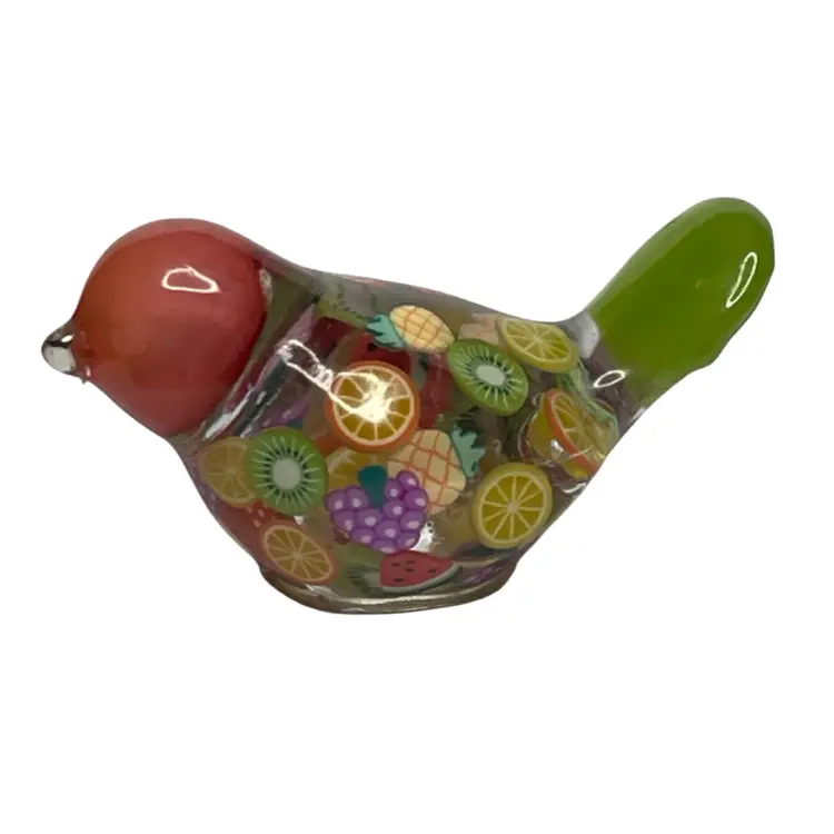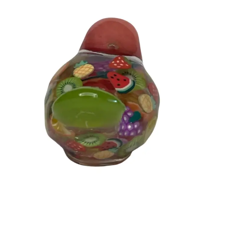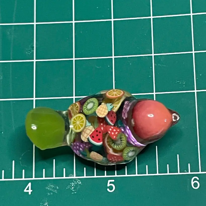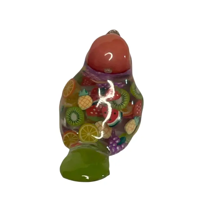 This gal is made with a green seed bead beak, a peachy orange head from my craft pile, a handmade green cabochon tail and a body filled with juicy fruit slices made from polymer clay.