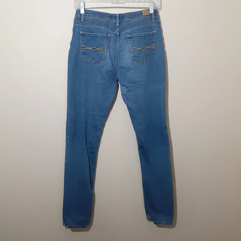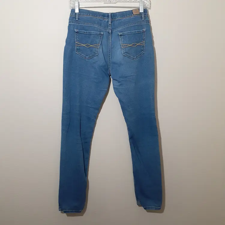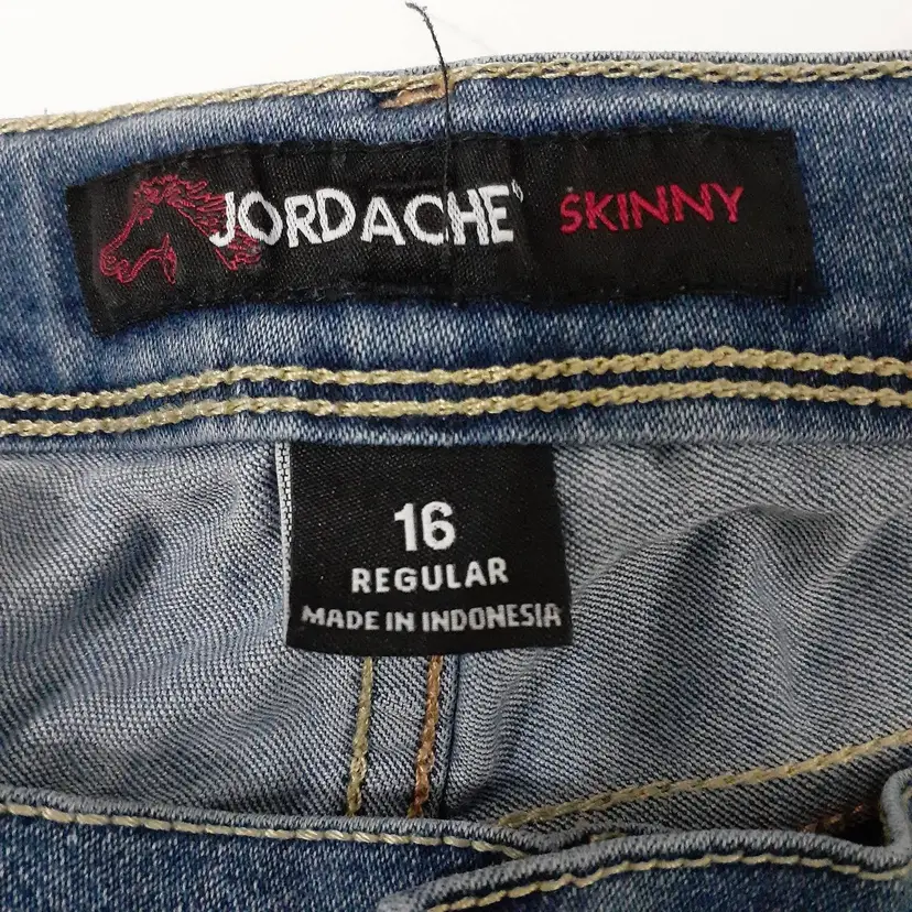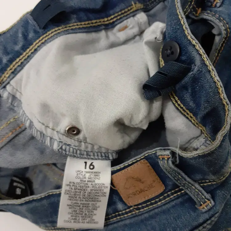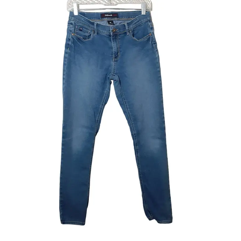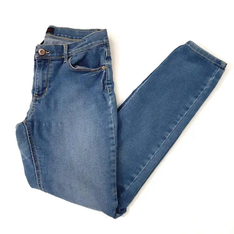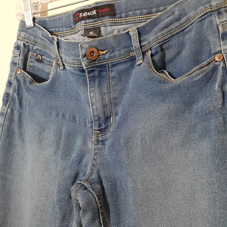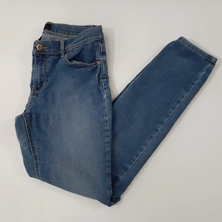 Jordache girls skinny jeans size 16 Regular blue stretch denim 8" rise, 28.5" inseam pre-loved, some wear and pulling/puckering as seen in photos fair pre-loved condition