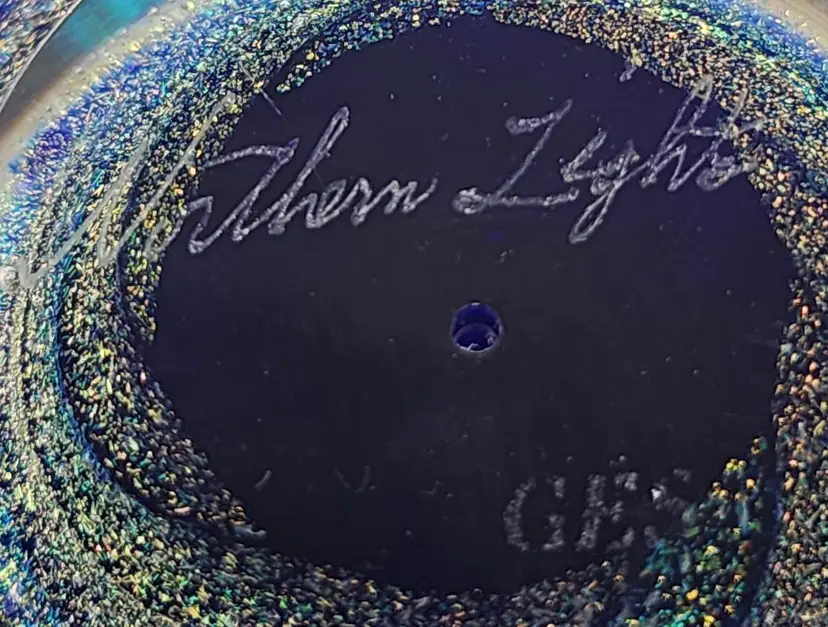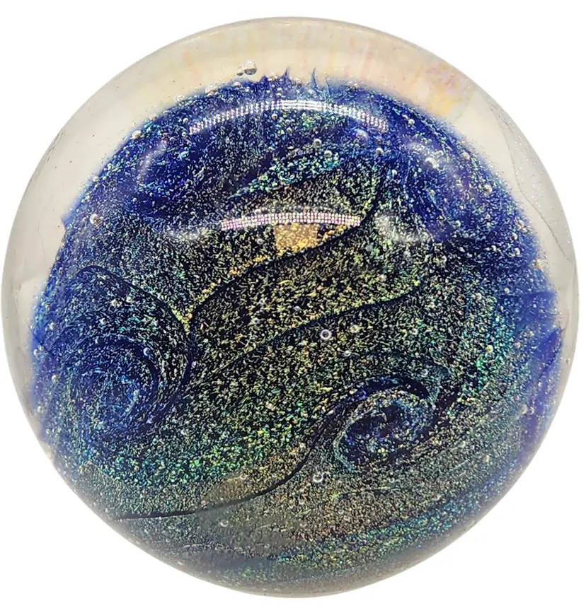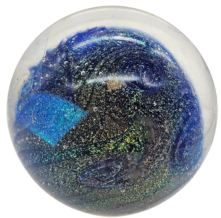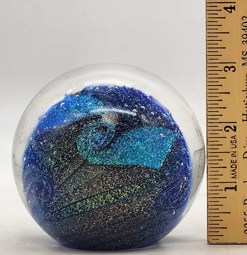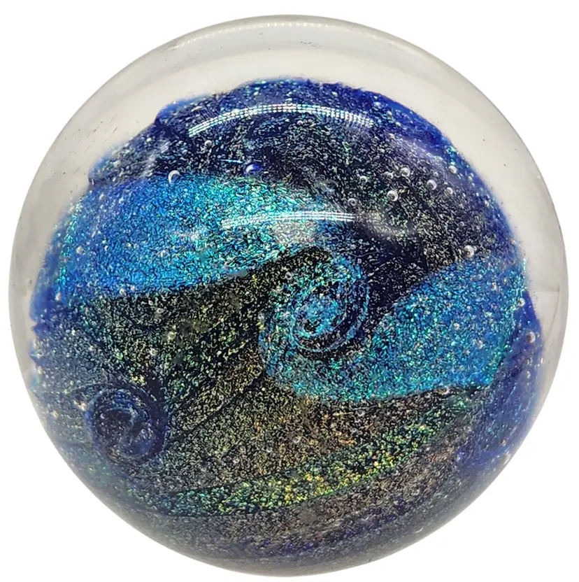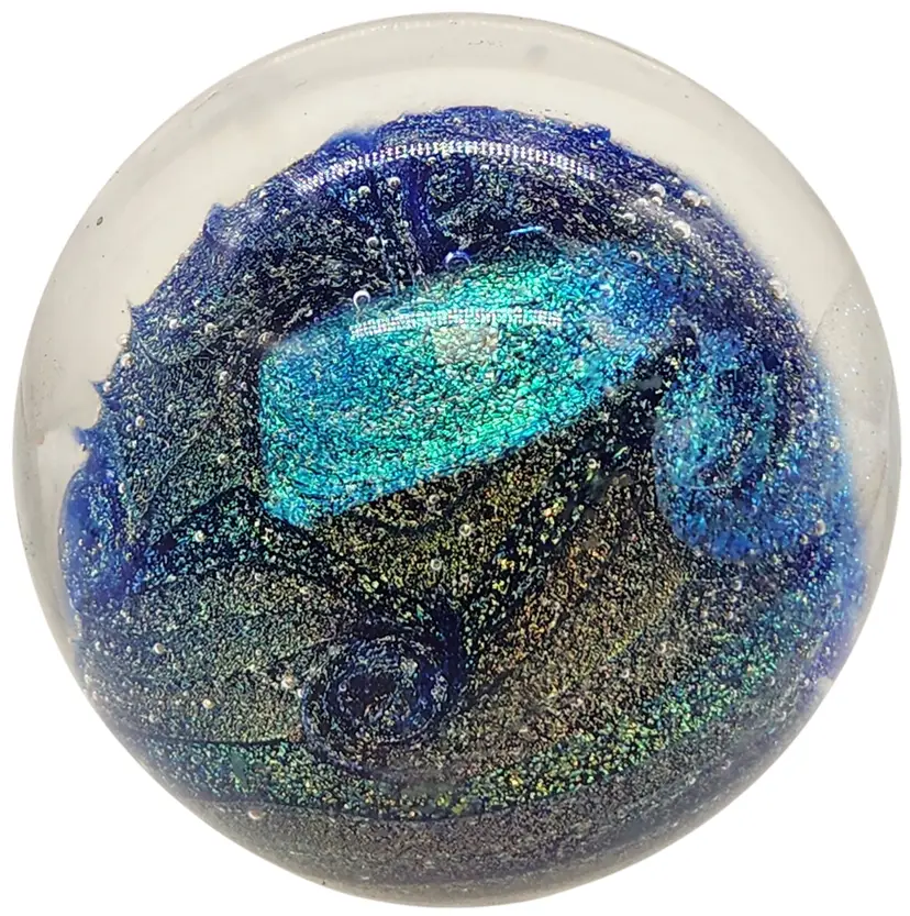 The Glass Eye Studio GES Northern Lights Paperweight is a beautifully crafted decorative collectible made of glass. This 3" diameter paperweight features a stunning blue sparkle design, adding a touch of elegance to any space. Handmade in the United States by Glass Eye Studio, this paperweight showcases the artistry and quality that the brand is known for. Perfect for collectors or those looking to add a unique piece to their decor, this Northern Lights paperweight is sure to be a standout in any collection.