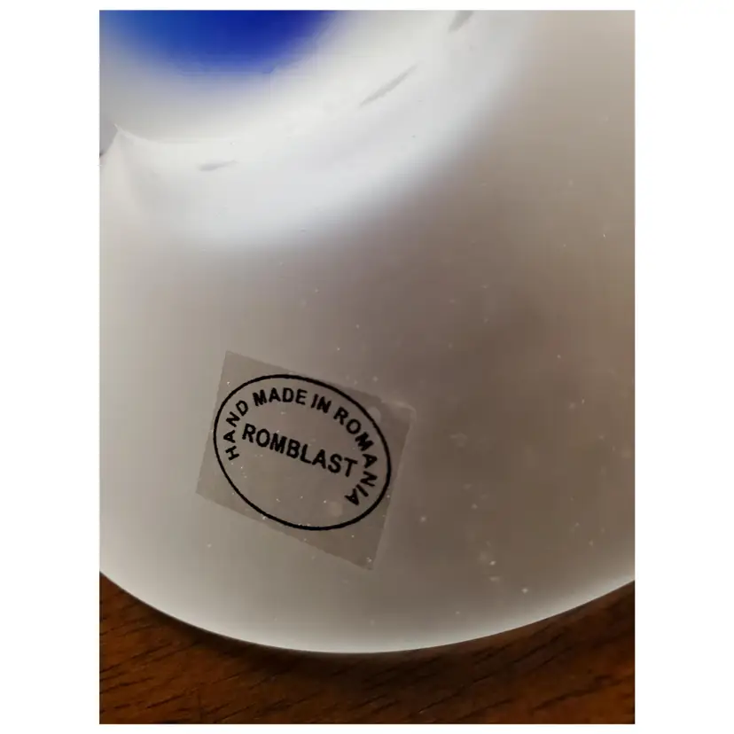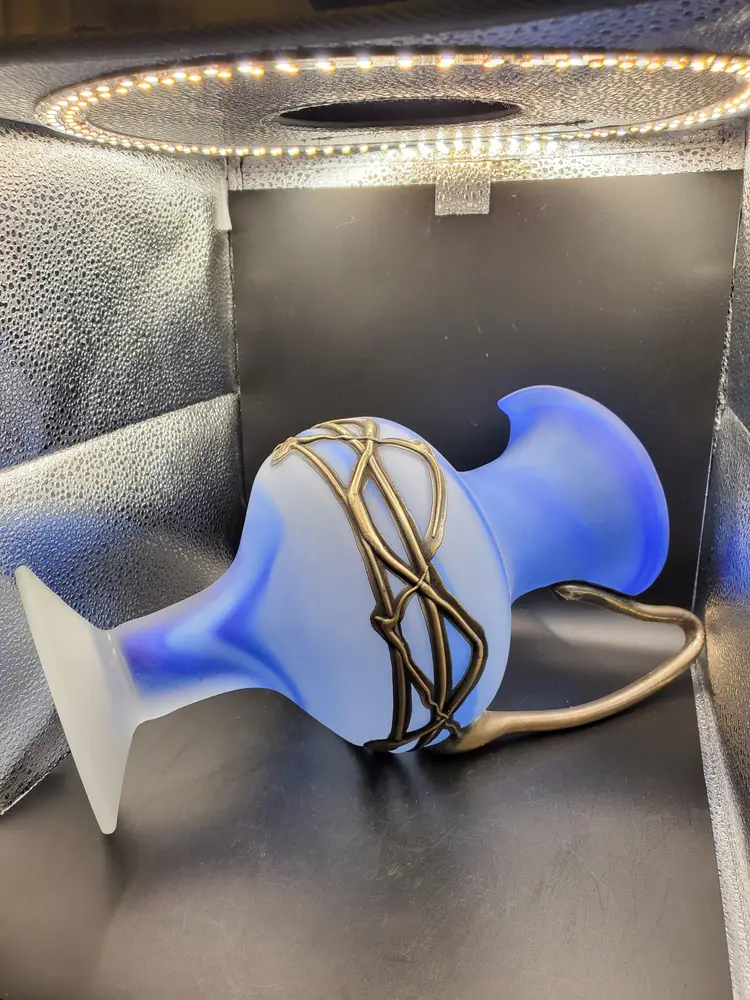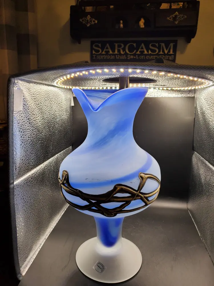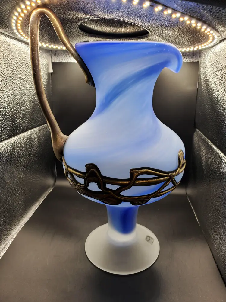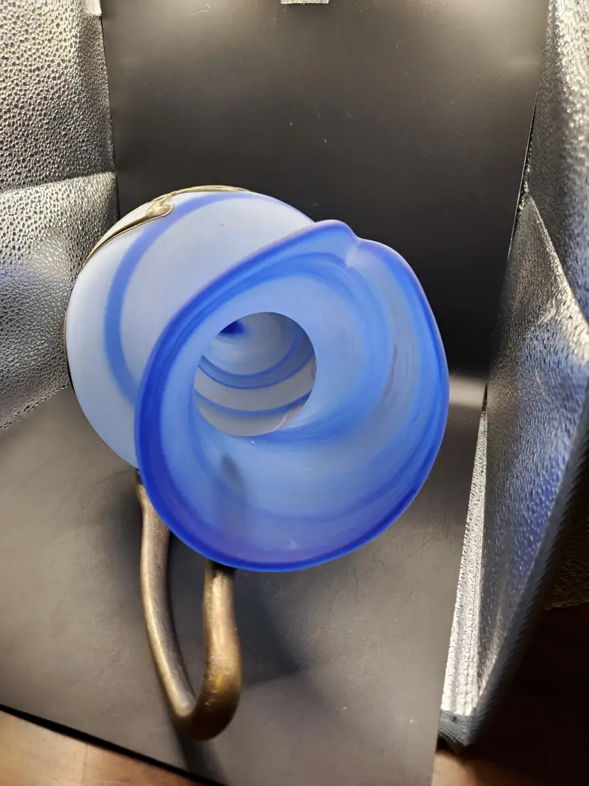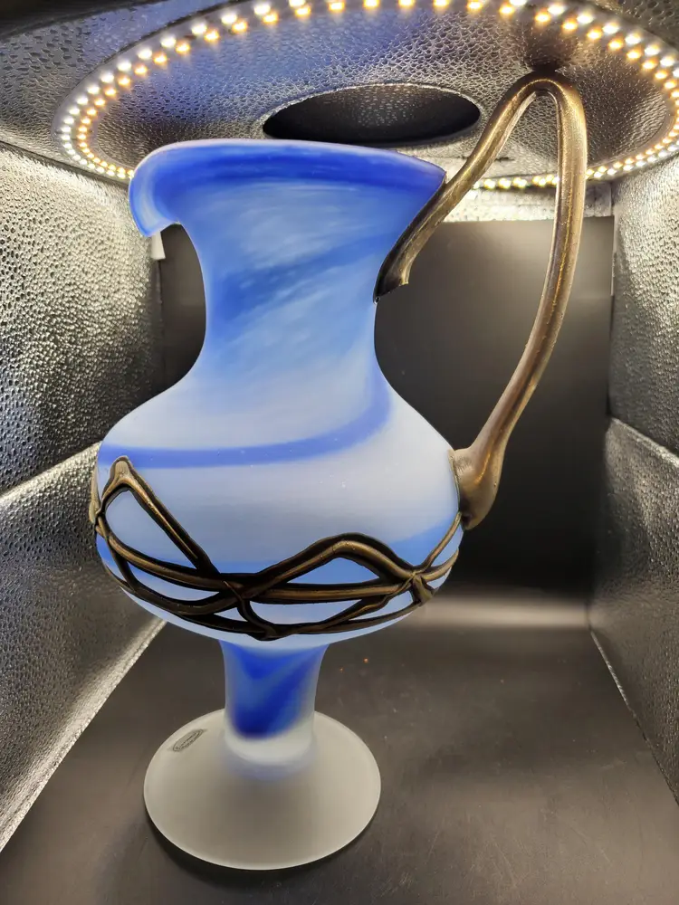 This gorgeous piece of glass is satin blue with swirls of darker blue throughout with a satin clear base. Has silver overlay design and a silver handle. Stands 12" tall by 7" wide. So pretty!