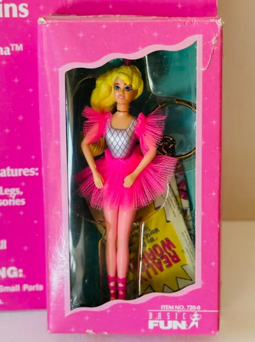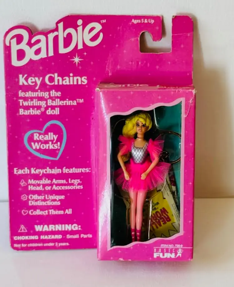 For sale is a rare and collectible Barbie Twirling Ballerina Keychain from 1996. This keychain features a 4-inch Barbie doll dressed in a ballerina outfit, complete with a tutu and ballet shoes. The doll's skin tone is Caucasian and the keychain is made of plastic material.This original and authentic Barbie keychain is a great addition to any collection, especially for fans of the 1990s era. The keychain is in excellent condition and has been well-preserved over the years. It is recommended for ages 3 and up. Don't miss out on the chance to own this unique and nostalgic piece!