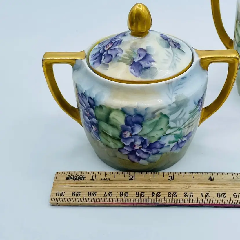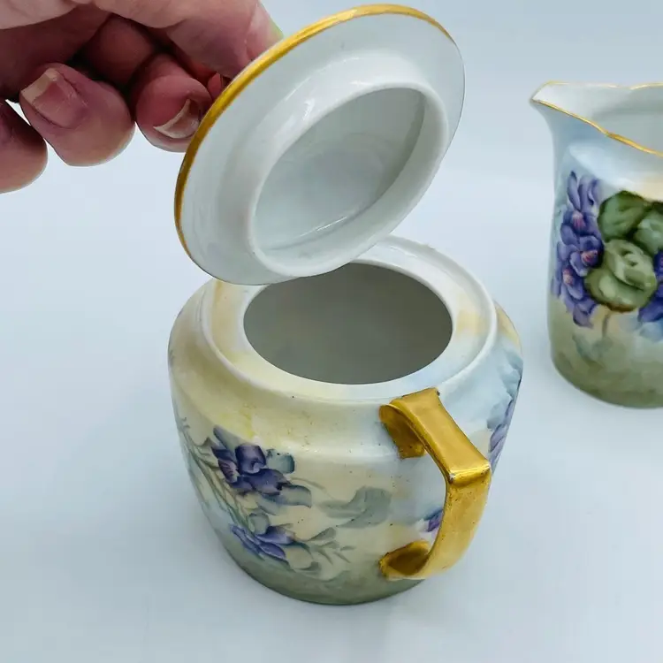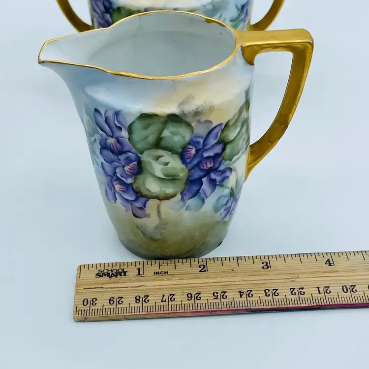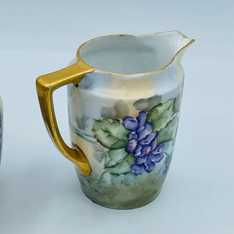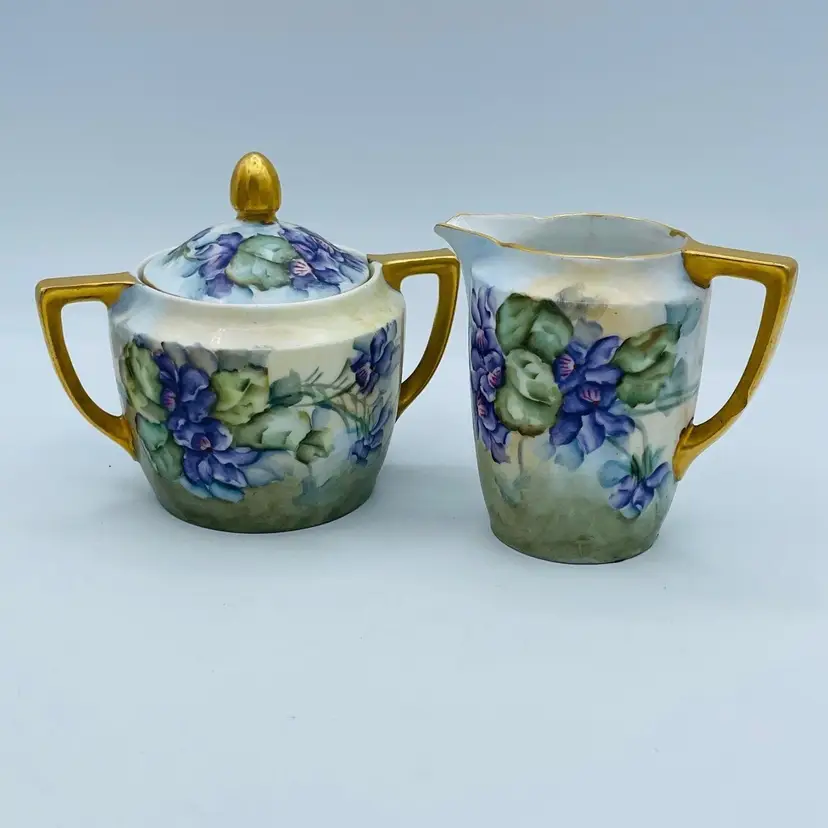 This charming creamer and sugar set features beautiful hand-painted floral designs with vibrant purple flowers and lush green leaves. The gold accents on the handles and lid add a touch of elegance. Perfect for adding a vintage touch to your kitchen or dining collection. Small crack in pitcher opening. Definitely has some age and charm. See all images for more details.