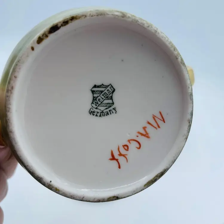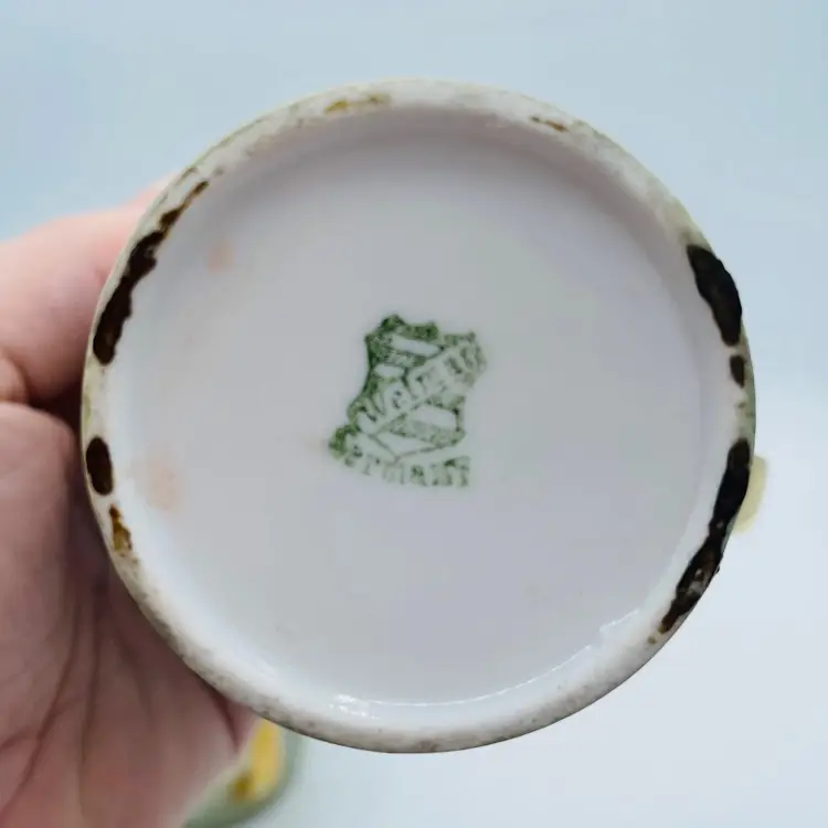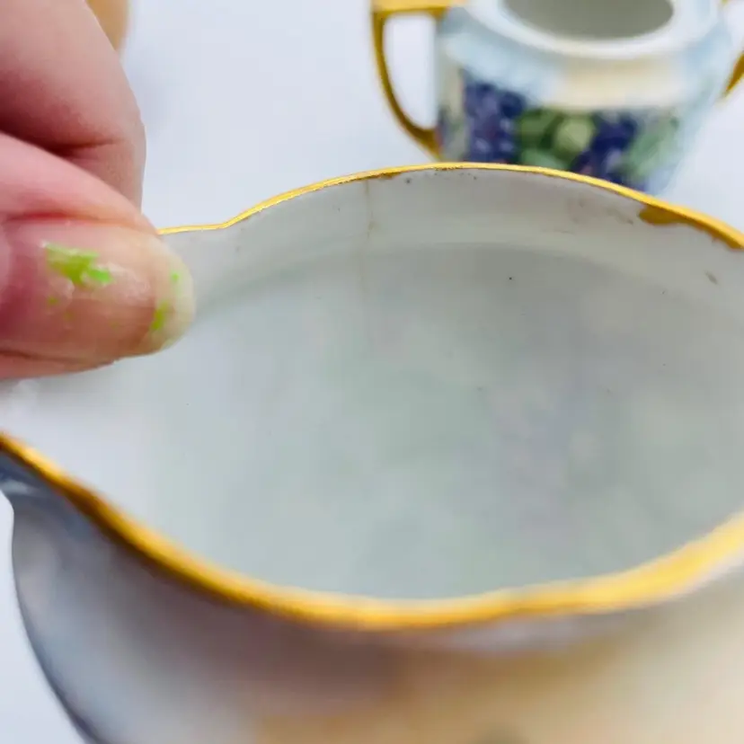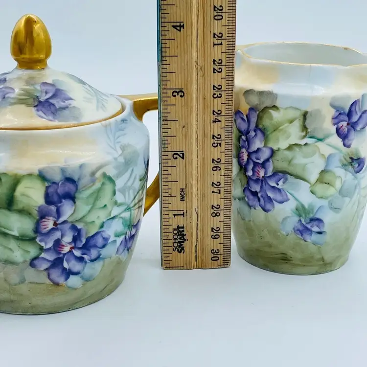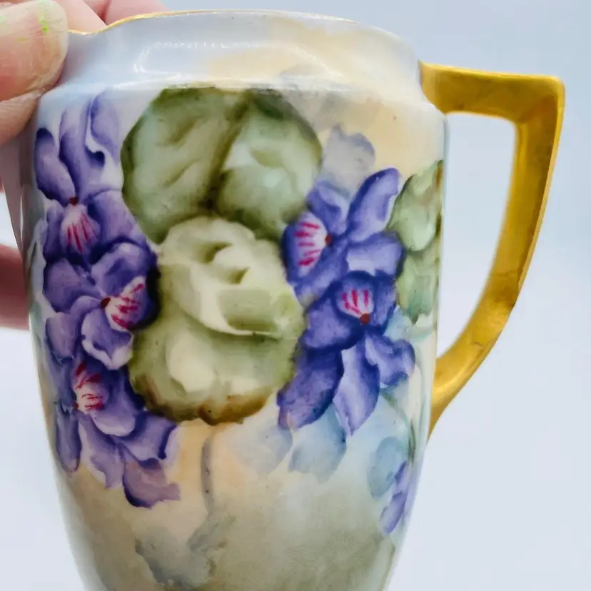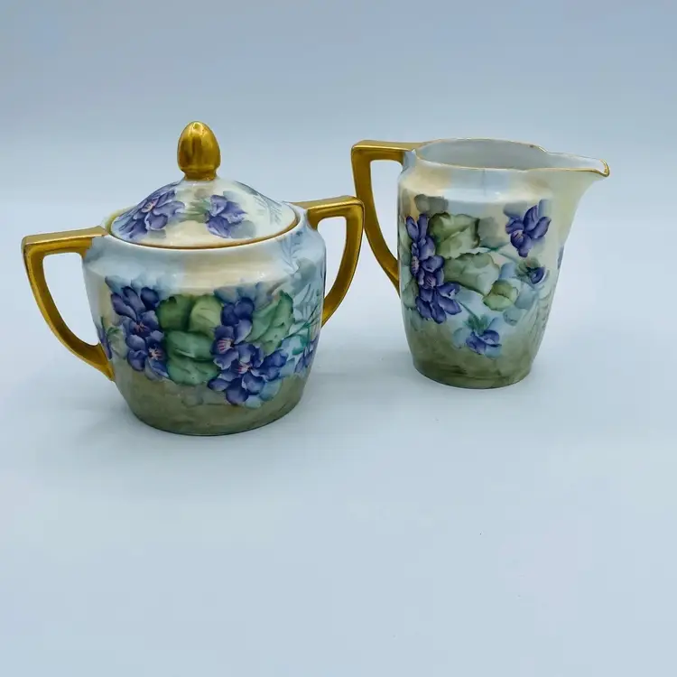 This charming creamer and sugar set features beautiful hand-painted floral designs with vibrant purple flowers and lush green leaves. The gold accents on the handles and lid add a touch of elegance. Perfect for adding a vintage touch to your kitchen or dining collection. Small crack in pitcher opening. Definitely has some age and charm. See all images for more details.