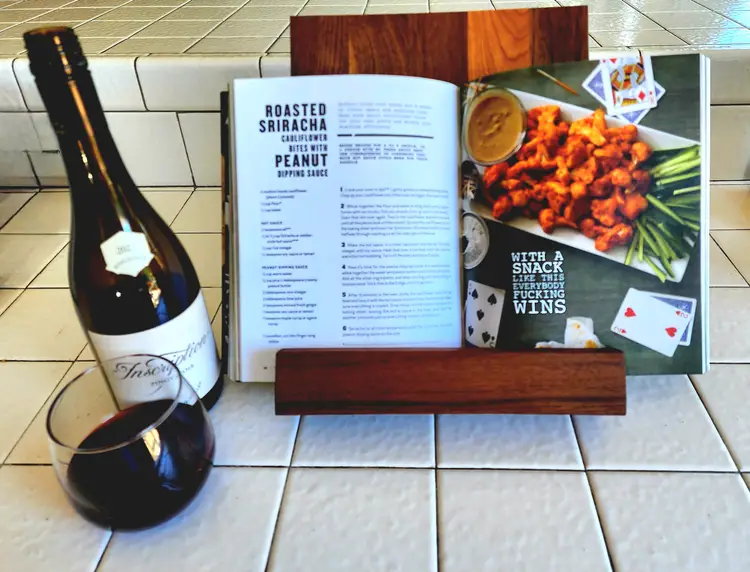 Handcrafted cookbook stand made from sustainable domestic walnut and cherry hardwood. Simple voc-free wood oil finish. Folding stand so it can be stored out of the way. Simple classic design use as a bookstand or tablet stand. Each piece is handmade, please expect wood-tone and color variations.