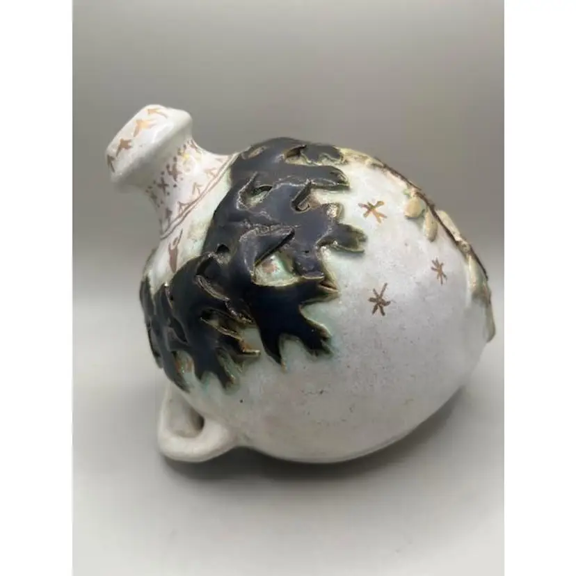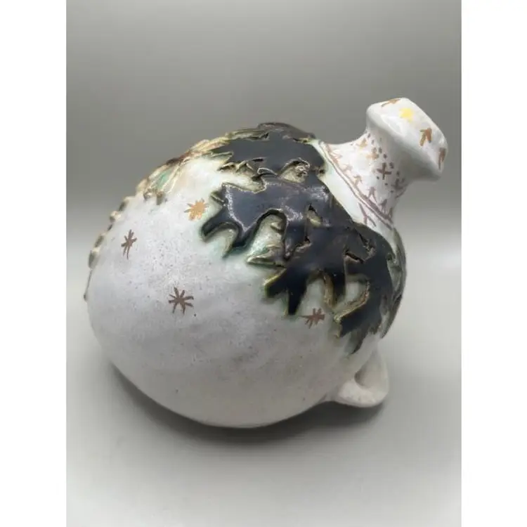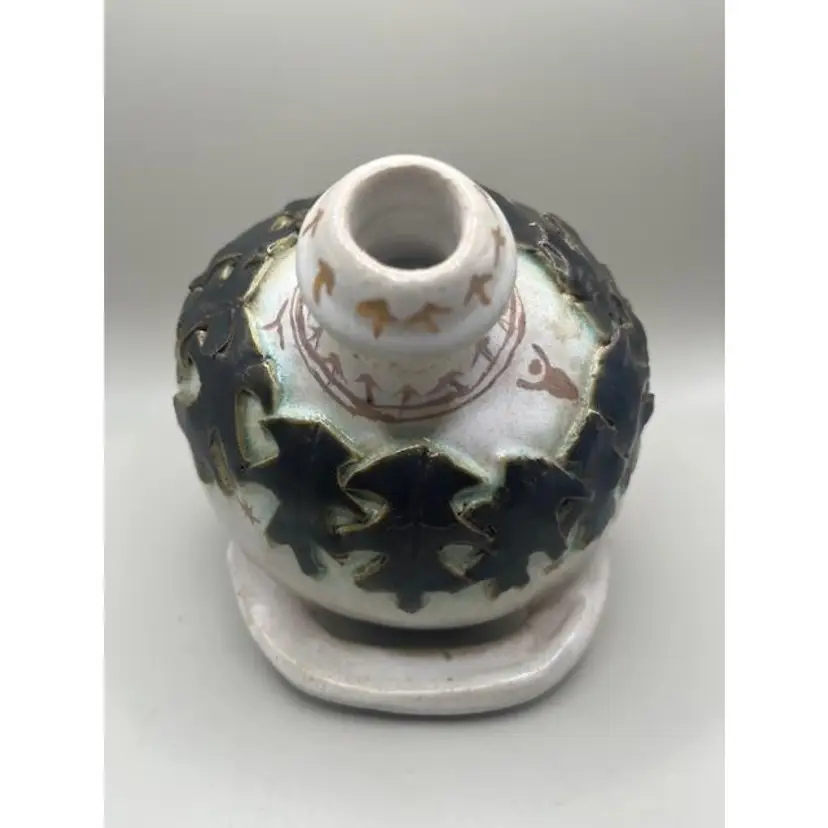 This unique handcrafted pottery vase features a beautiful dragonfly relief design, adding a touch of nature-inspired elegance to your decor. Perfect for displaying flowers or as a standalone piece. Measures approximately 5 inches tall.