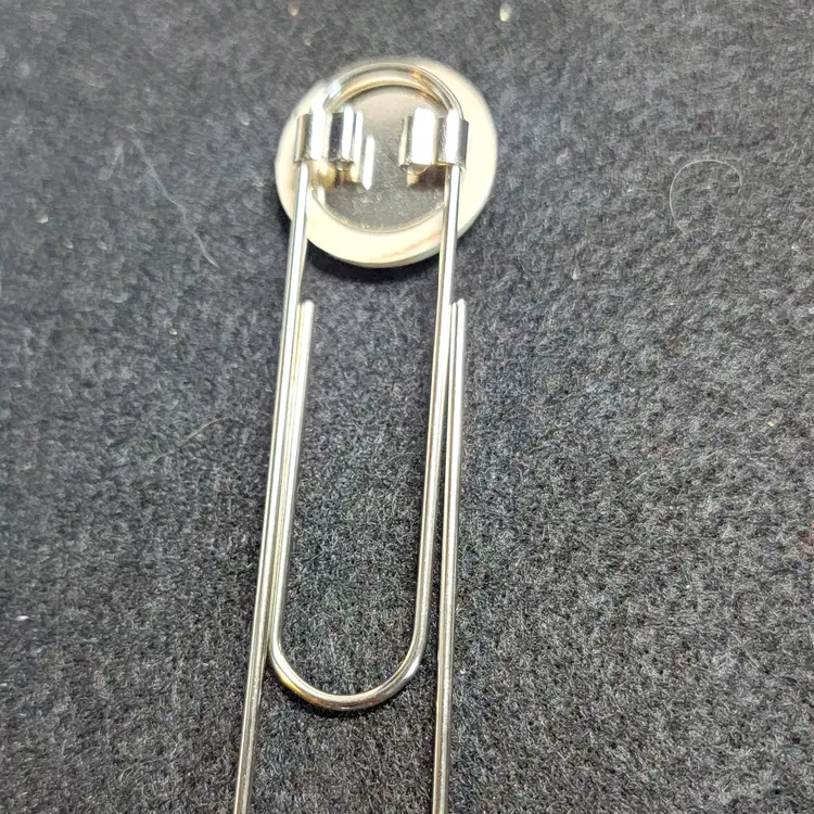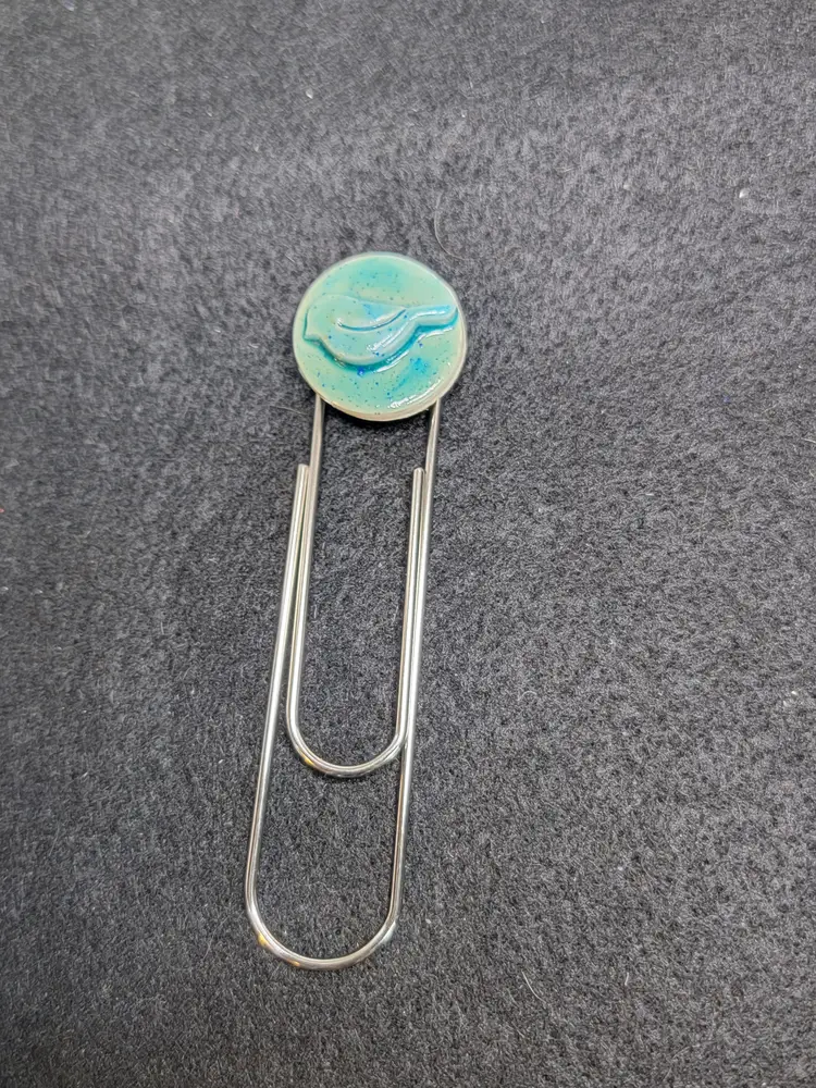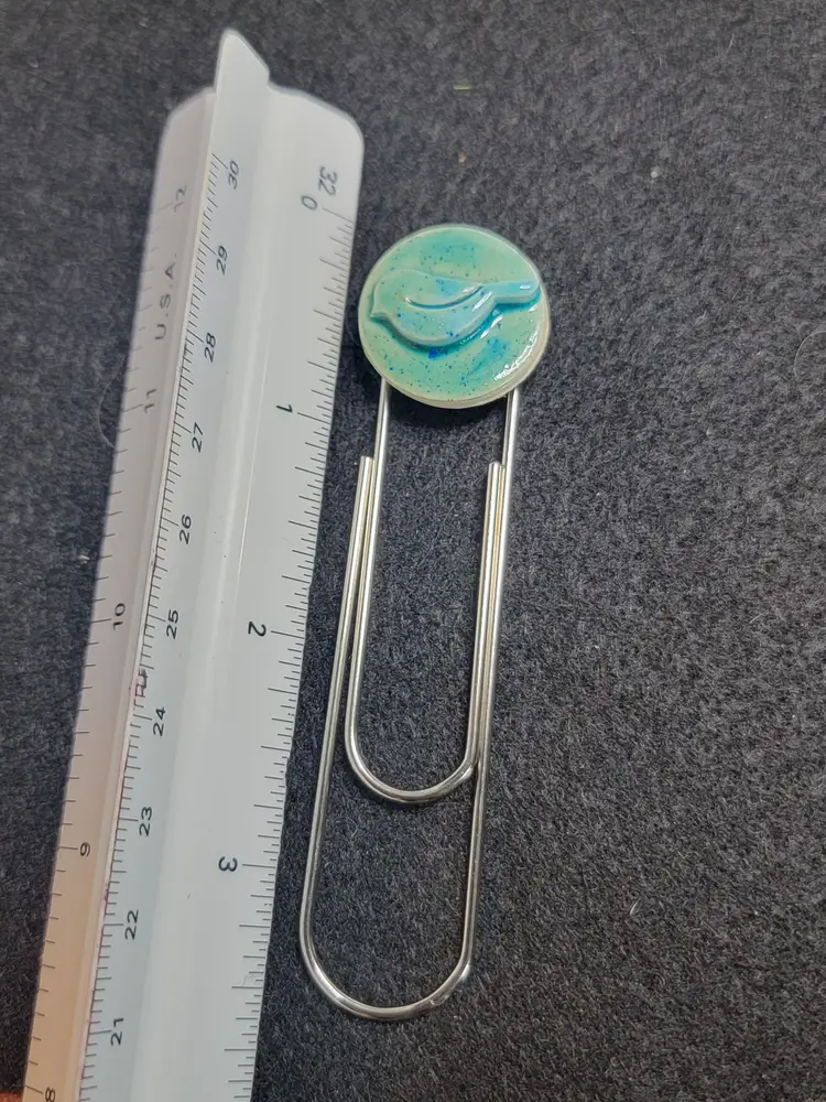 Handmade bookmark made from polymer clay stamped with a bird design.