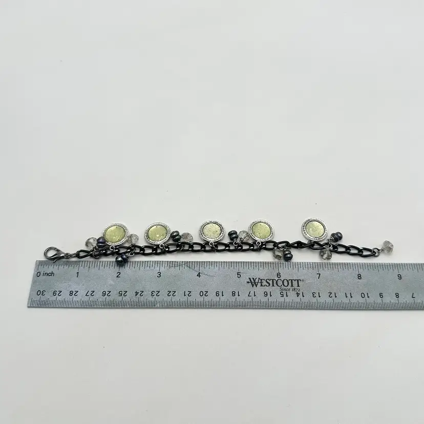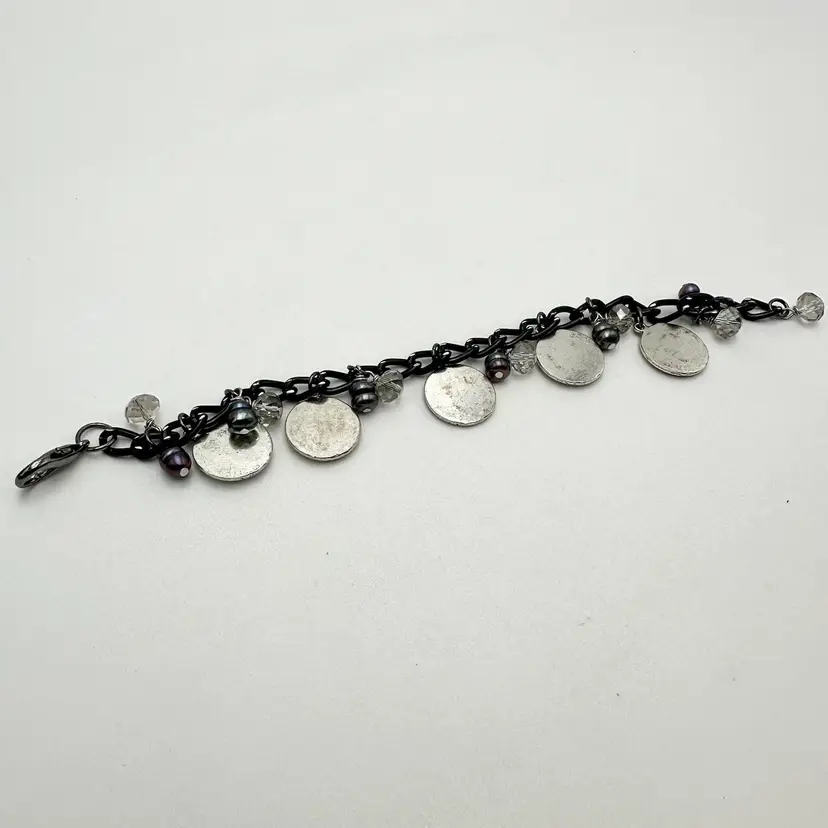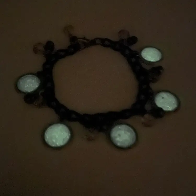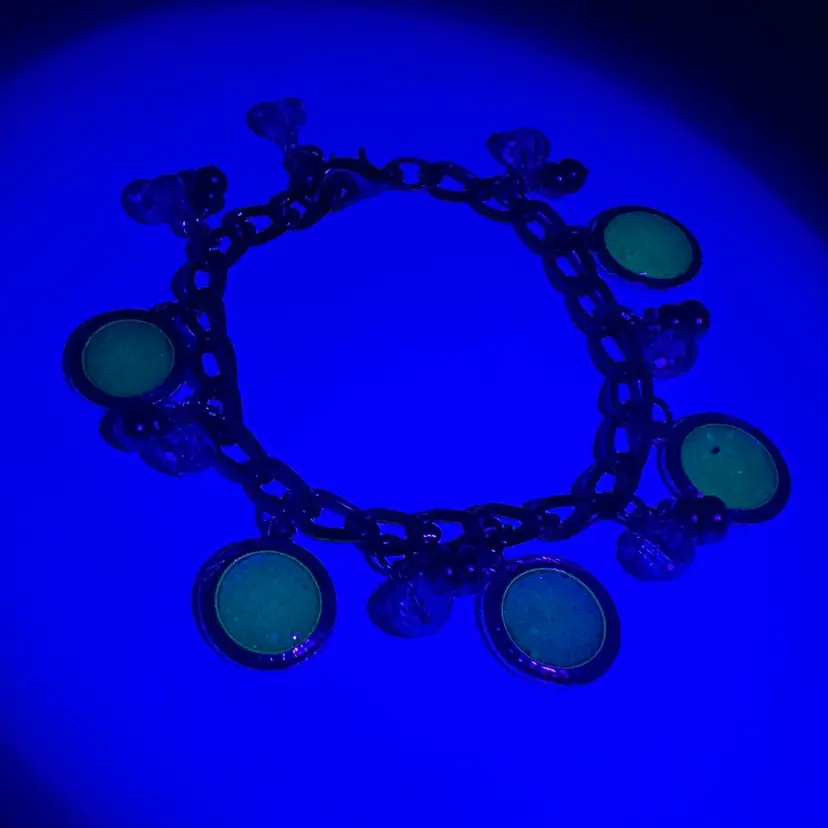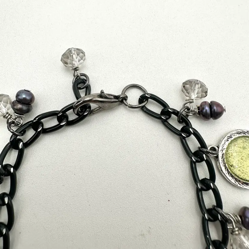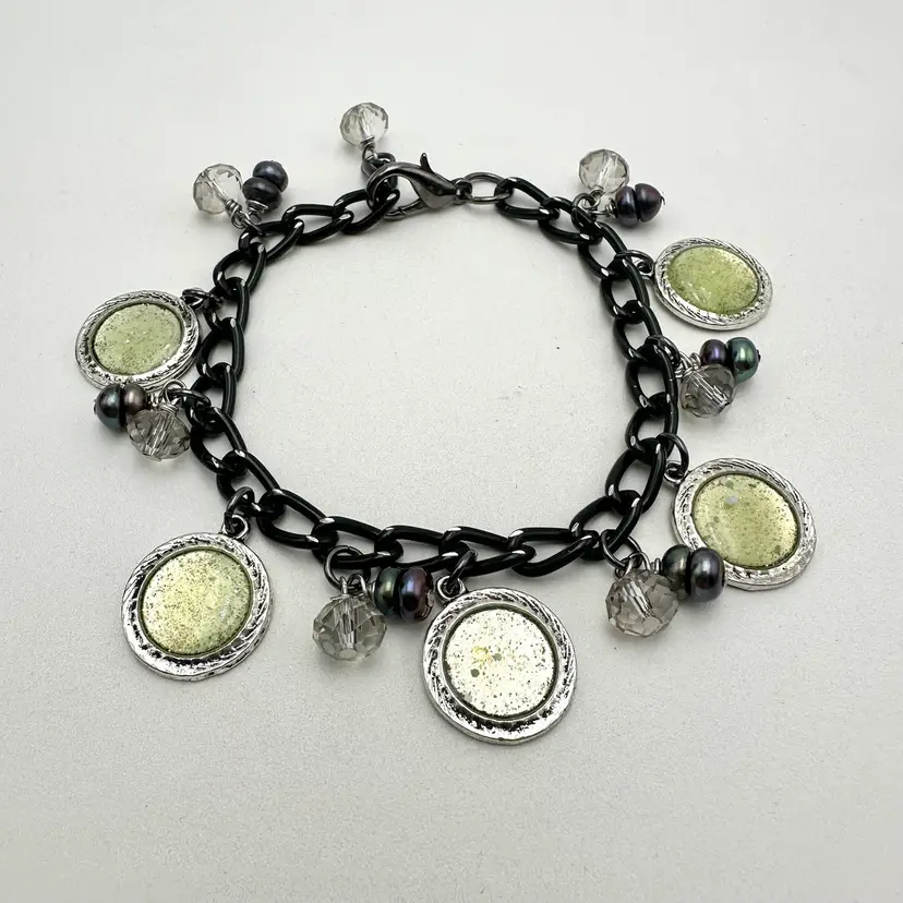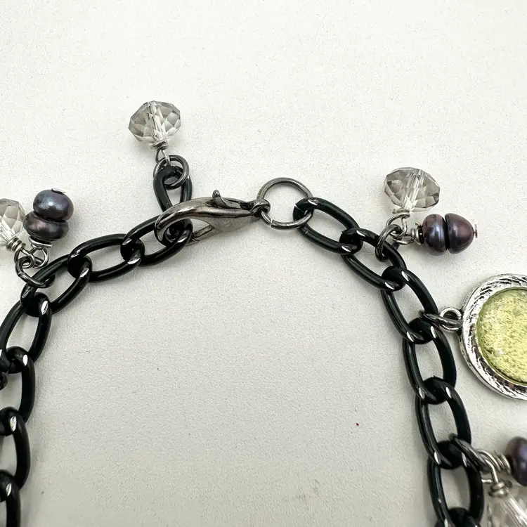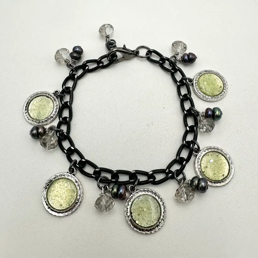 Handmade using repurposed chain and beads Resin pieces are new and made by me Faceted crystal beads and grey/black freshwater pearl bead accents, repurposed Some glow 8.5” L adjustable