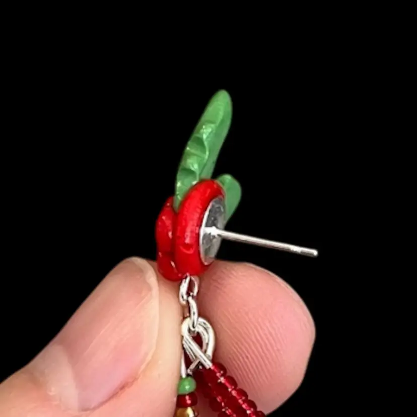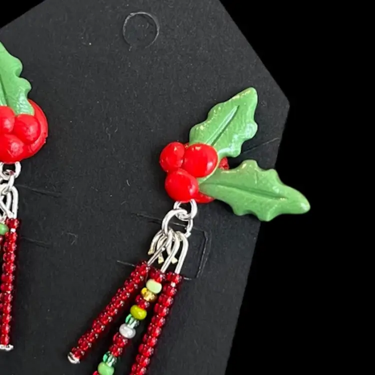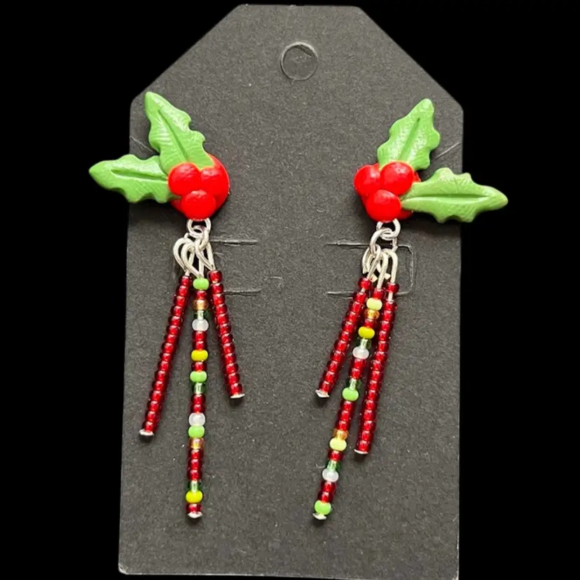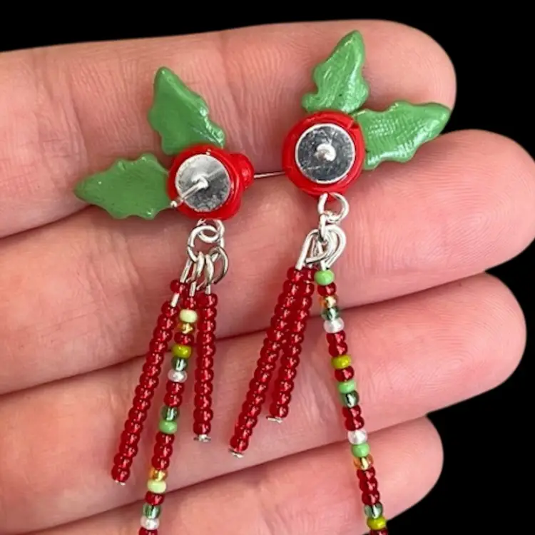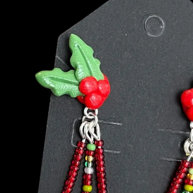 Handmade By Me - Polymer Clay Holly Berry Earrings With Red & Green Seed Bead Tassel, Handmade Christmas Earrings, Made By NN Artist, Handmade Christmas Accessories