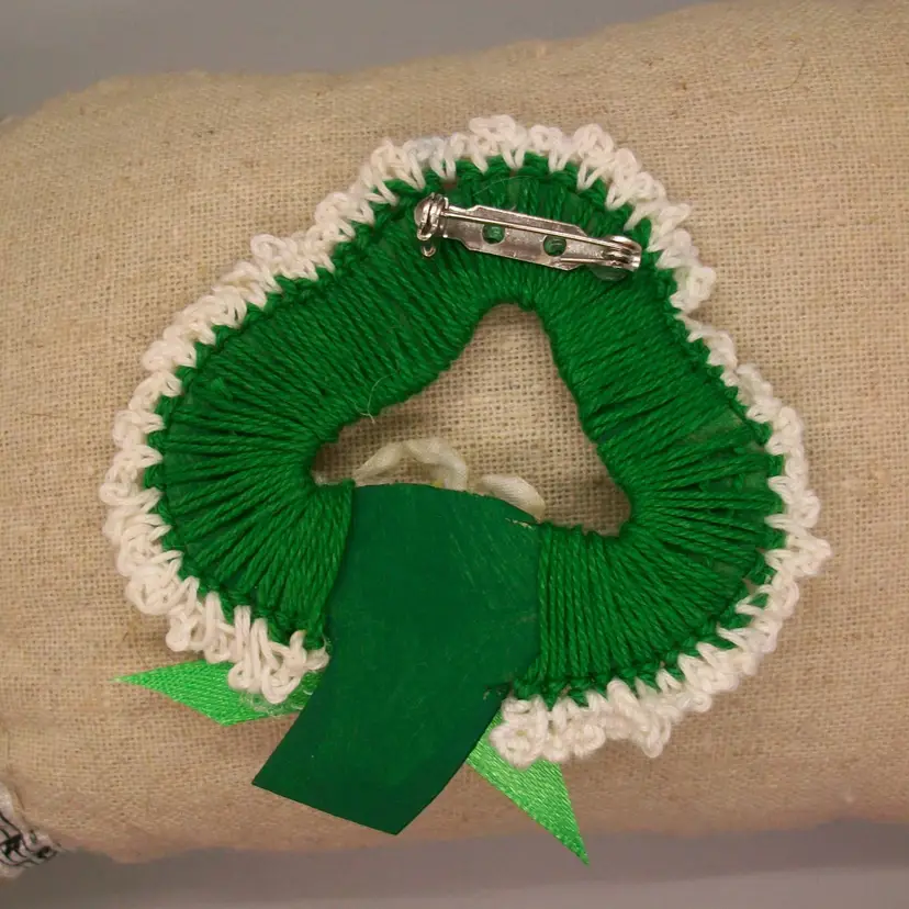 Crochet green thread shamrock over painted green card stock white lace trim green satin bow pearl bead accents White silk flowers standard bar pin back measures 3"w x 2.75" tall