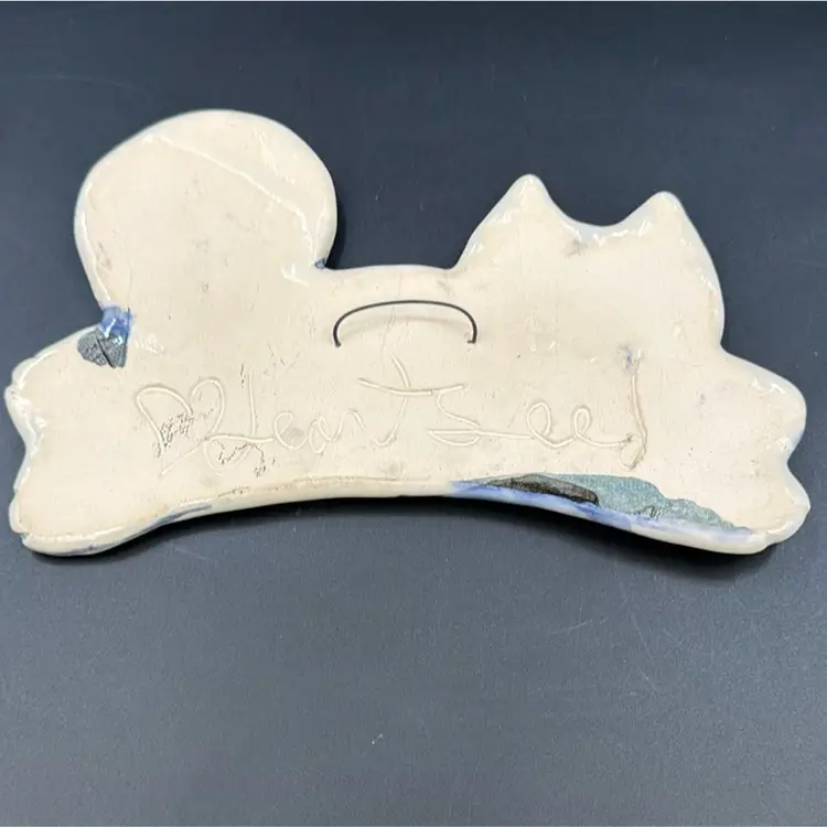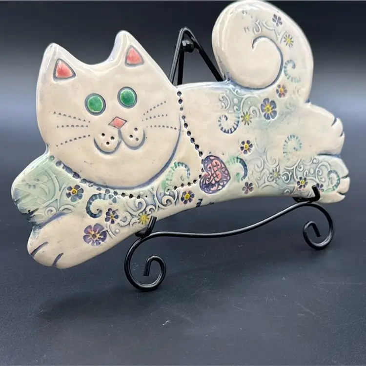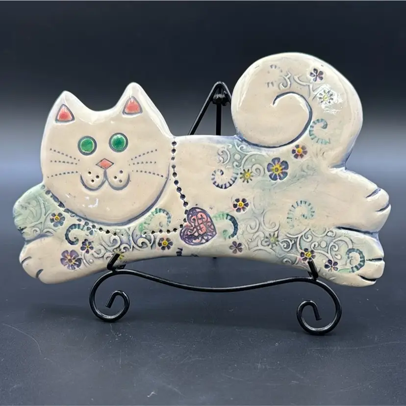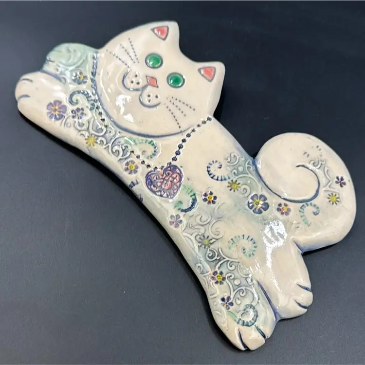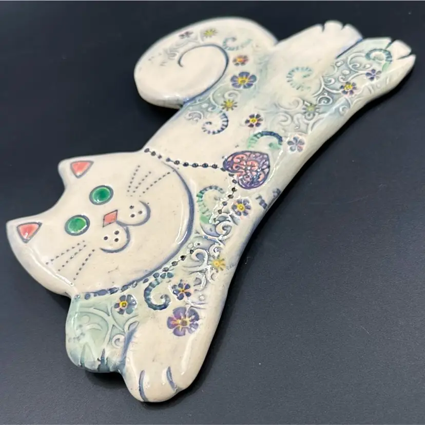 8”L 41/4”T no chips, cracks or brakes, and it has a built-in hanger hand made kitty with lots of fun colors