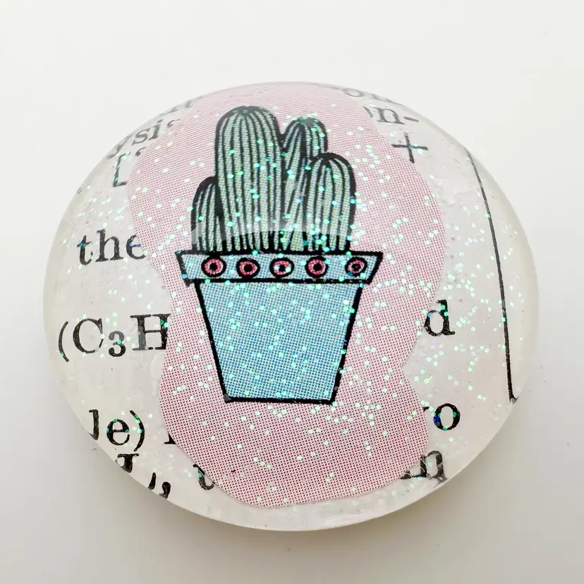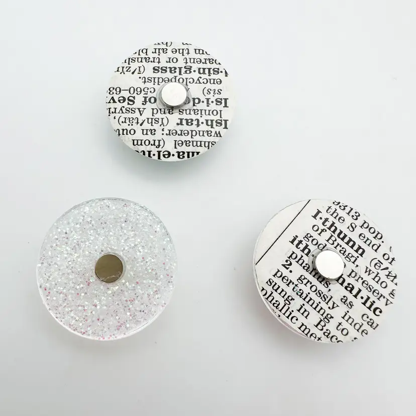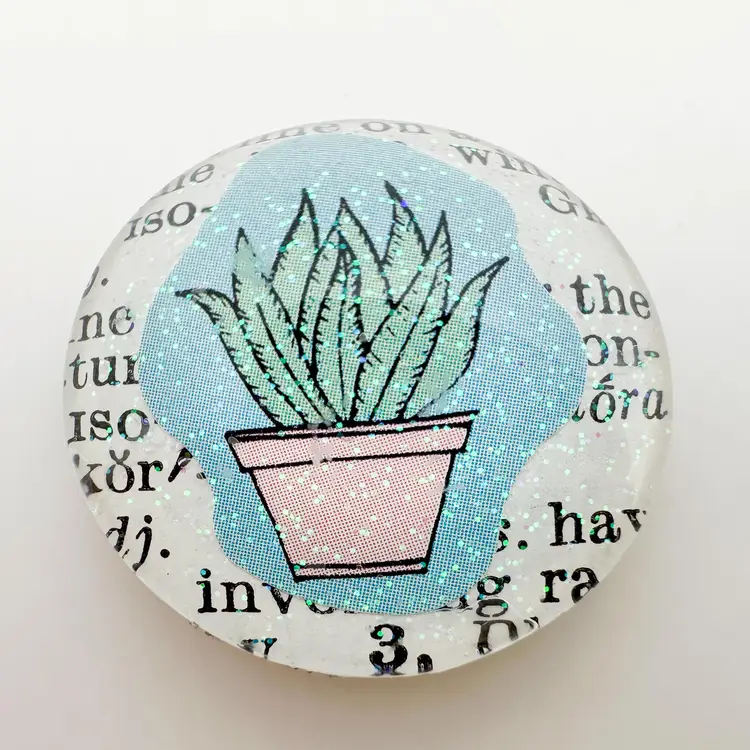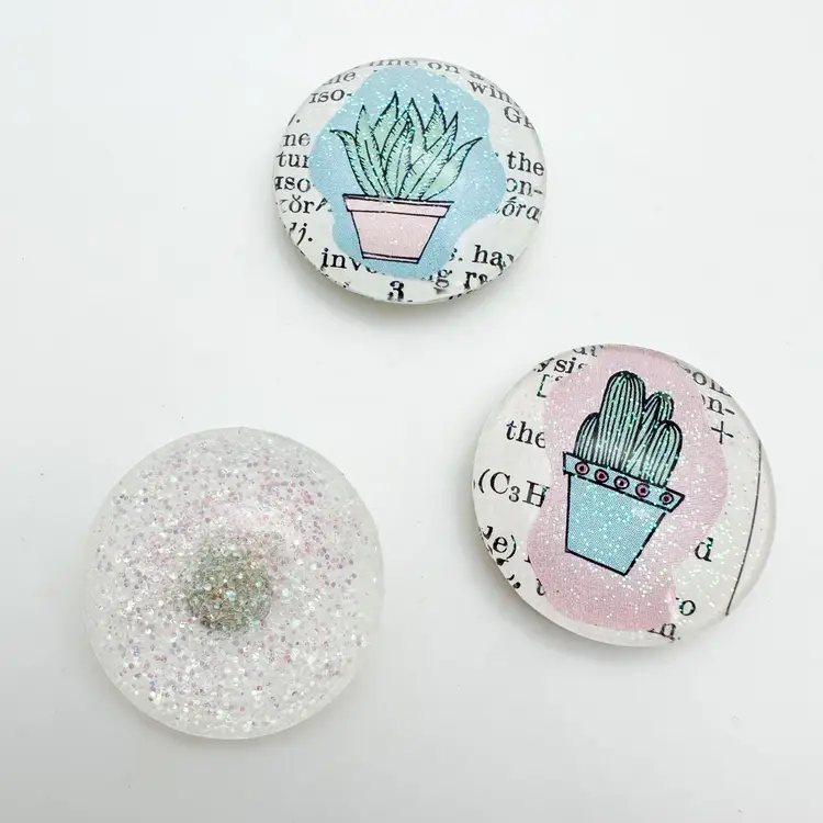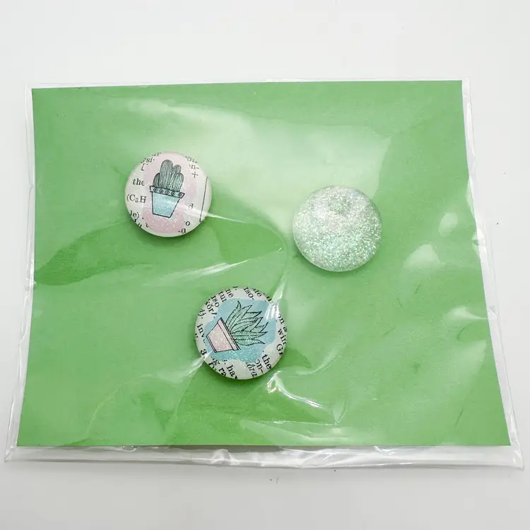 3 piece magnet set, handmade. Includes two succulent designs on vintage book pages and one glittery green design. Approximately 1" diameter each. Strong, small magnets attached on back. Perfect for adding a touch of greenery to your fridge or any metal surface.