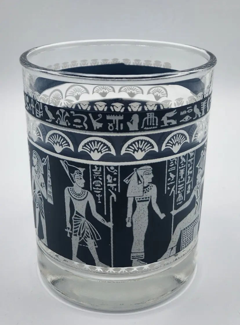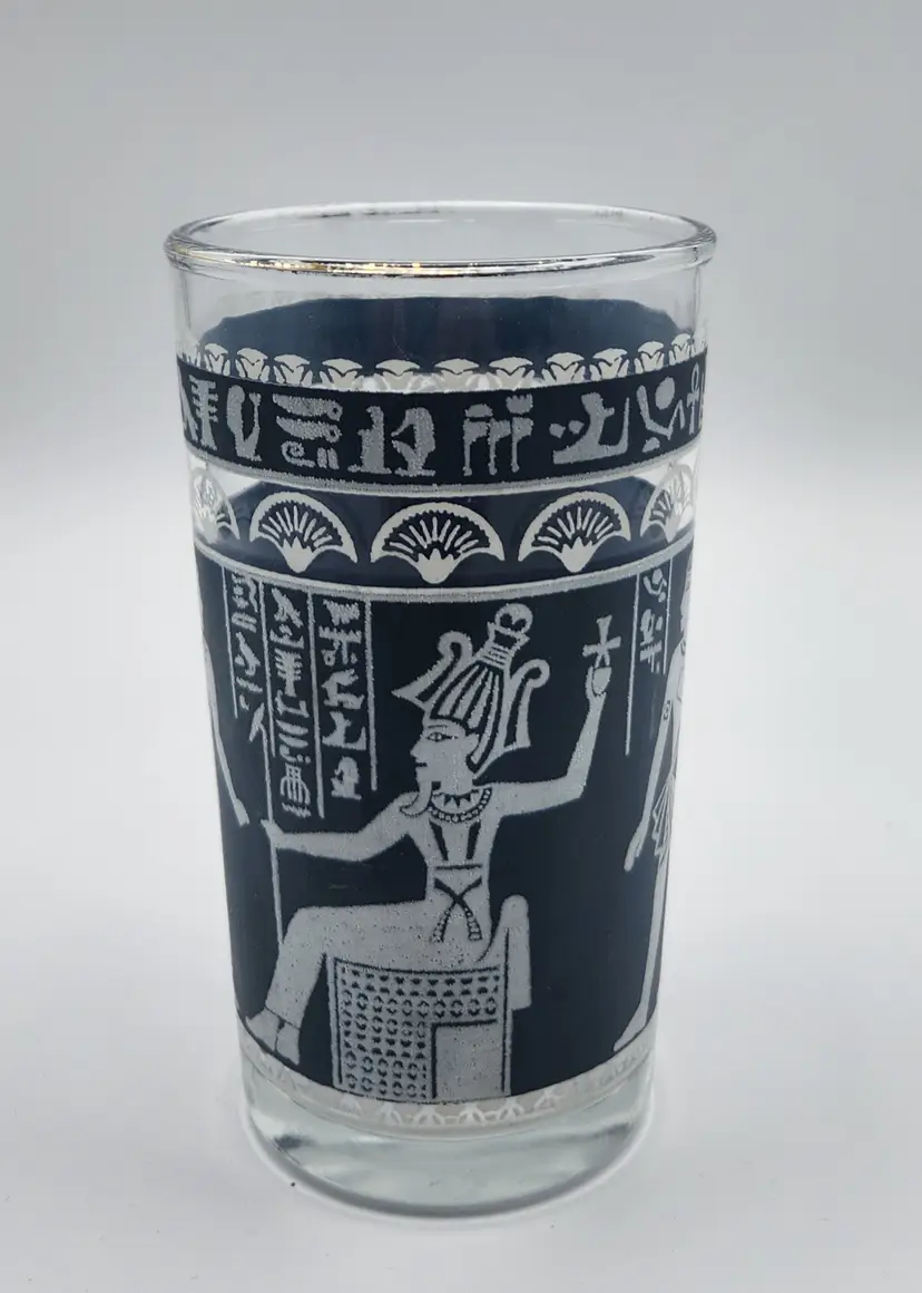 Lot of 3 vintage Hazel Atlas Egyption Revival glasses. Lot contains a tumbler glass 5" tall, a juice glass 4 inches tall, and a whiskey glass 3.5" tall. All show light wear.