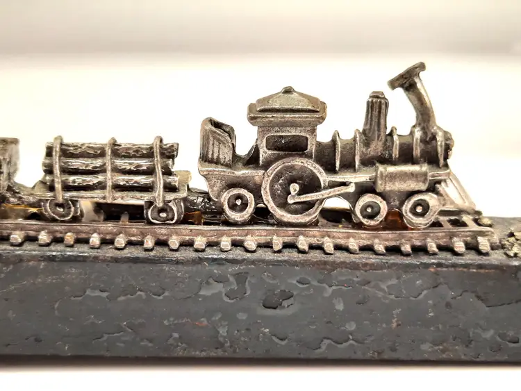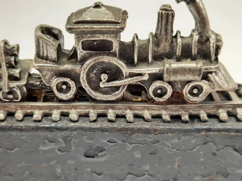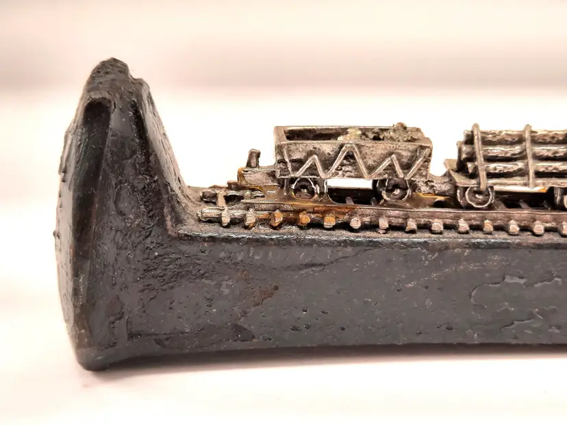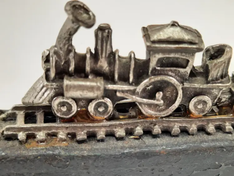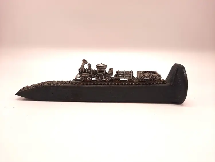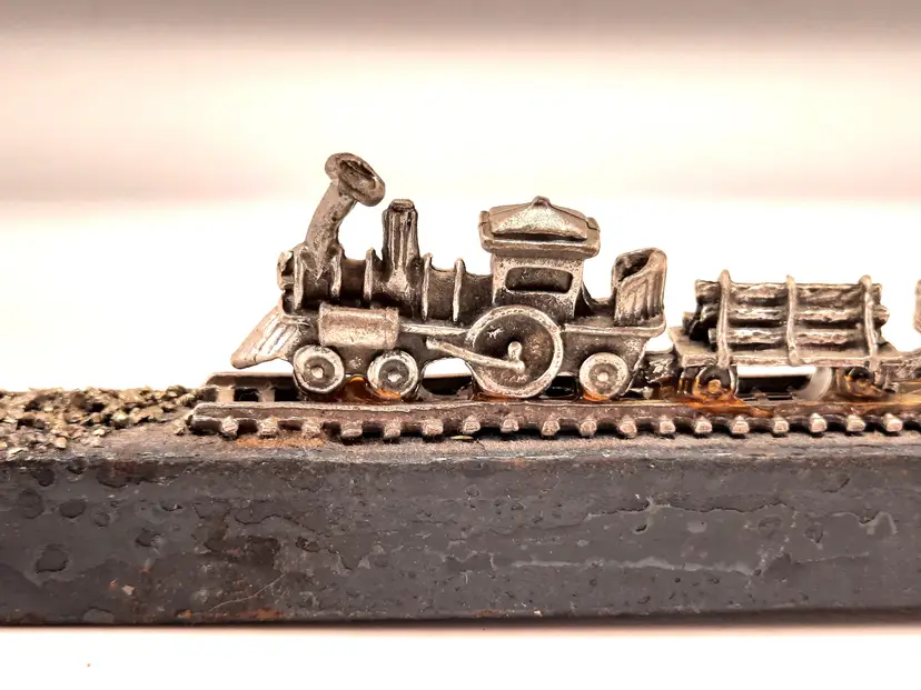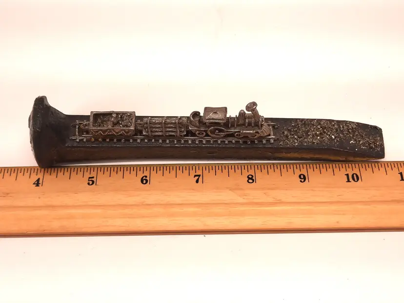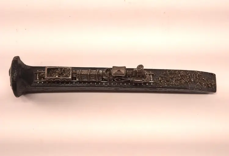 HC Railroad Spike with a mini pewter train and fools gold glued onto it. Spike measures 6.75" long. You can see some of the glue showing under the train. see pics for more info. cute little piece of decor. thanks!