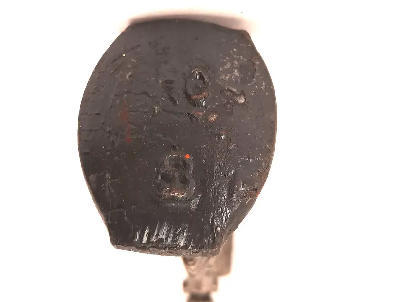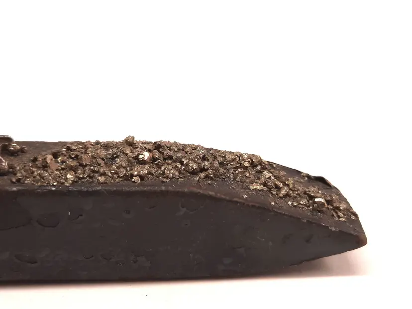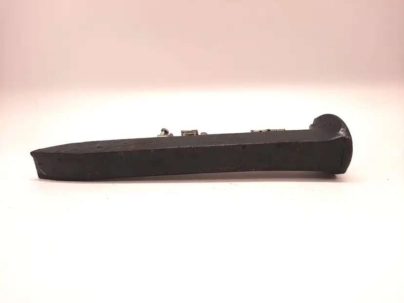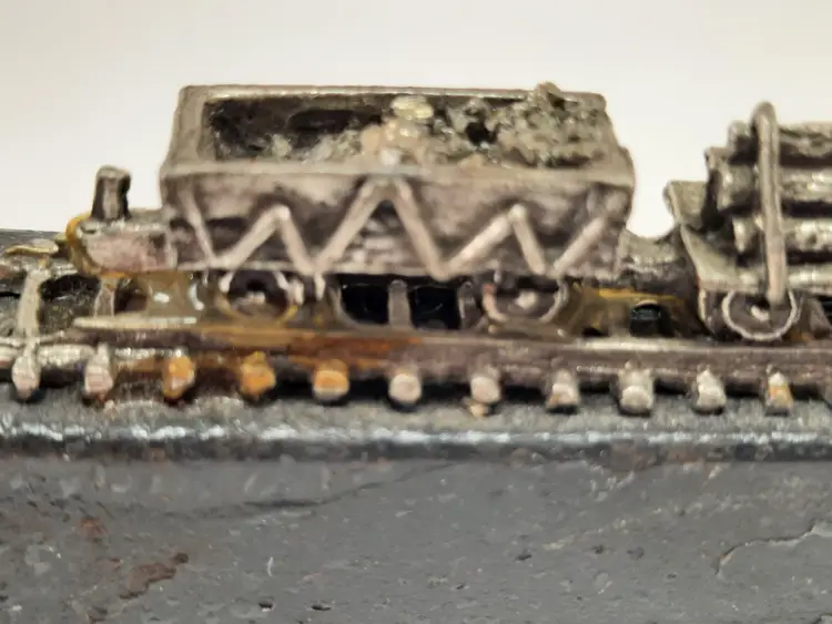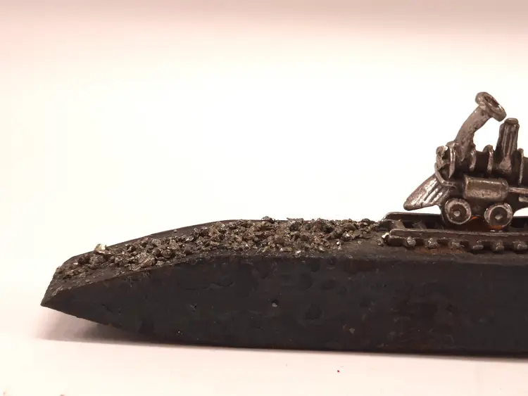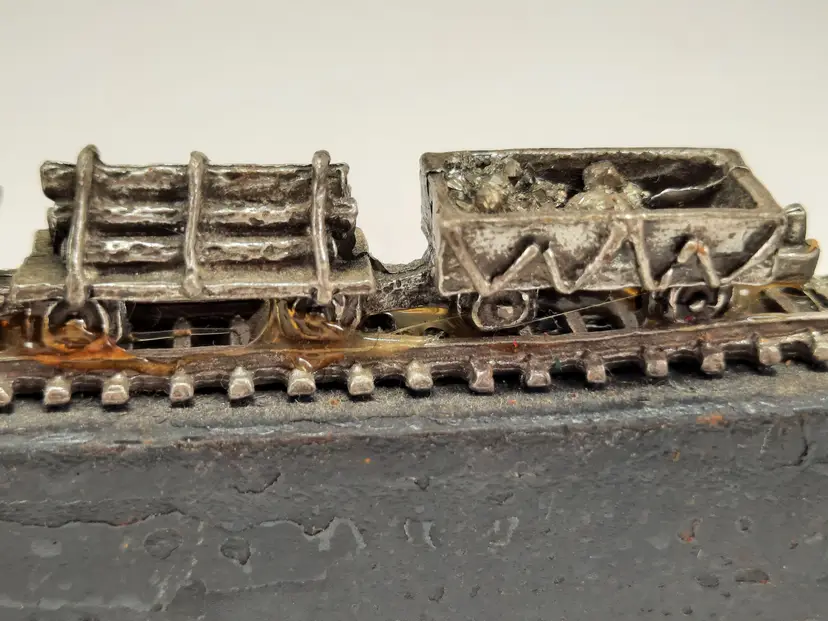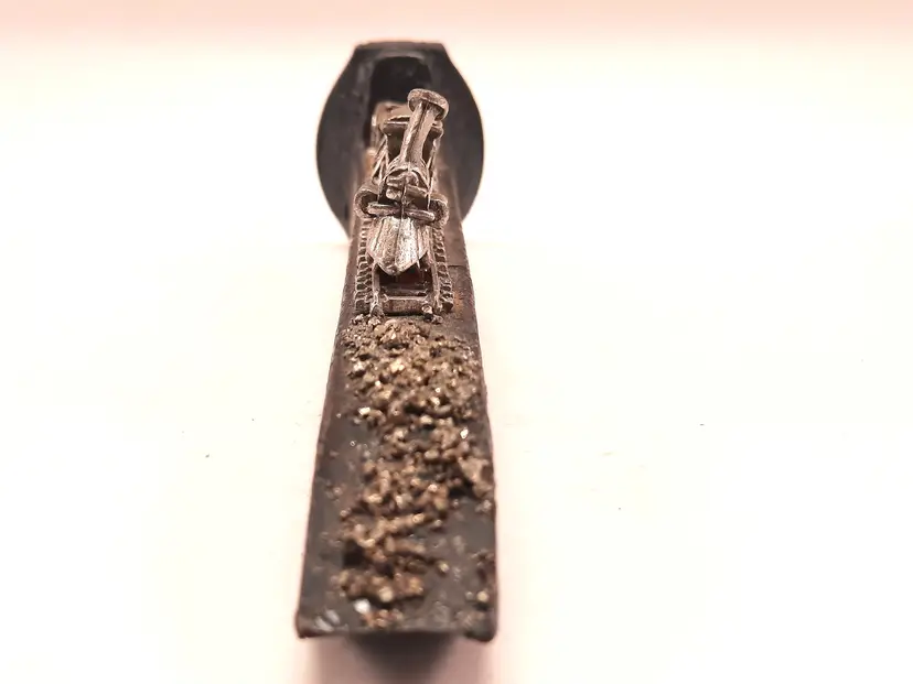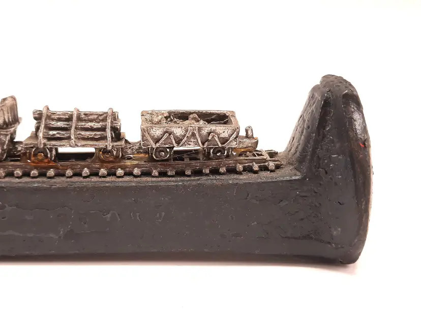 HC Railroad Spike with a mini pewter train and fools gold glued onto it. Spike measures 6.75" long. You can see some of the glue showing under the train. see pics for more info. cute little piece of decor. thanks!