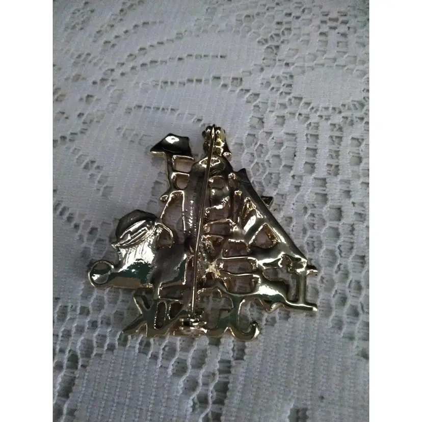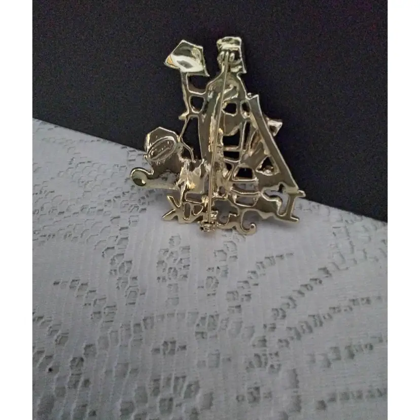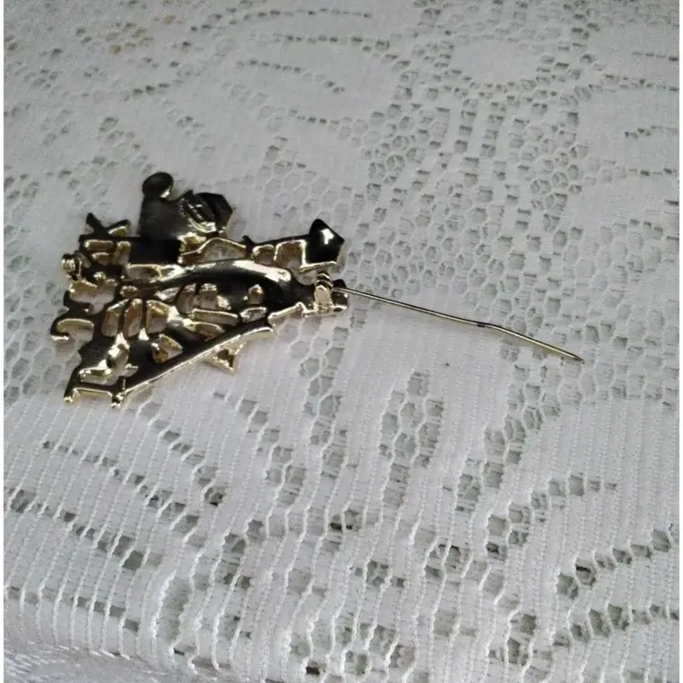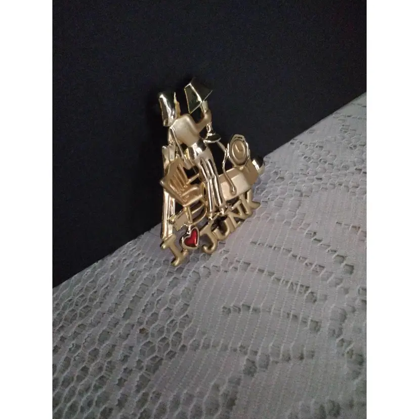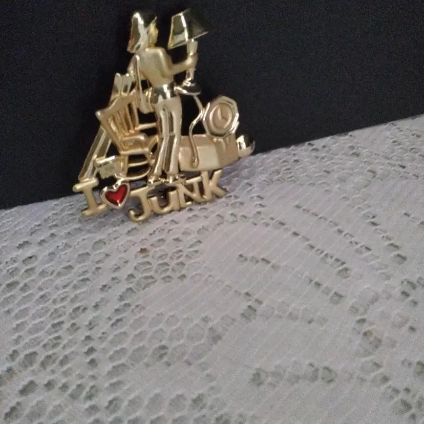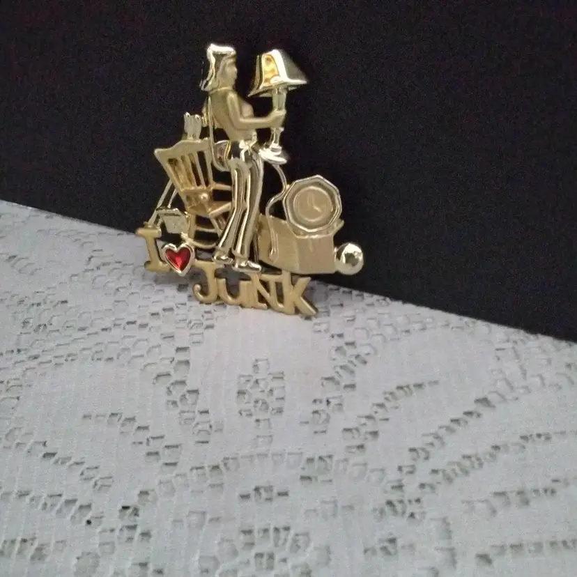 I Love Junk Brooch/Pin Stainless Steel. Has a red rhinestone heart. It is gold colored. Shiny and Matte finish. Has a claw clasp closure. It is in good condition with exception of pin on back is slightly bent and has a little discoloration. Measurements are 2 inches x 2 inches.