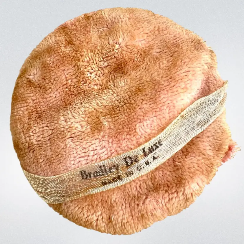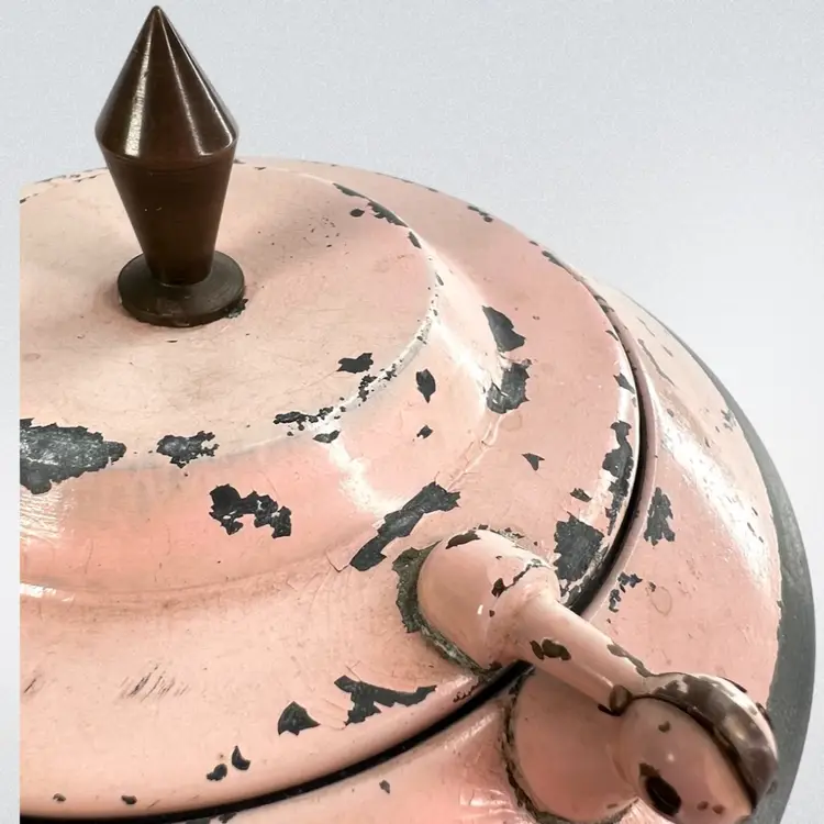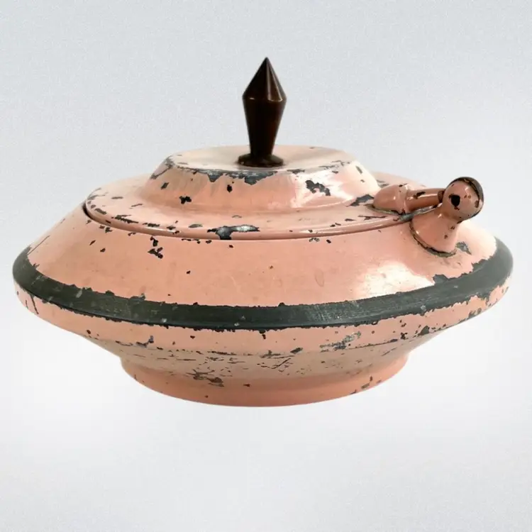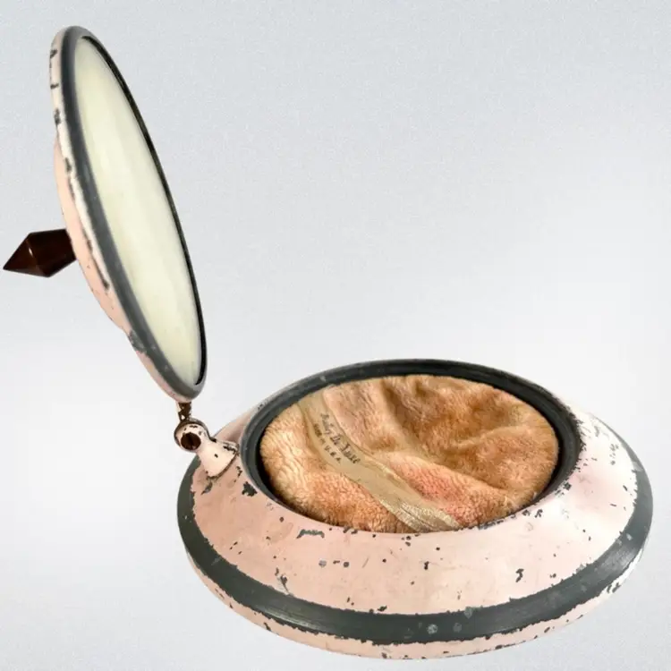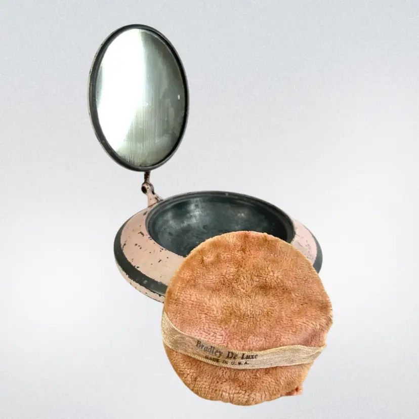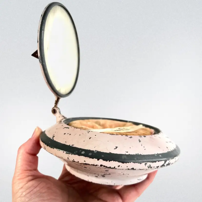This would look great on a vanity Metal Cosmetic Powder Compact Chippy Pink Paint π©· UFO πΈ shaped Fabulous finial on top Great hinge Mirror inside lid Bradley De Luxe Marked Powder Puff- used; but we washed it; seams coming apart a little No cosmetic powder Vintage - Is it Mid-Century? Lightweight 11 ounces 6-3/8β D x 3β H Condition: Paint loss as shown, Mirror Intact and little hazy (see photo with puff reflection, Puff has seams coming apart & has old makeup stains on it