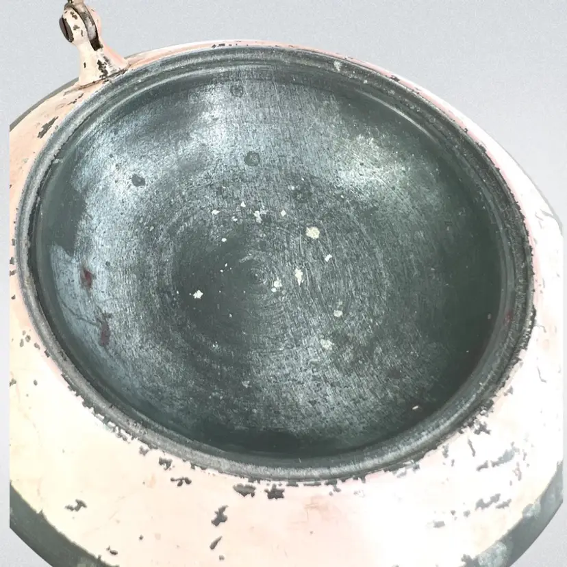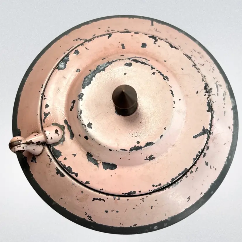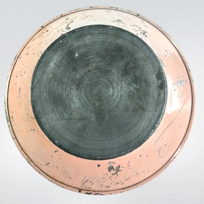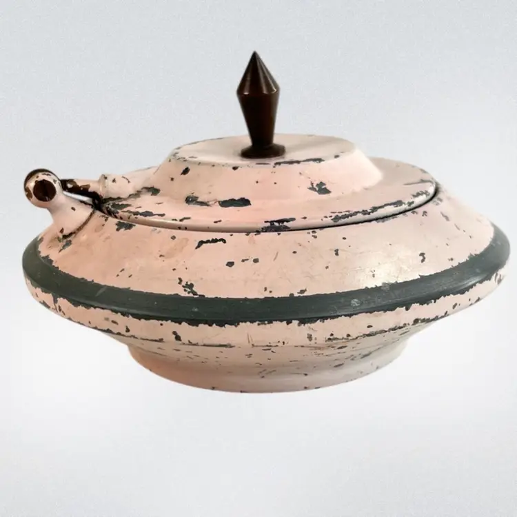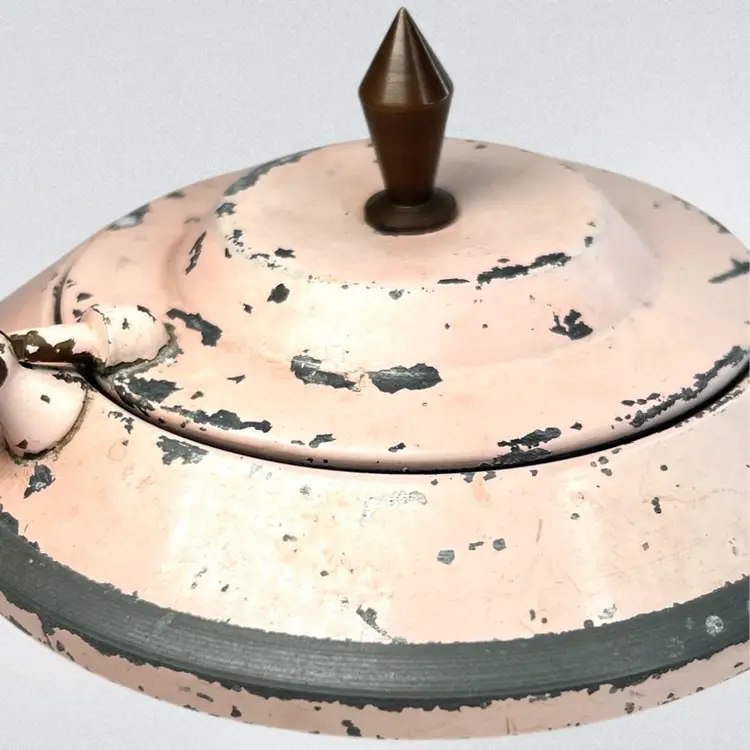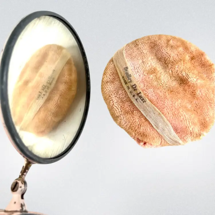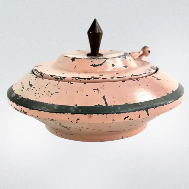 This would look great on a vanity Metal Cosmetic Powder Compact Chippy Pink Paint π©· UFO πΈ shaped Fabulous finial on top Great hinge Mirror inside lid Bradley De Luxe Marked Powder Puff- used; but we washed it; seams coming apart a little No cosmetic powder Vintage - Is it Mid-Century? Lightweight 11 ounces 6-3/8β D x 3β H Condition: Paint loss as shown, Mirror Intact and little hazy (see photo with puff reflection, Puff has seams coming apart & has old makeup stains on it