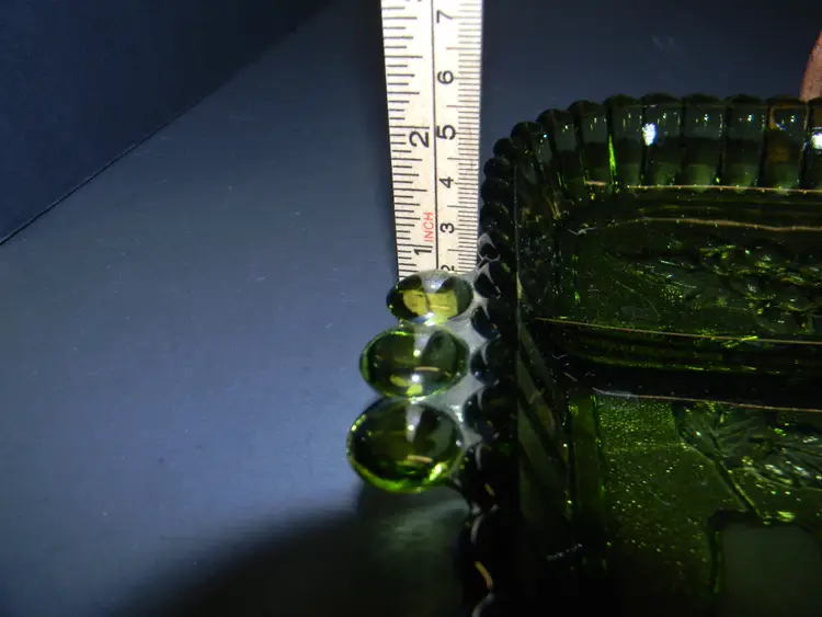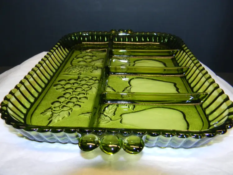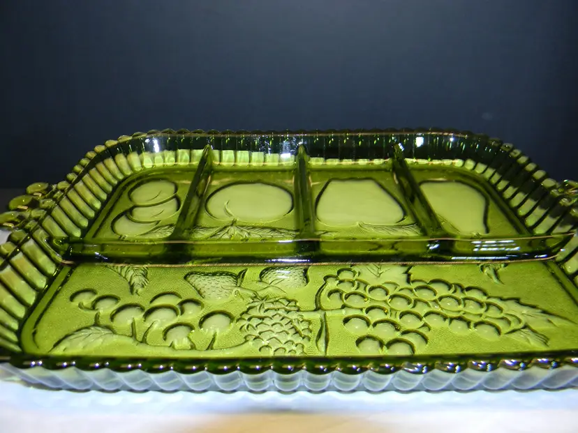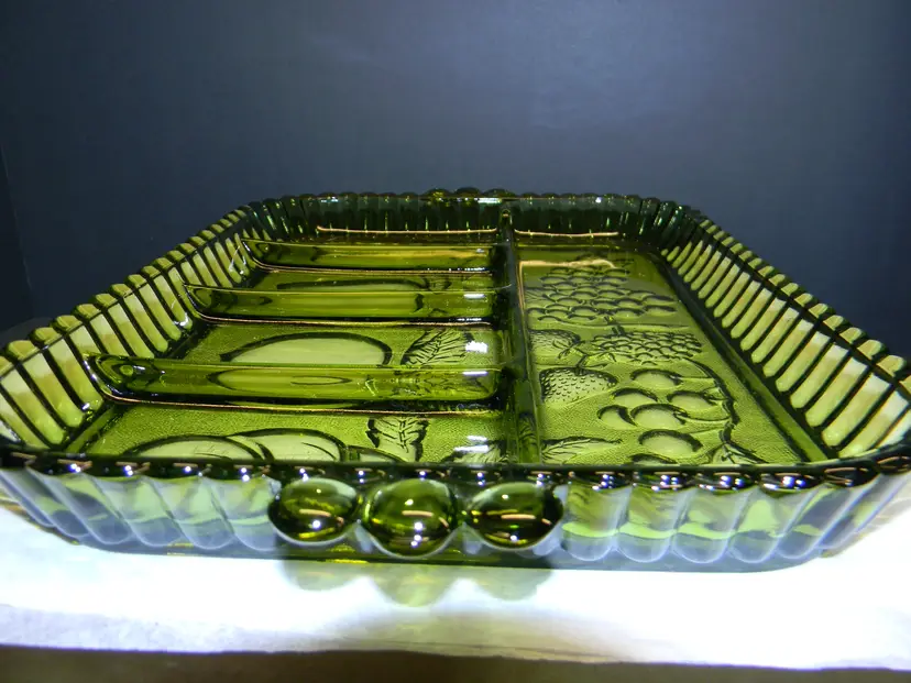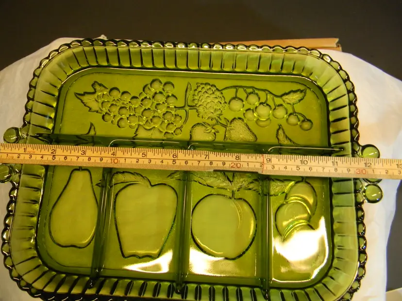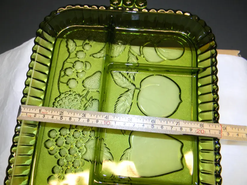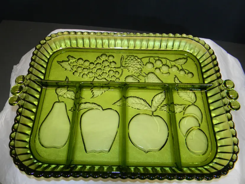 Features a five part divided dish with fruit motifs, Olive green in color No chips or cracks used condition ( 12 1/2" L x 8 3/4" W x 3/4" H) see photos The difference in computer monitors actual colors may vary slightly from those shown