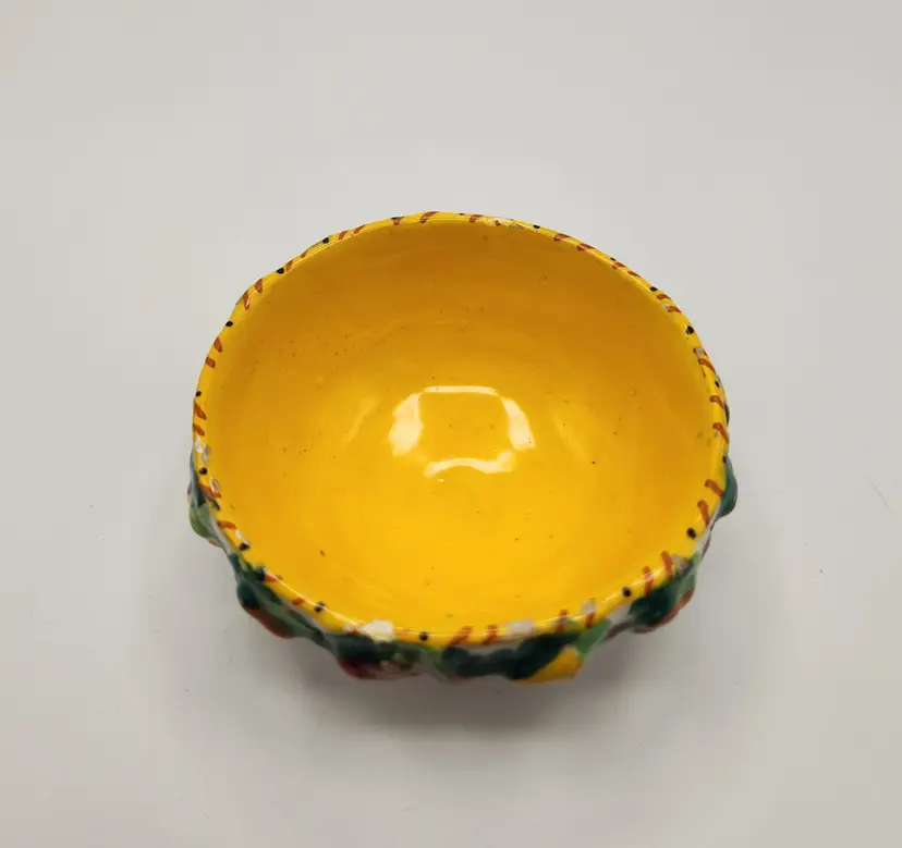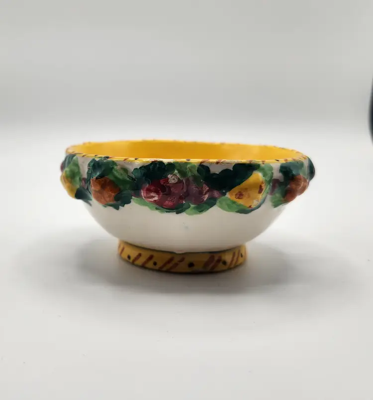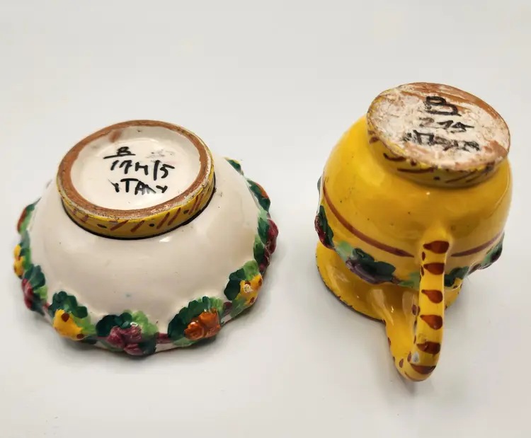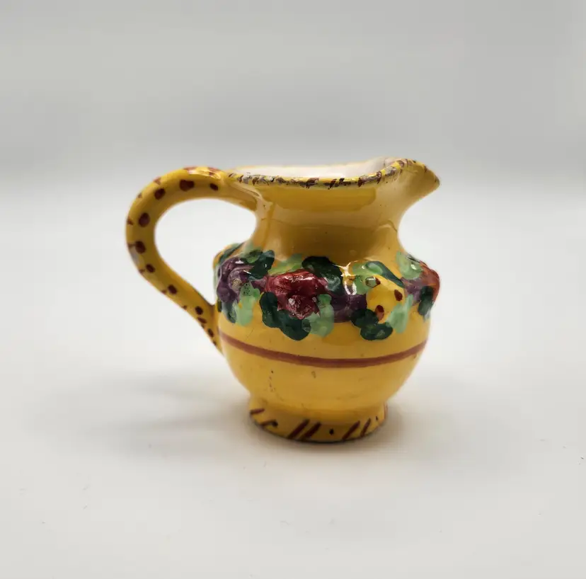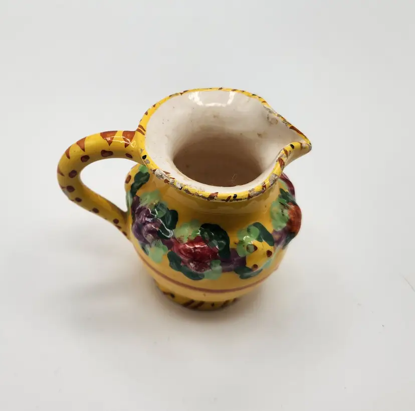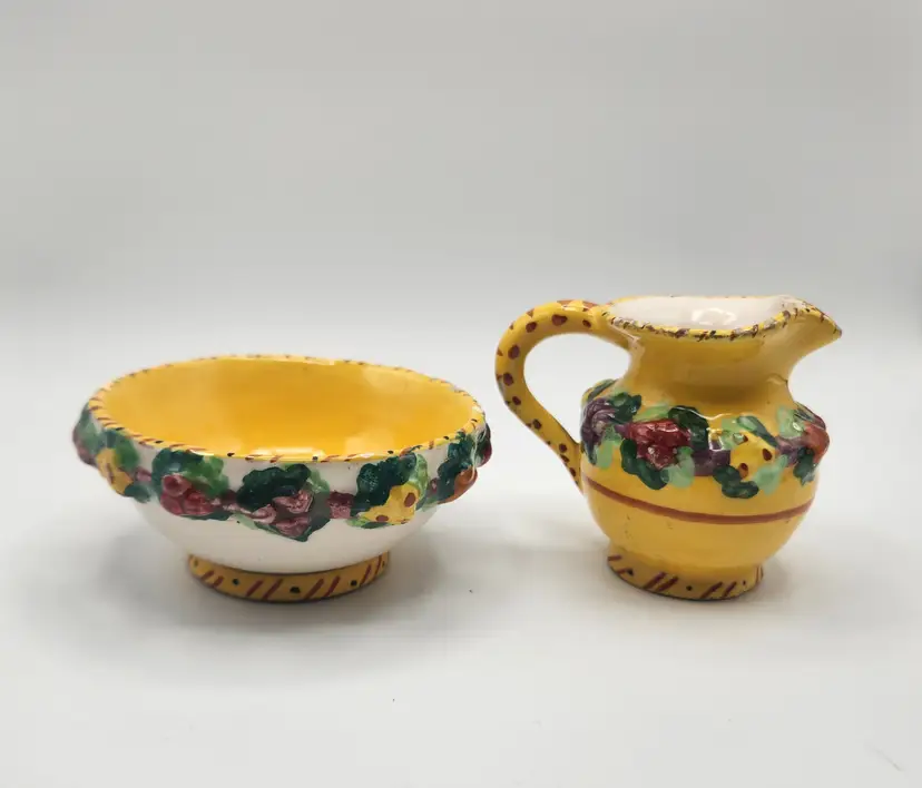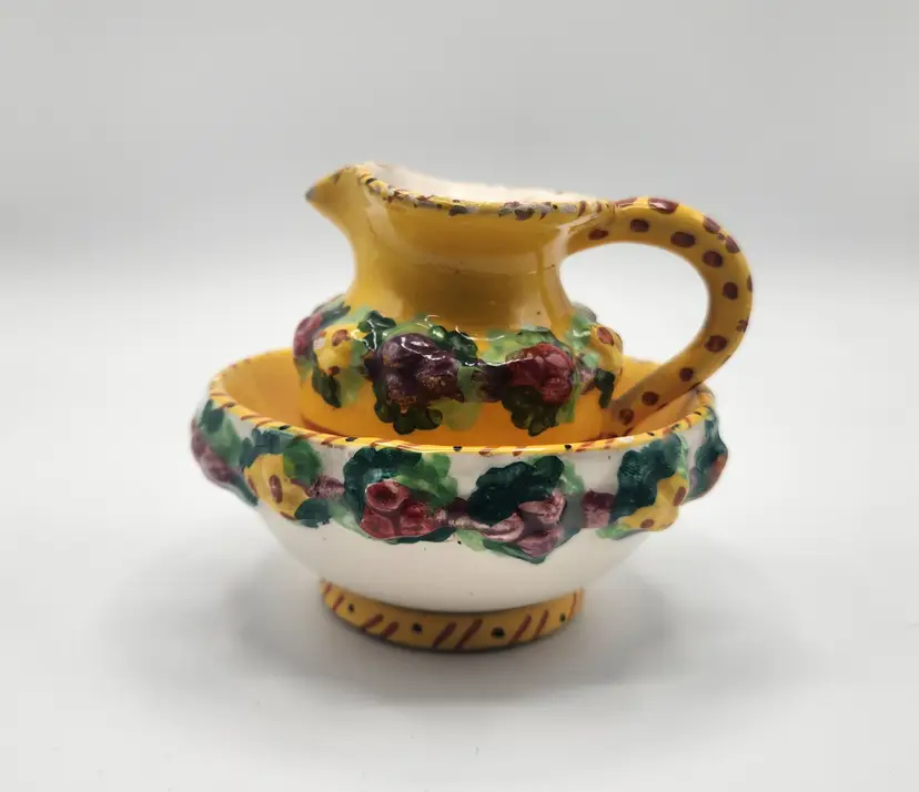 Vintage Italian majolica-style miniature pitcher and bowl set. This set does show its age and has chipped glaze along the rim and handle. Bowl - 3.5"W x 1.5"H Pitcher 2.5" H x 3" W